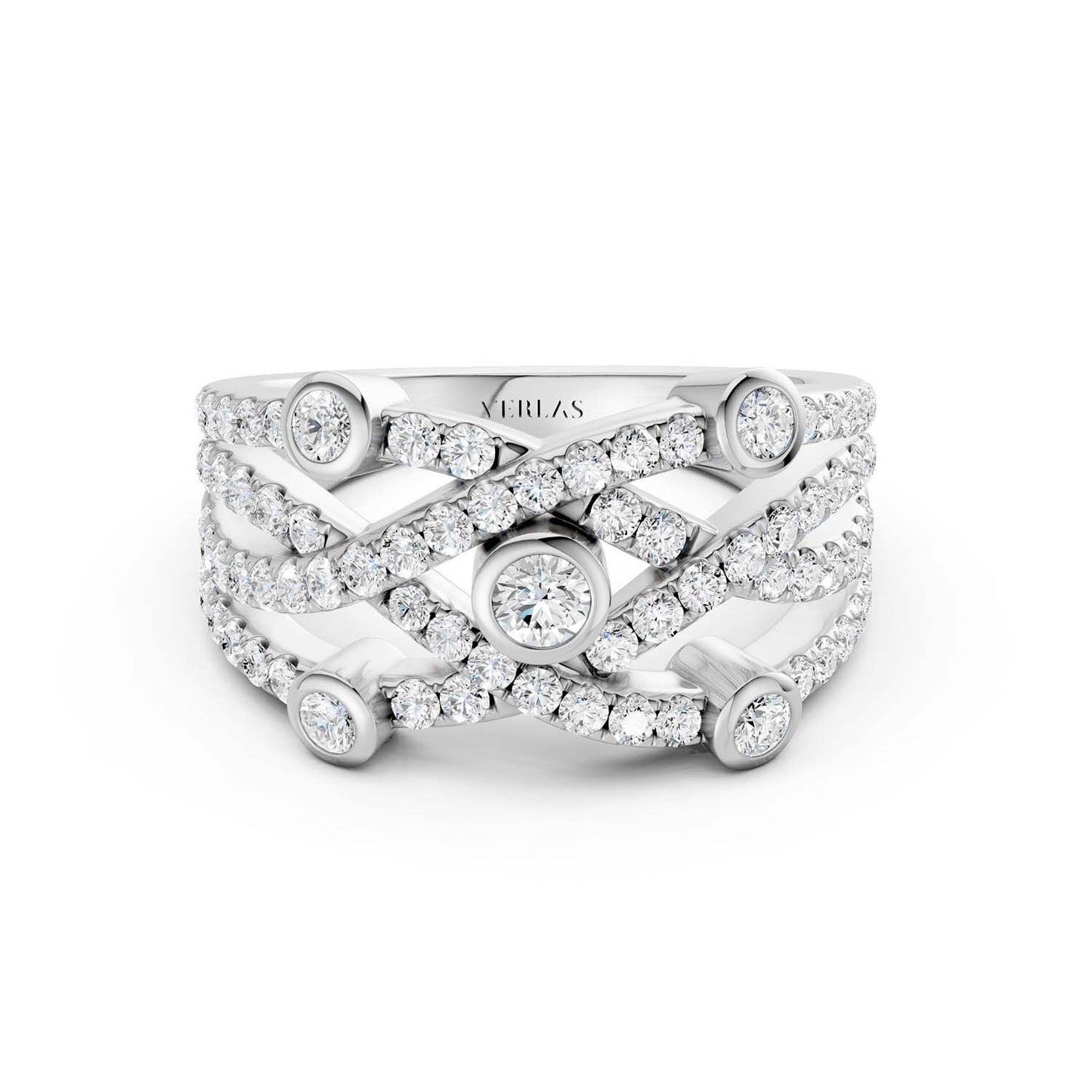 This 3 Cross-Tier Smitten Ring features a remarkable cross-tier design where larger round diamonds take center stage within the center space of the tiers. This innovative arrangement adds a layer of sophistication to the ring, creating an eye-catching focal point that's sure to draw admiration. It strikes a perfect balance between boldness and subtlety, making it an ideal choice for those seeking a stacking diamond ring.