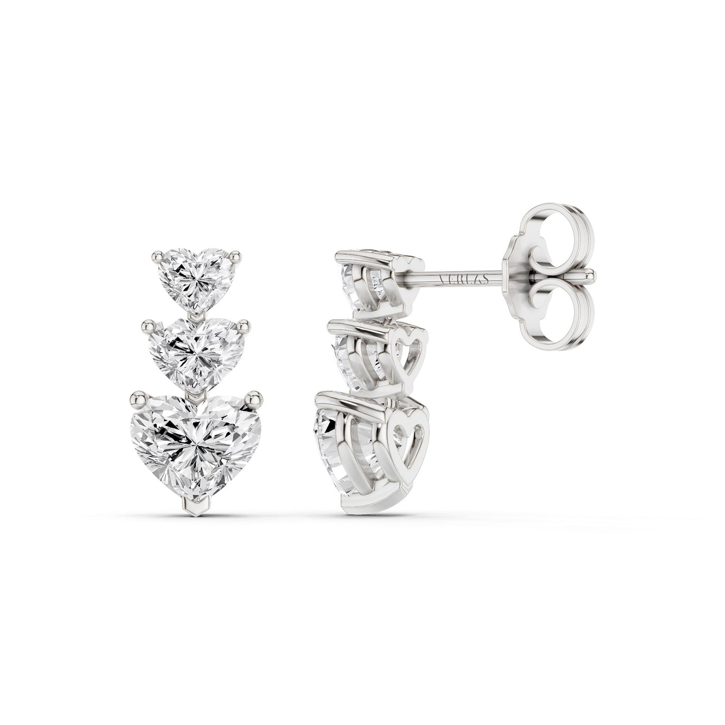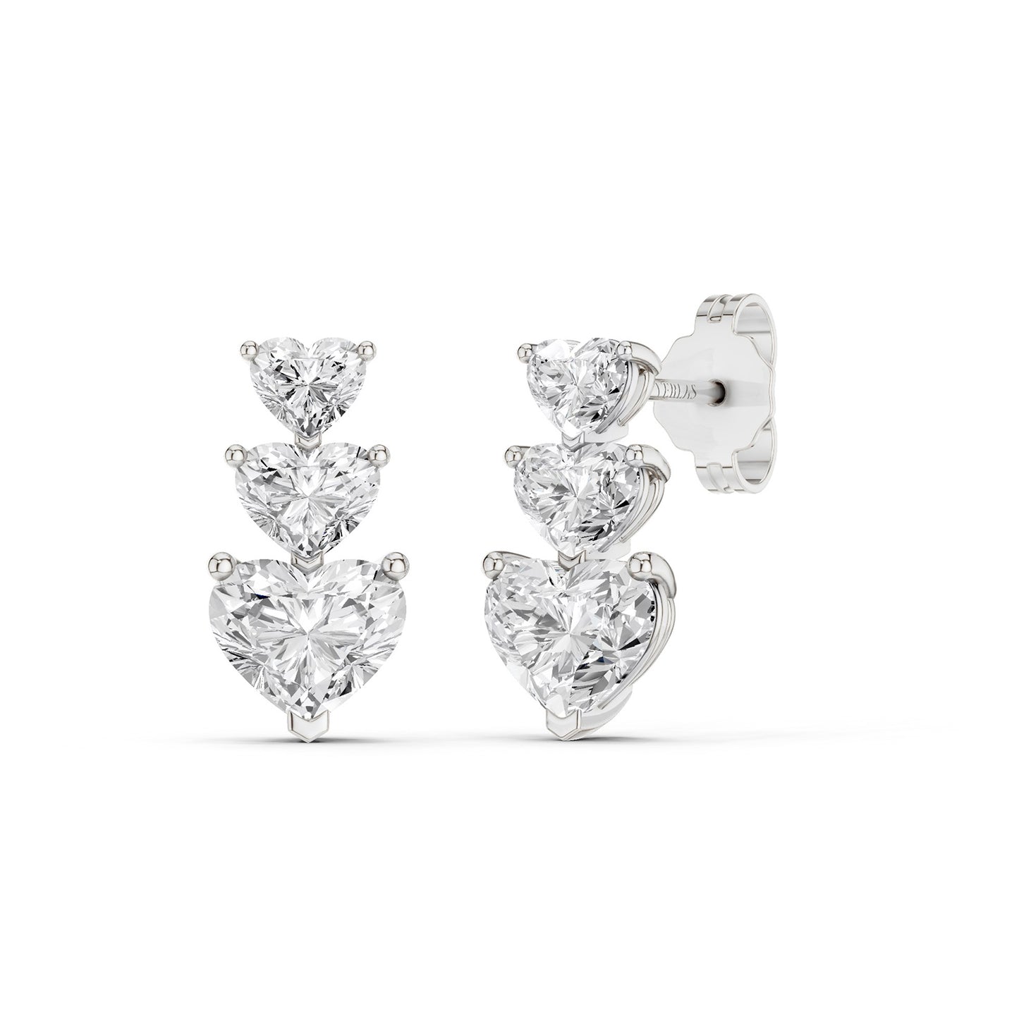 Elevate your elegance with the 3-Stone Graduated Heart Drop Earrings, featuring three heart-shaped lab-grown diamonds in a stunning graduated design. Set in secure prong settings, each diamond grows in size, symbolizing the journey of love and adding timeless charm to your look.