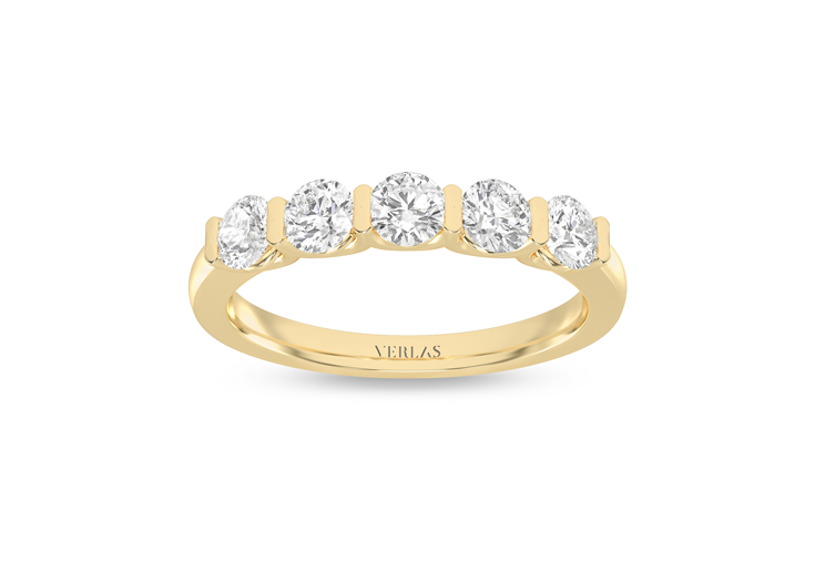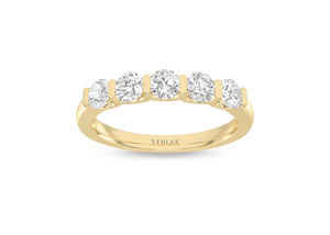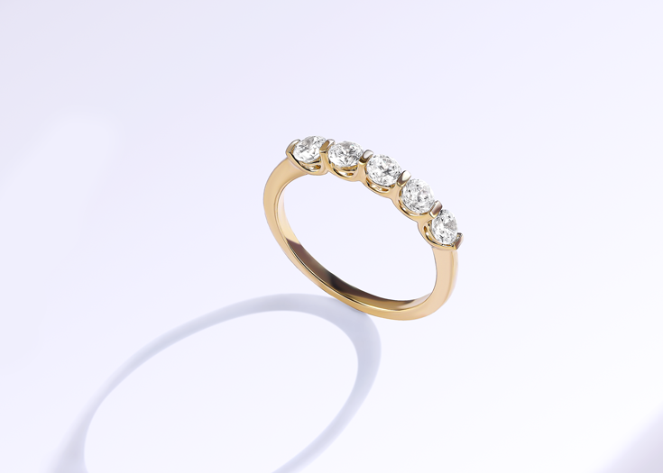 The 5-Stone Keepsake Round Vows ring is a celebration of eternal love. With five brilliant round diamonds set in a sleek solid gold band, this ring is a stunning representation of the journey you've embarked on together. Its timeless design and impeccable craftsmanship make it a true keepsake to cherish for a lifetime.