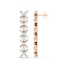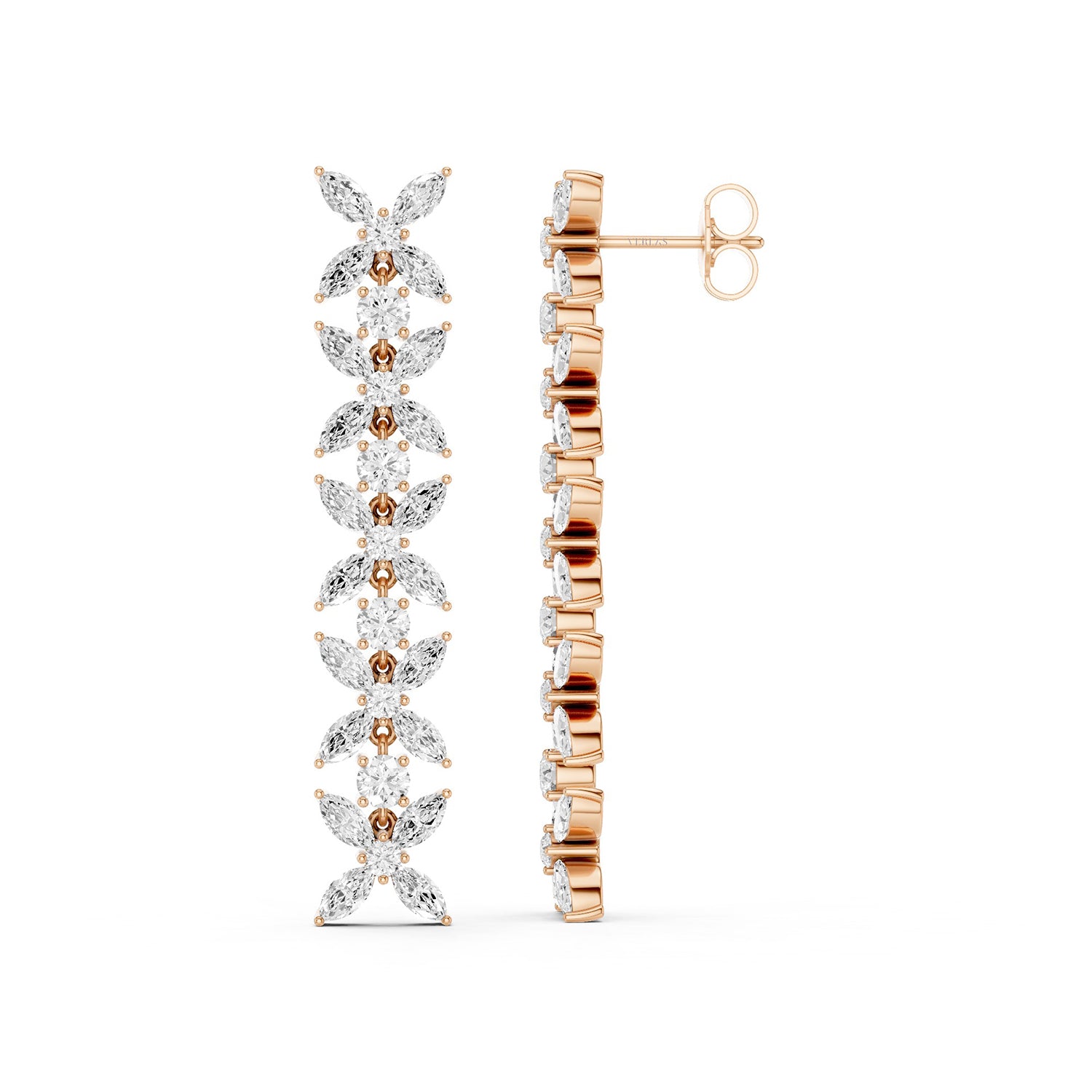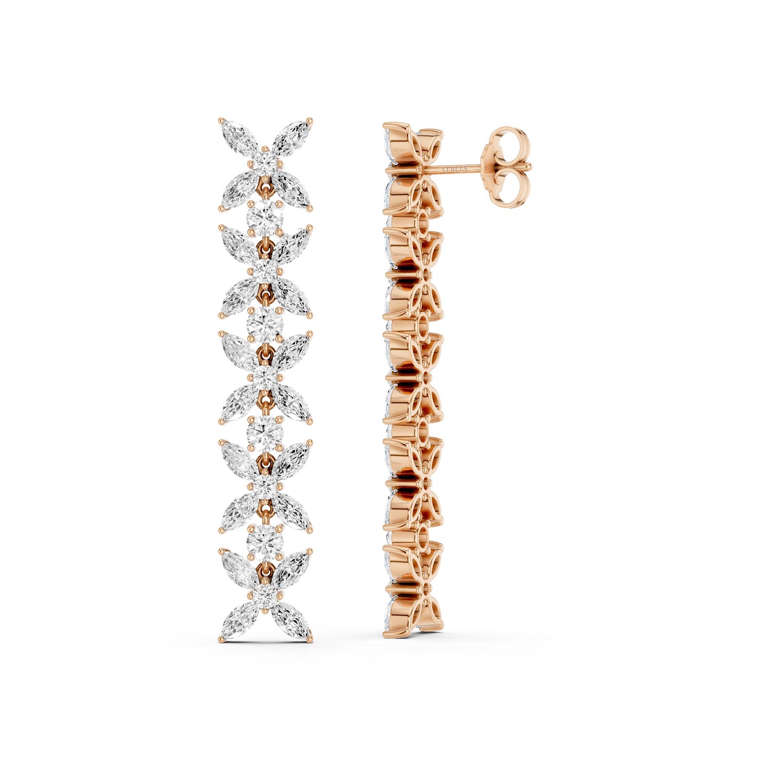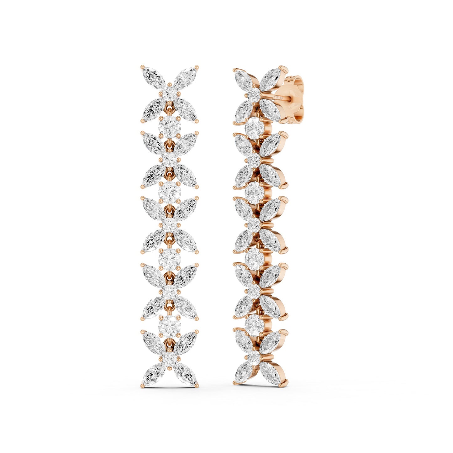 Unveil your inner radiance with the Alyssa Marquise cascading Dangler Earrings. These exquisite earrings are adorned with five diamond florets, each crafted with marquise diamond petals and a round diamond at the center. Set within a flexible gold garland, the diamonds create a stunning cascade that catches the light with every movement. The lustrous lab-grown diamonds shimmer down the garland like a meteor shower, adding a dazzling touch to your presence. As they sway gently, these diamond earrings captivate attention, making them the perfect accessory to elevate any evening look with elegance and flair.
