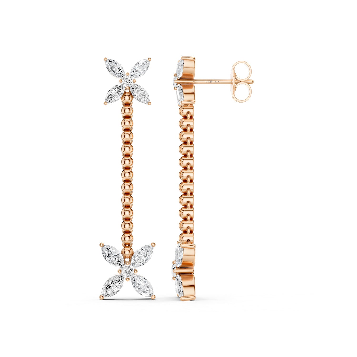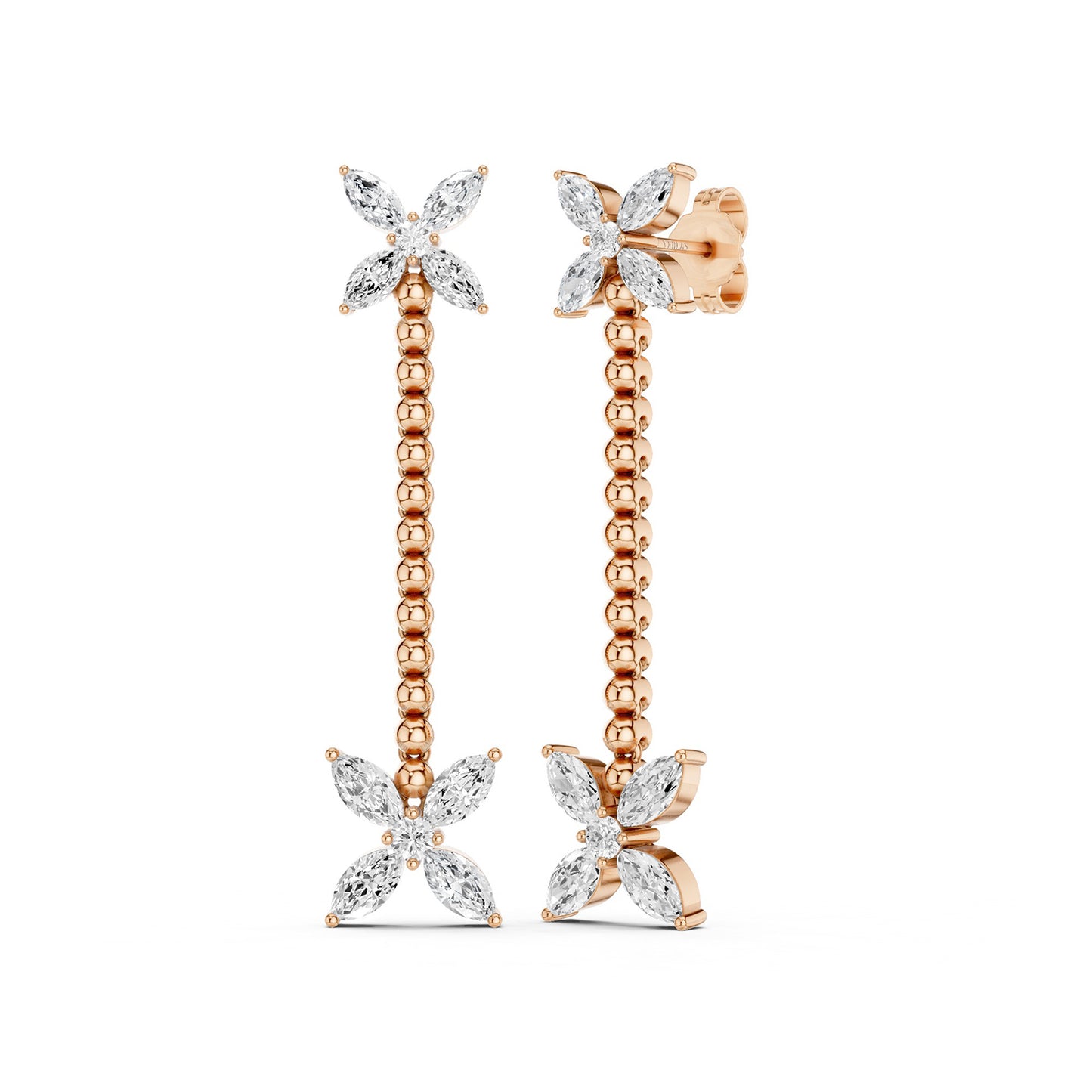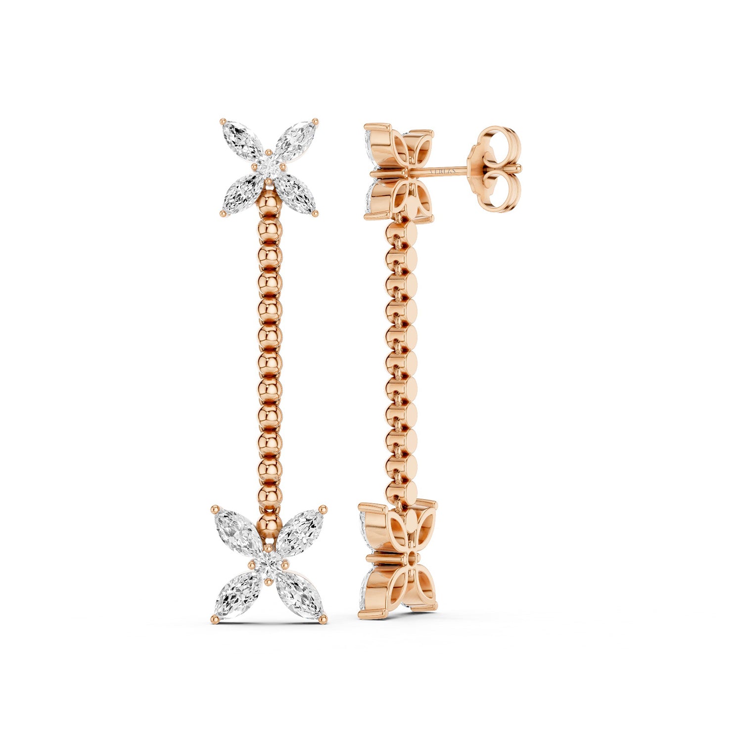 Make a striking impression with the Alyssa Marquise Dangler Drop Earrings, where elegance meets playful charm. Each earring is adorned with two stunning diamond florets, crafted with four marquise diamond petals surrounding a brilliant round diamond at the center. These lustrous diamonds dazzle like a meteor shower, shimmering with every movement. The dangling design is completed with interlocked gold beads that connect the two florets, creating a beautiful garland effect. Perfect for those who love to captivate and enchant, these diamond earrings add a touch of sparkle and joy to any occasion.