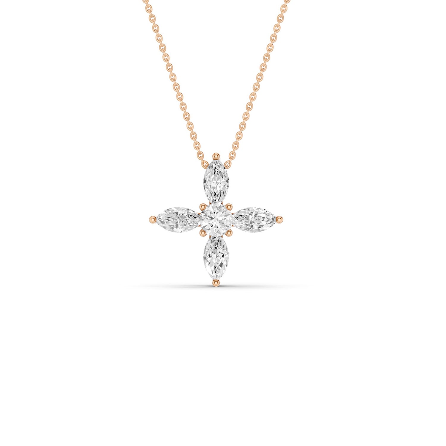 Discover the captivating elegance of the Alyssa Marquise Pendnat Necklace, where sustainable luxury meets timeless design. Crafted with precision, this diamond pendant necklace features marquise-cut lab-grown diamonds in a dynamic X-shaped pattern. Each petal's radiant sparkle enhances the round lab-grown diamond at the center, creating a harmonious blend of sophistication and modern design. This necklace is ideal for those who value both exquisite craftsmanship and ethical choices in their jewelry.