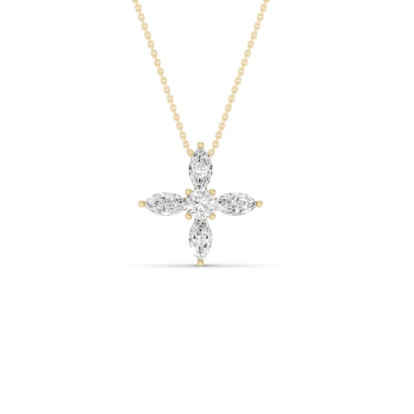 Discover the captivating elegance of the Alyssa Marquise Pendnat Necklace, where sustainable luxury meets timeless design. Crafted with precision, this diamond pendant necklace features marquise-cut lab-grown diamonds in a dynamic X-shaped pattern. Each petal's radiant sparkle enhances the round lab-grown diamond at the center, creating a harmonious blend of sophistication and modern design. This necklace is ideal for those who value both exquisite craftsmanship and ethical choices in their jewelry.