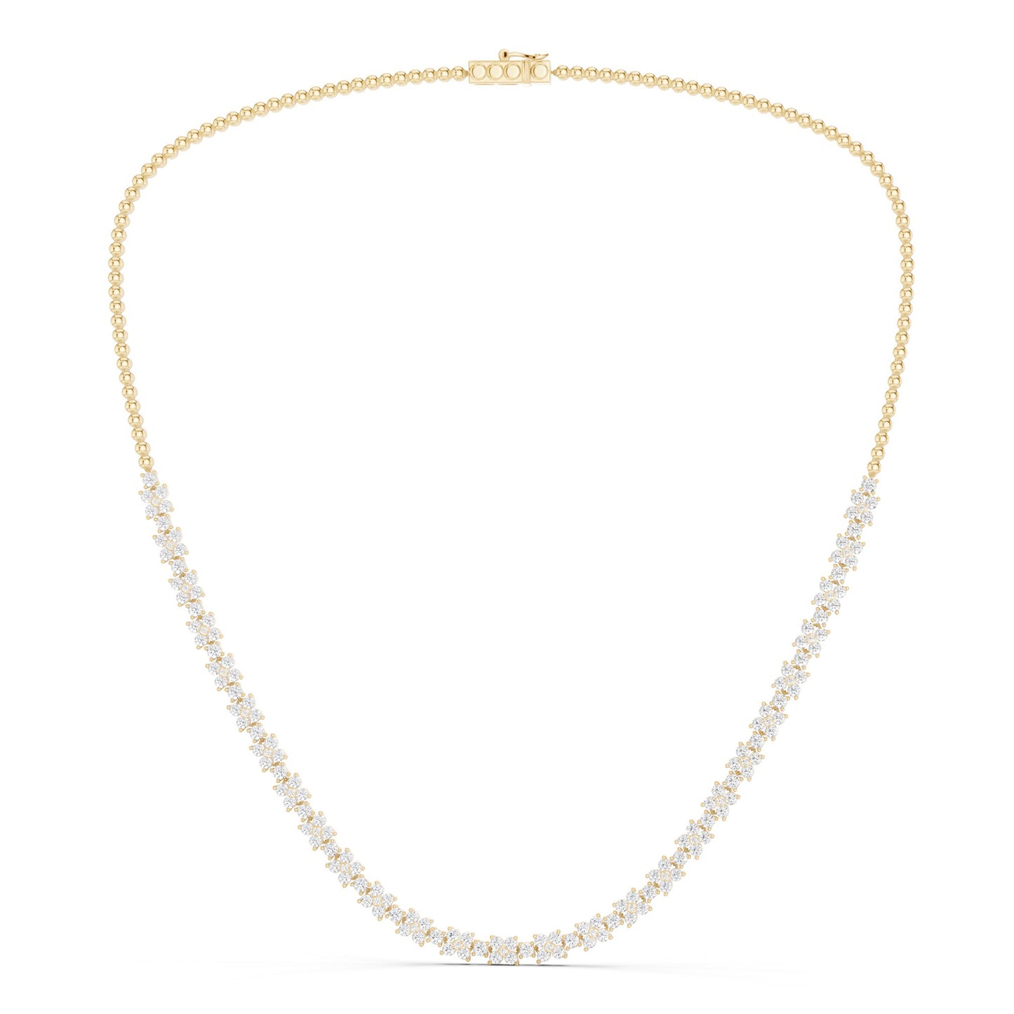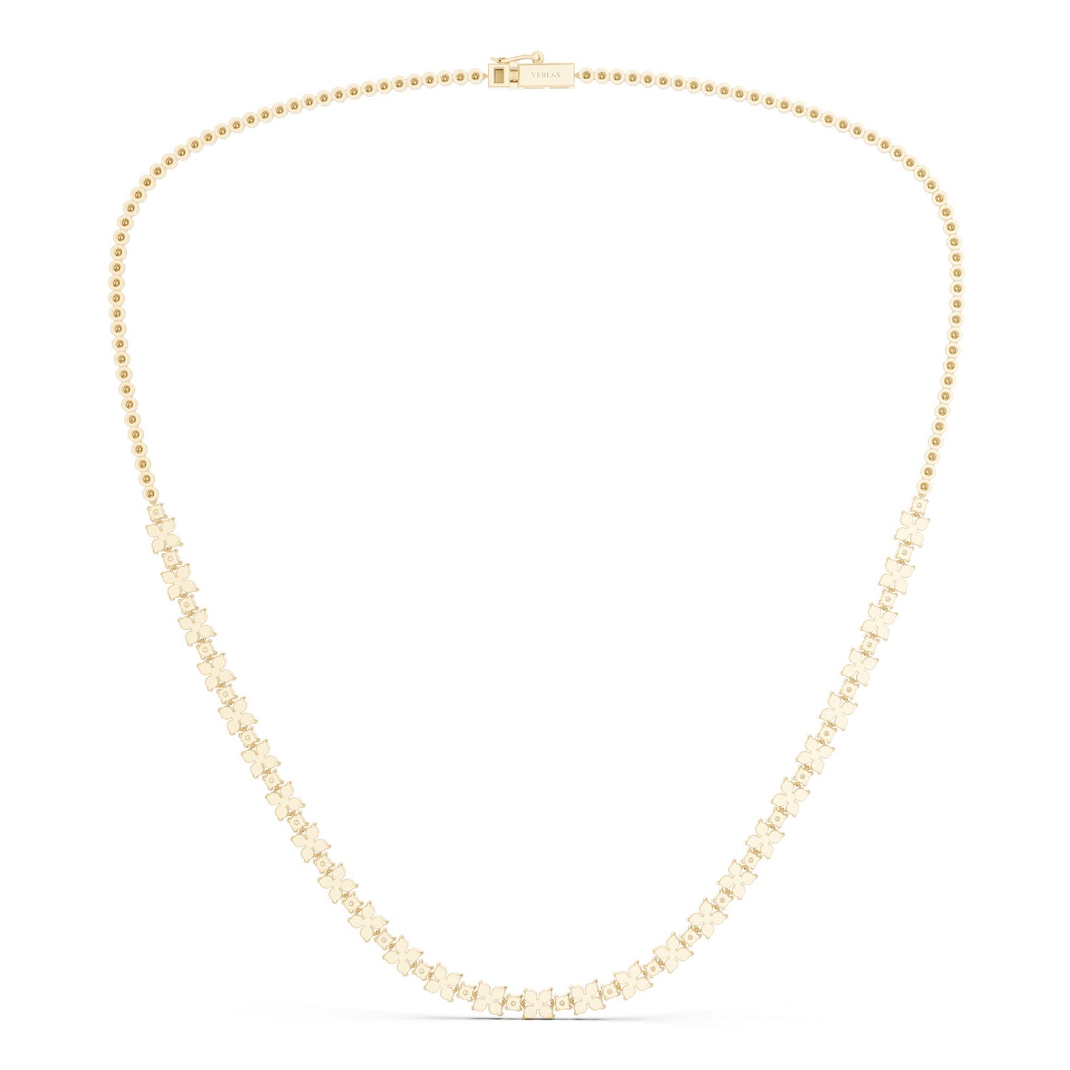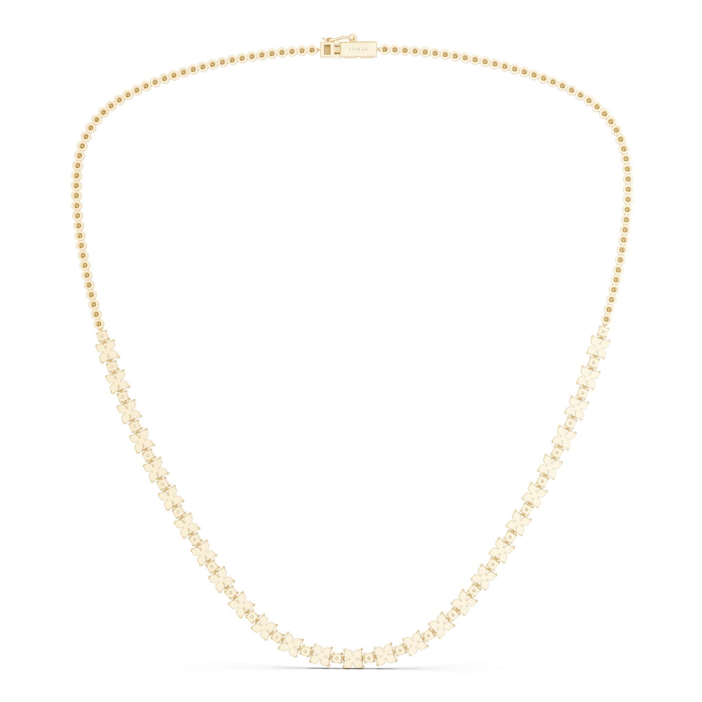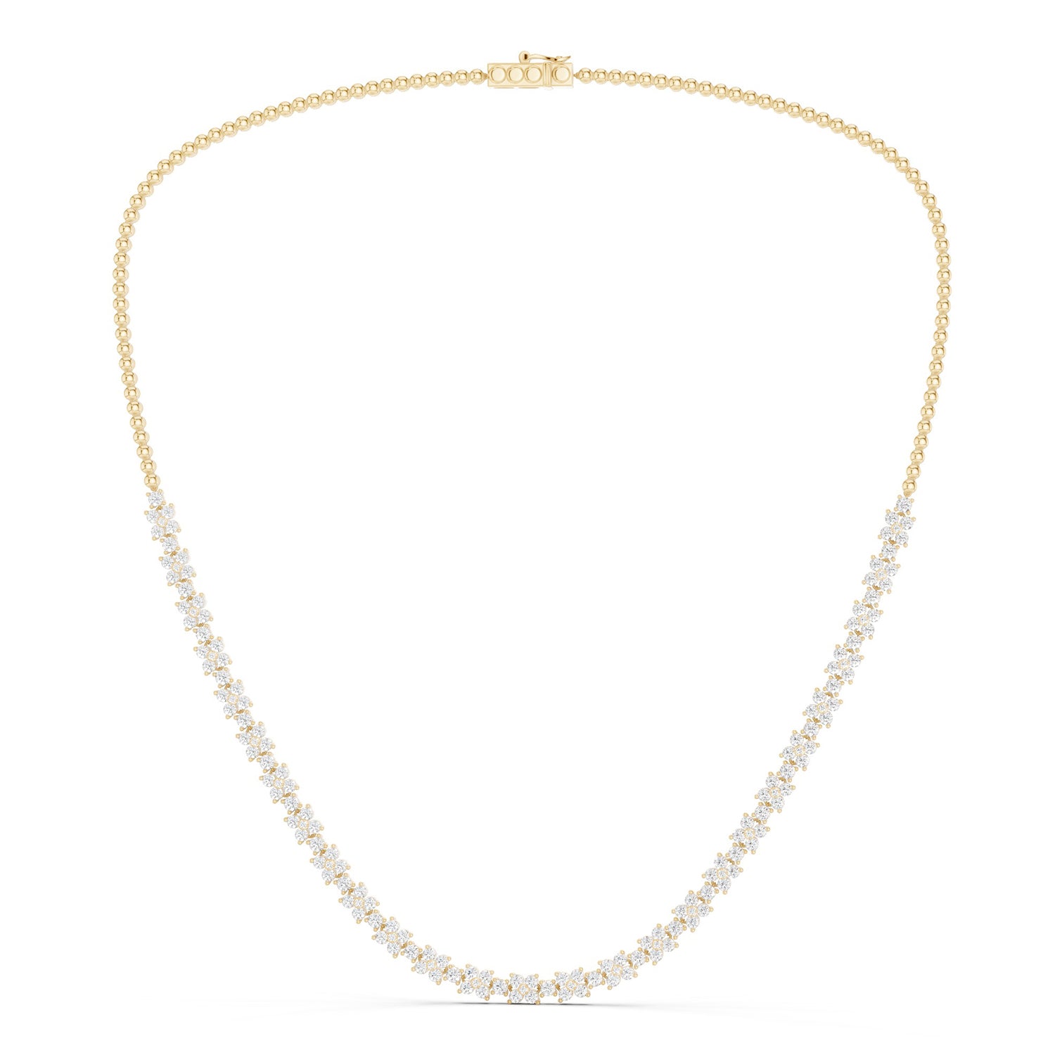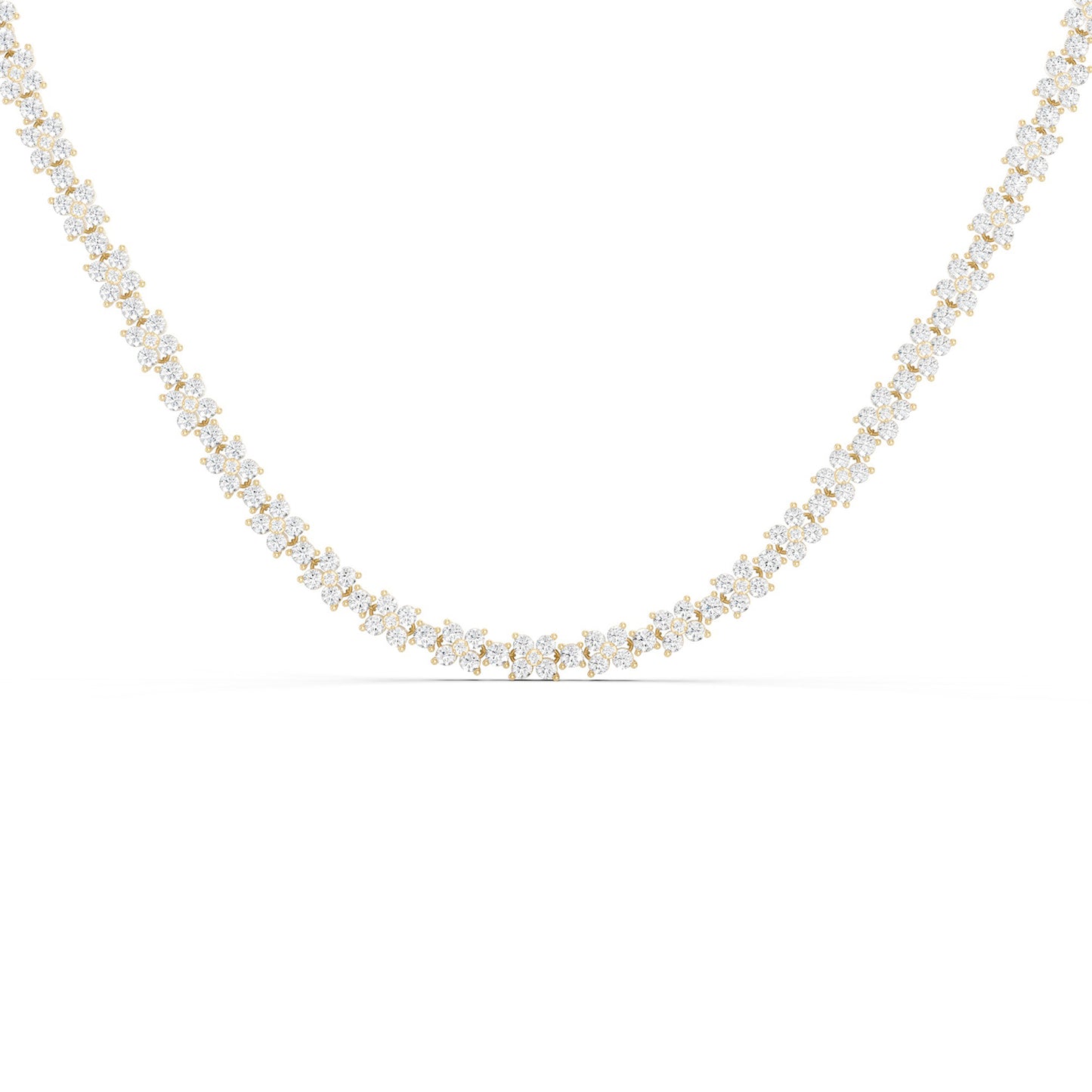The Alyssa Radiant Bouquet Necklace showcases 27 diamond florets blooming on a solid gold necklace. Each floret comprises 5 round-cut diamonds and is separated by a round-cut diamond. A true statement piece, this necklace is also highly versatile and can be styled with any other jewelry you might wear.
