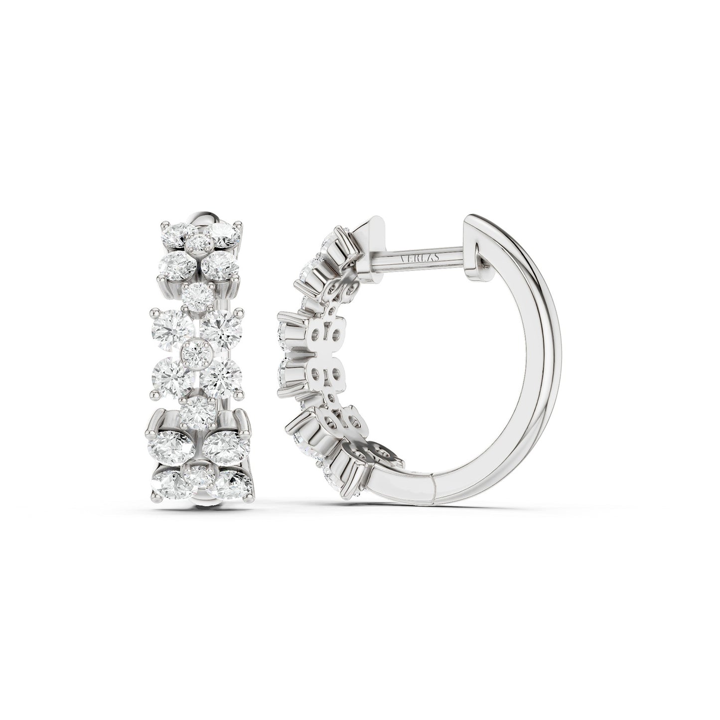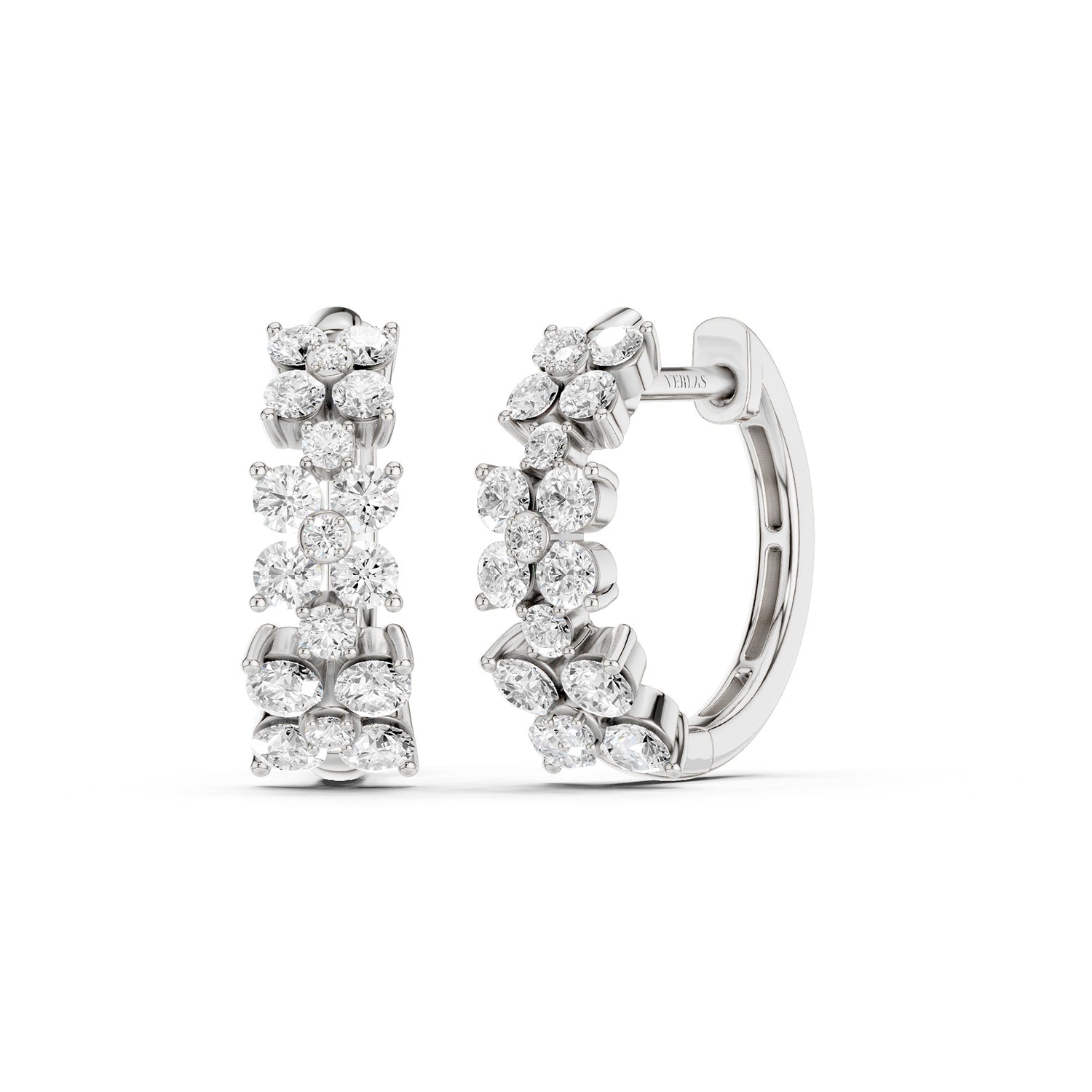 The Alyssa Tres Floral Hoops are a celebration of the sumptuous allure of Mother Nature. It is a pair of beautiful golden hoops adorned with three diamond florets. Each floret features 4 round diamonds centered around and separated by a single diamond. As the light casca. . . Read More