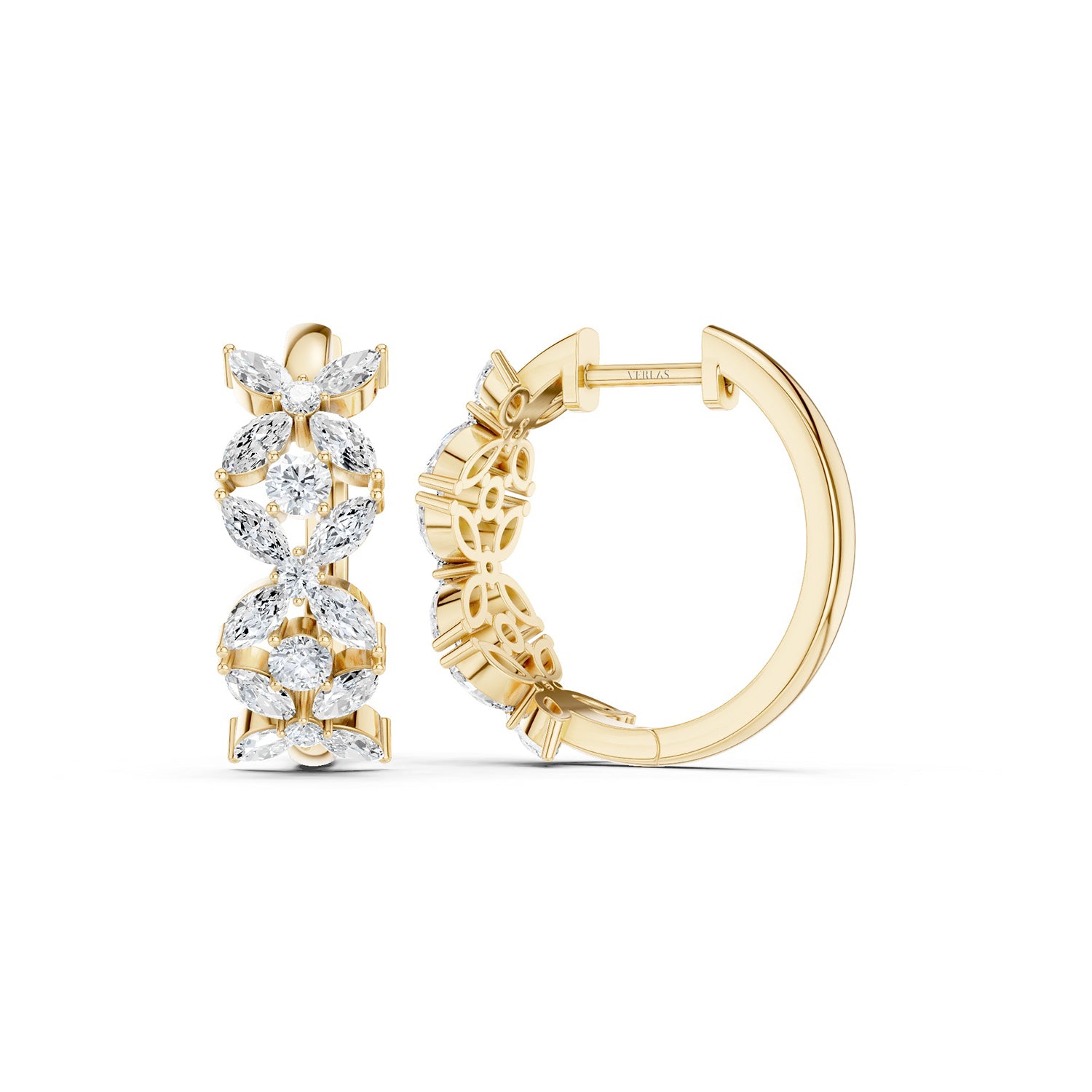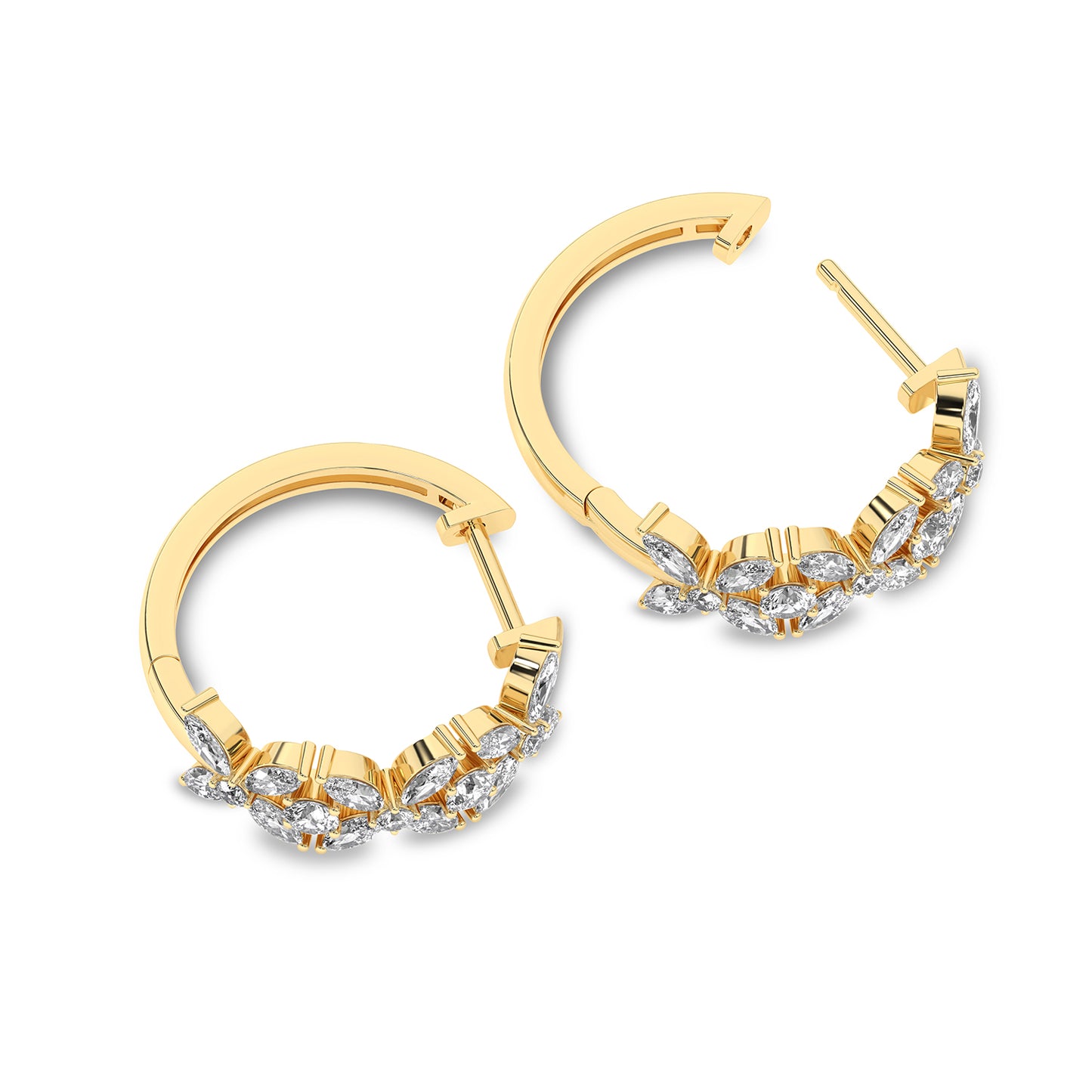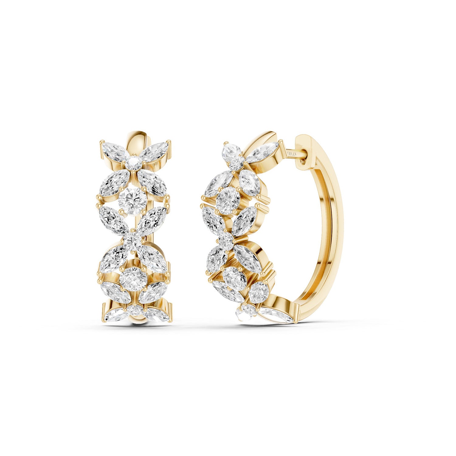 Embrace the radiant beauty of nature with the Alyssa Tres Marquise Huggies. These exquisite golden huggies feature three floral motifs. Each floret is intricately designed with four marquise diamonds, centered around and separated by a single diamond, capturing the essence of timeless elegance. As light dances across the marquise petals, these Huggies will illuminate your surroundings with a captivating, starlit glow. Perfect for adding a touch of refined glamour to any look, these diamond huggie hoops celebrate the lush allure of nature with a sophisticated twist.