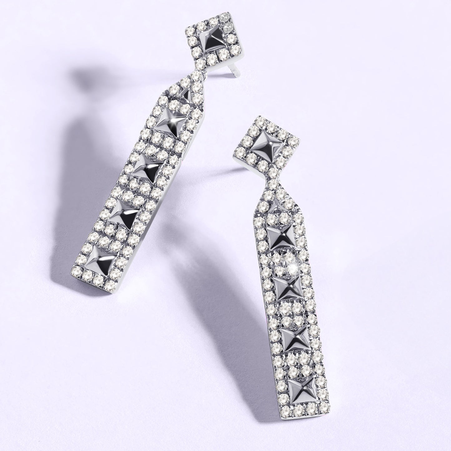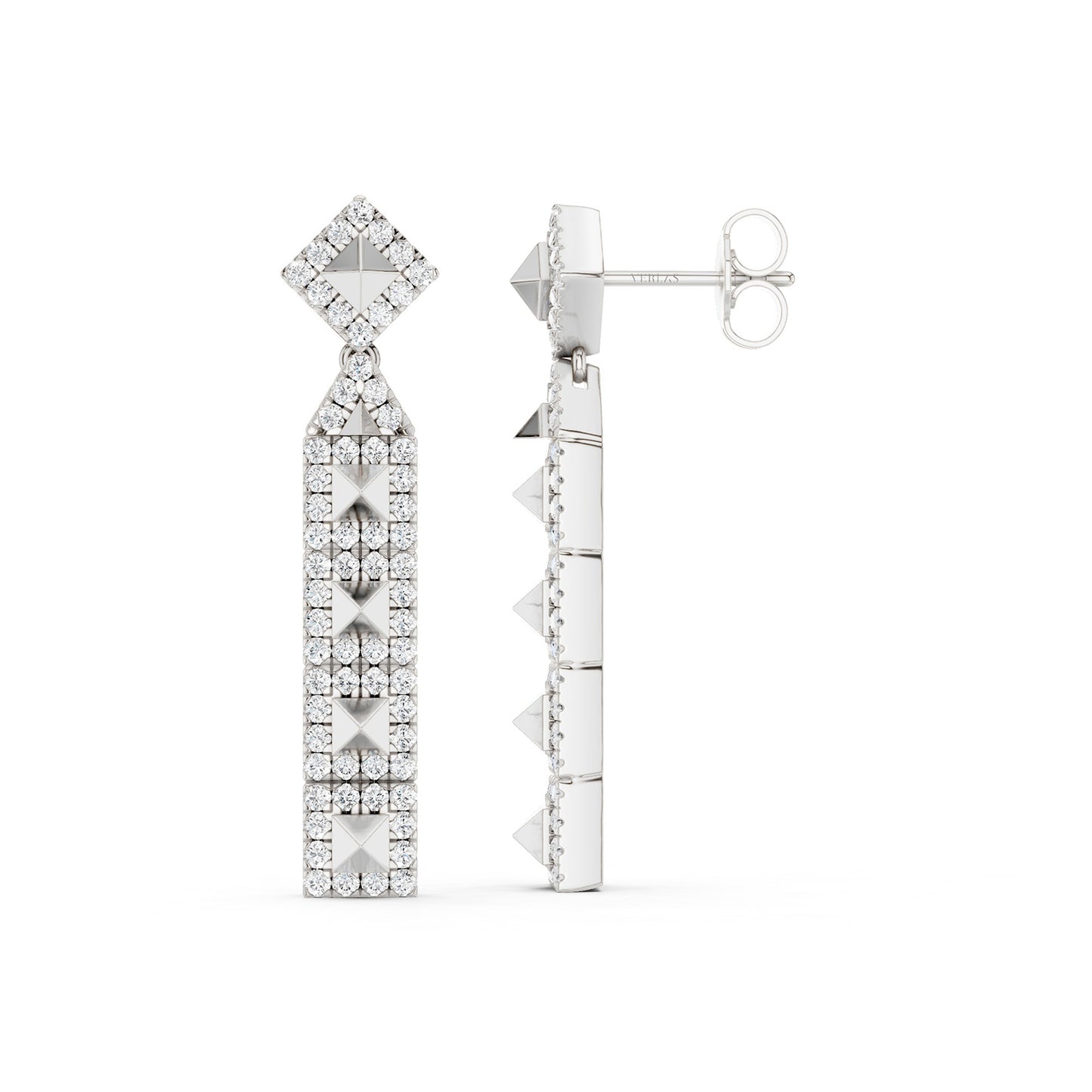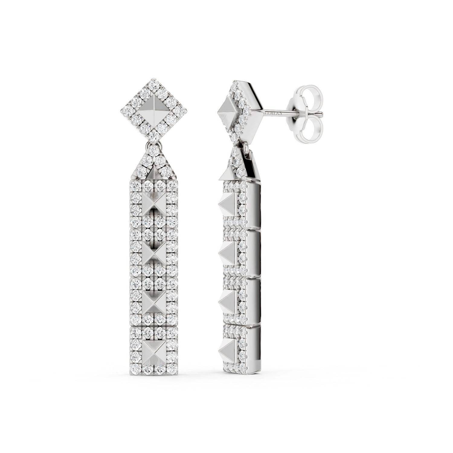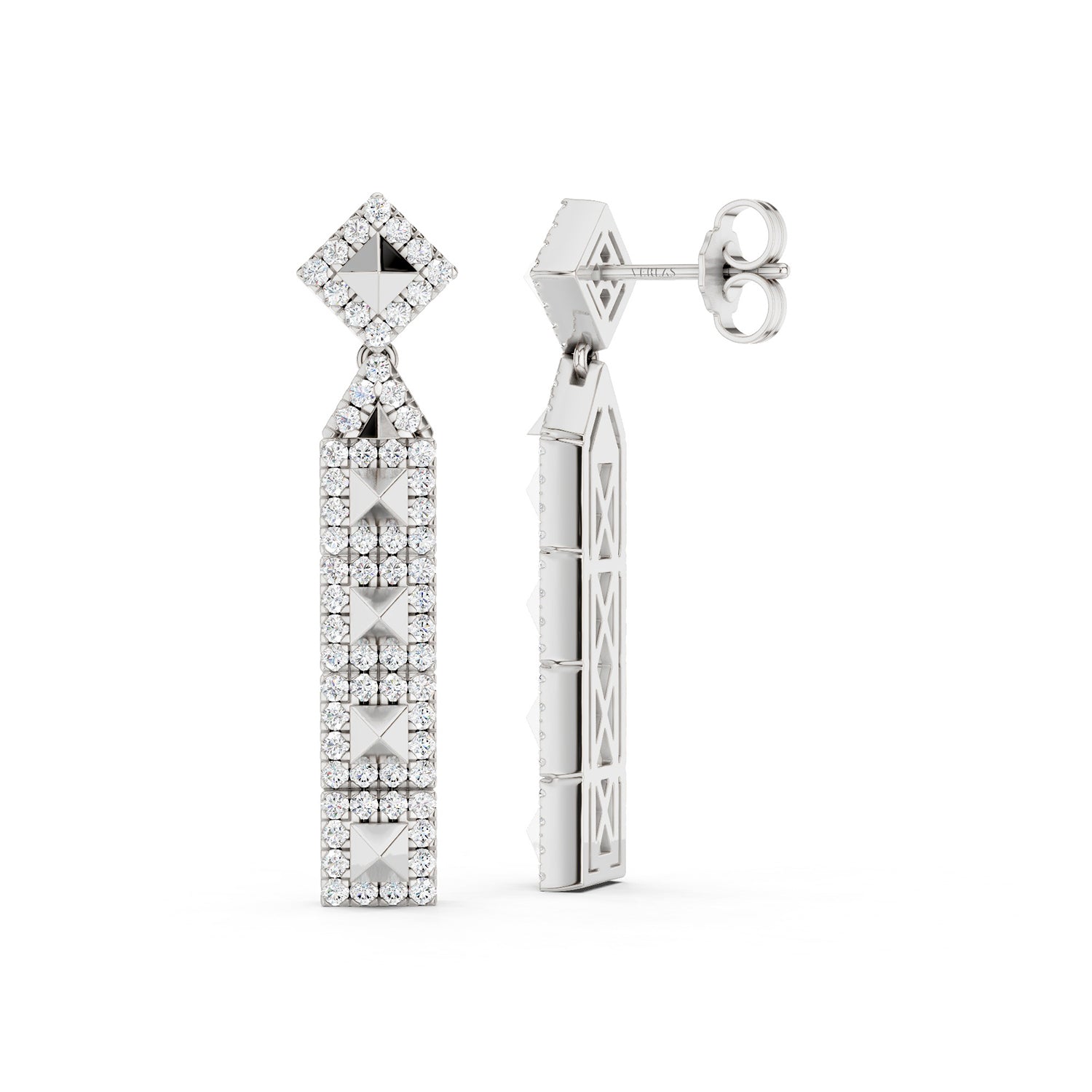 Make a statement with the Cascading Pyramid Geometric Drop Earrings, where bold geometry meets refined elegance. These stunning diamond earrings feature a cascading series of pyramid motifs, each framed by sparkling lab-grown diamonds, creating a striking visual effect. The pyramids are arranged vertically, drawing the eye downward in a graceful, elongating line that beautifully complements the face. At the top of each earring, an inverted triangle connects seamlessly to the earlobe, adding a modern, architectural flair to the design. The blend of sharp geometric shapes and dazzling diamonds gives these earrings an air of sophistication, perfect for special occasions or to elevate your everyday style.