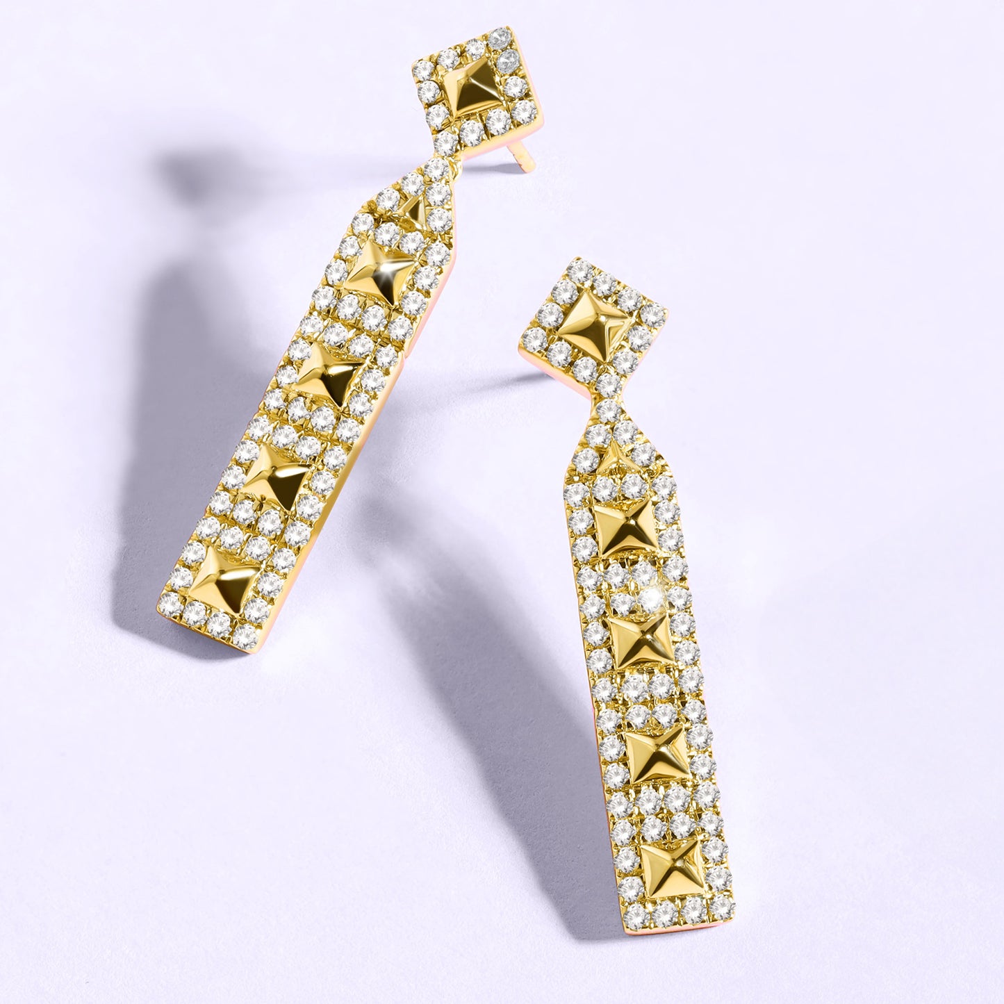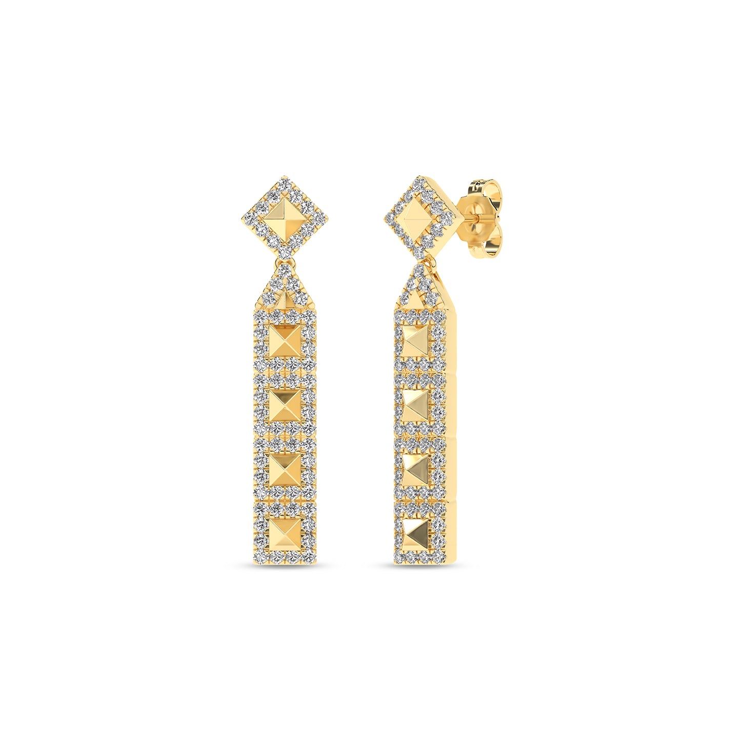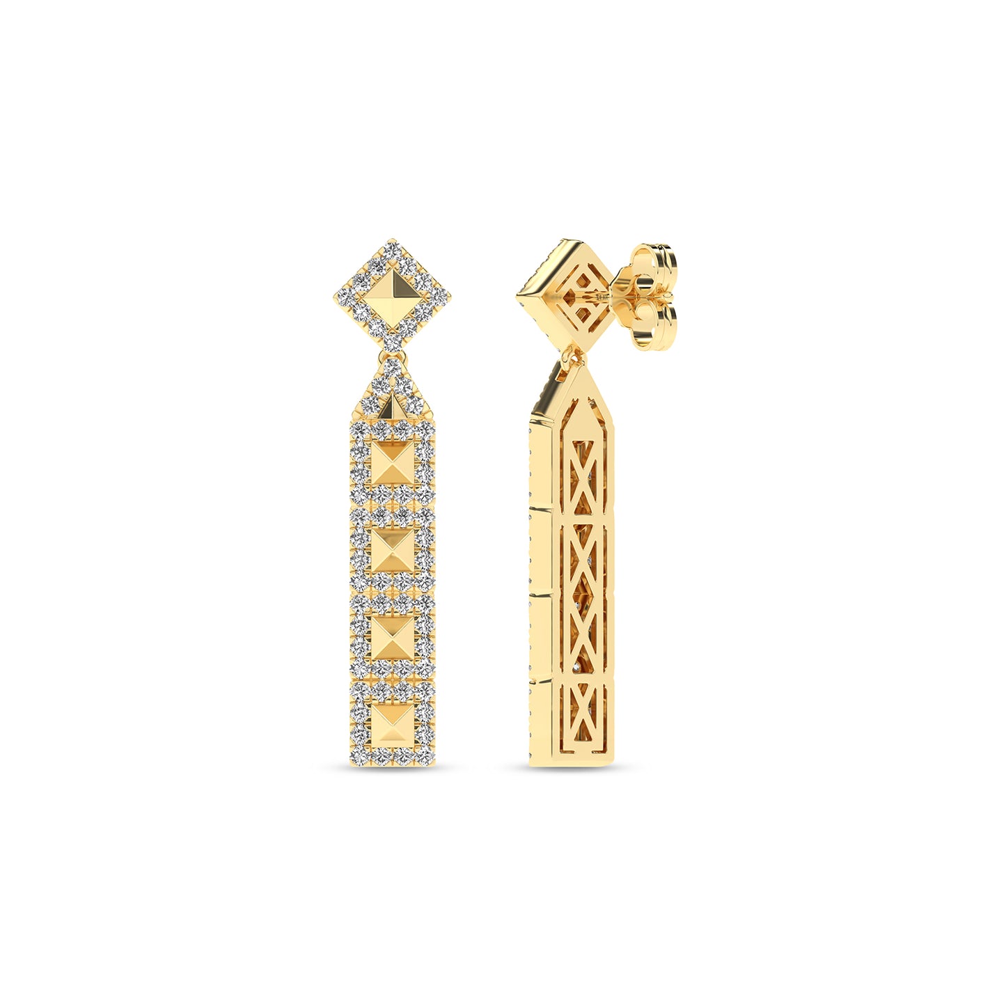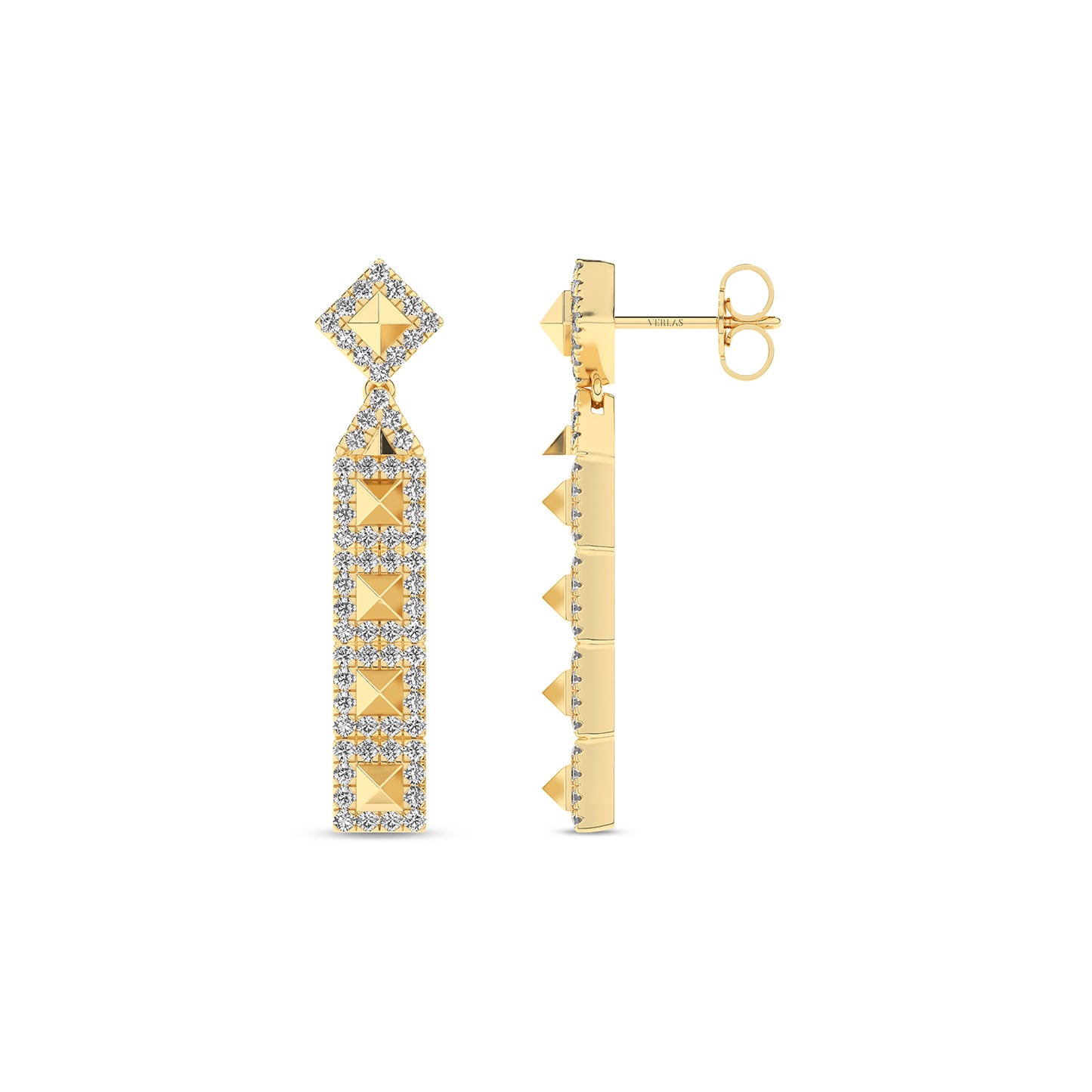 Make a statement with the Cascading Pyramid Geometric Drop Earrings, where bold geometry meets refined elegance. These stunning diamond earrings feature a cascading series of pyramid motifs, each framed by sparkling lab-grown diamonds, creating a striking visual effect. The pyramids are arranged vertically, drawing the eye downward in a graceful, elongating line that beautifully complements the face. At the top of each earring, an inverted triangle connects seamlessly to the earlobe, adding a modern, architectural flair to the design. The blend of sharp geometric shapes and dazzling diamonds gives these earrings an air of sophistication, perfect for special occasions or to elevate your everyday style.