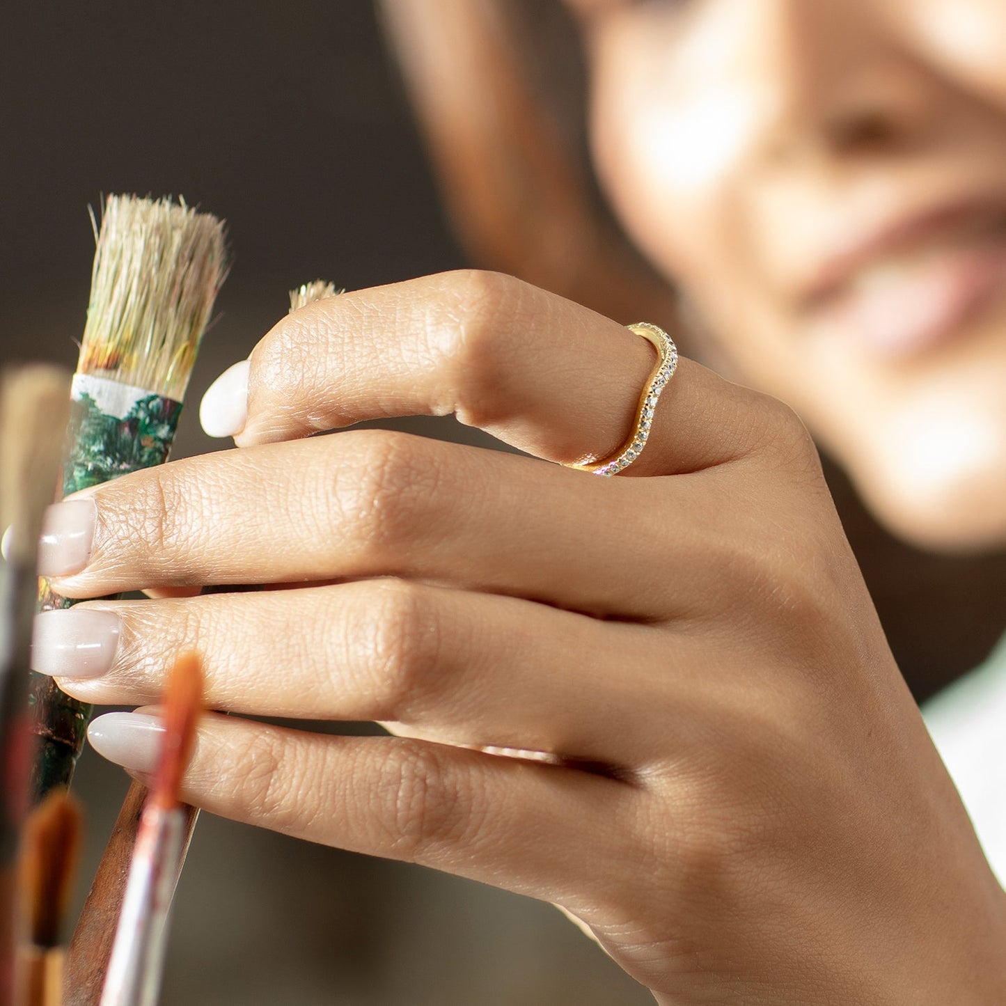 Adorn your finger with this lustrous lab-grown diamond ring that indeed makes for a modern statement piece. The brilliant round cut lab-grown diamonds running across the band for maximum sparkle create a scintillating chevron shape in 14k gold.