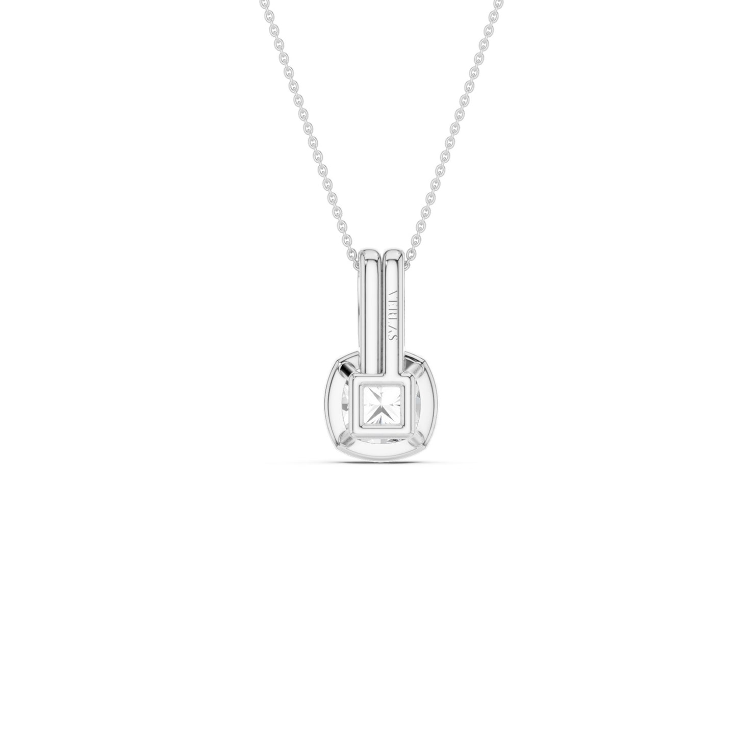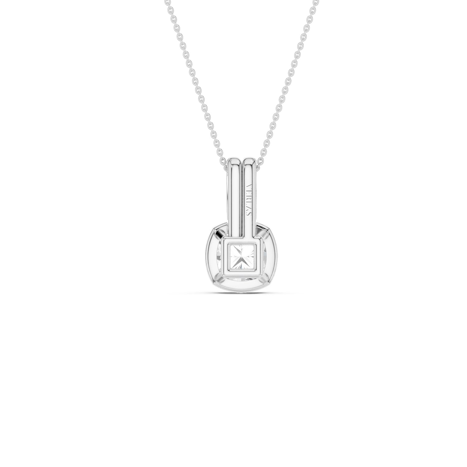 Enhance your elegance with our Coupled Cushion Bezel Necklace, a testament to sophistication and modern design. This exquisite diamond pendant necklace features a bezel-set, lab-grown cushion-cut diamond, radiating brilliance and clarity. Crafted with precision, the necklace boasts a unique double bail design, where two parallel bars elegantly cradle the diamond. The bars can be a combination of lustrous white and rose gold or white and yellow gold. This design not only enhances the beauty of the diamond but also adds a contemporary touch to the piece.