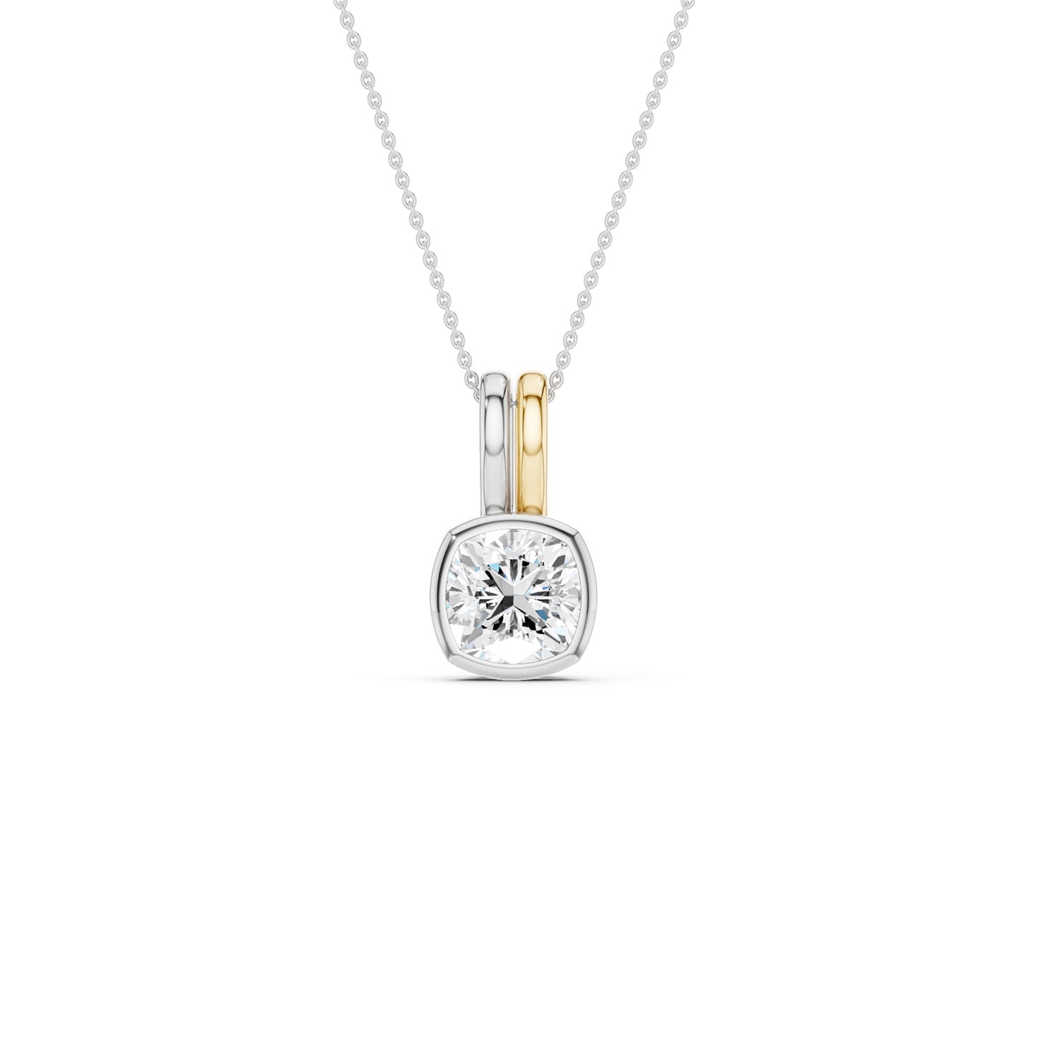 Enhance your elegance with our Coupled Cushion Bezel Necklace, a testament to sophistication and modern design. This exquisite diamond pendant necklace features a bezel-set, lab-grown cushion-cut diamond, radiating brilliance and clarity. Crafted with precision, the necklace boasts a unique double bail design, where two parallel bars elegantly cradle the diamond. The bars can be a combination of lustrous white and rose gold or white and yellow gold. This design not only enhances the beauty of the diamond but also adds a contemporary touch to the piece.