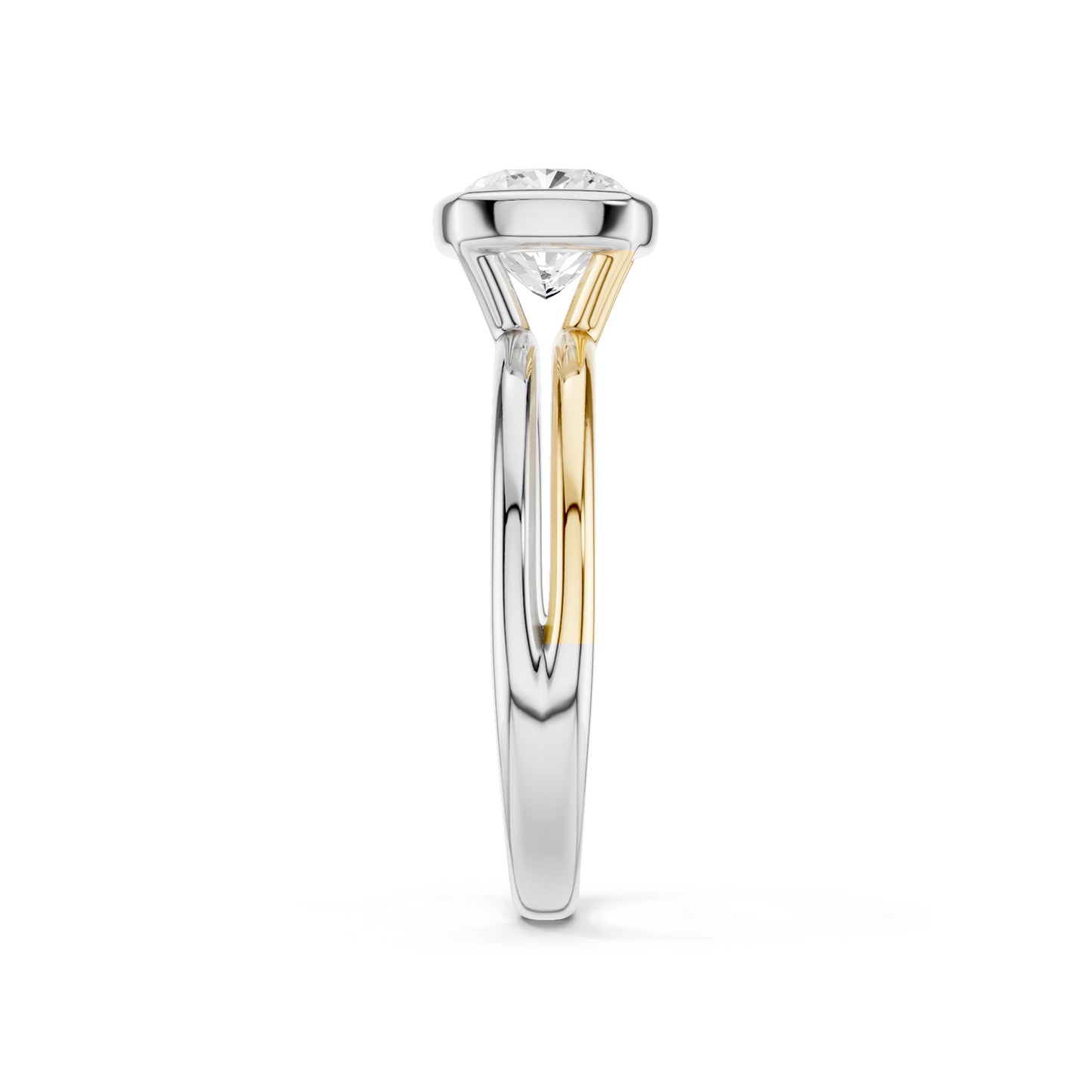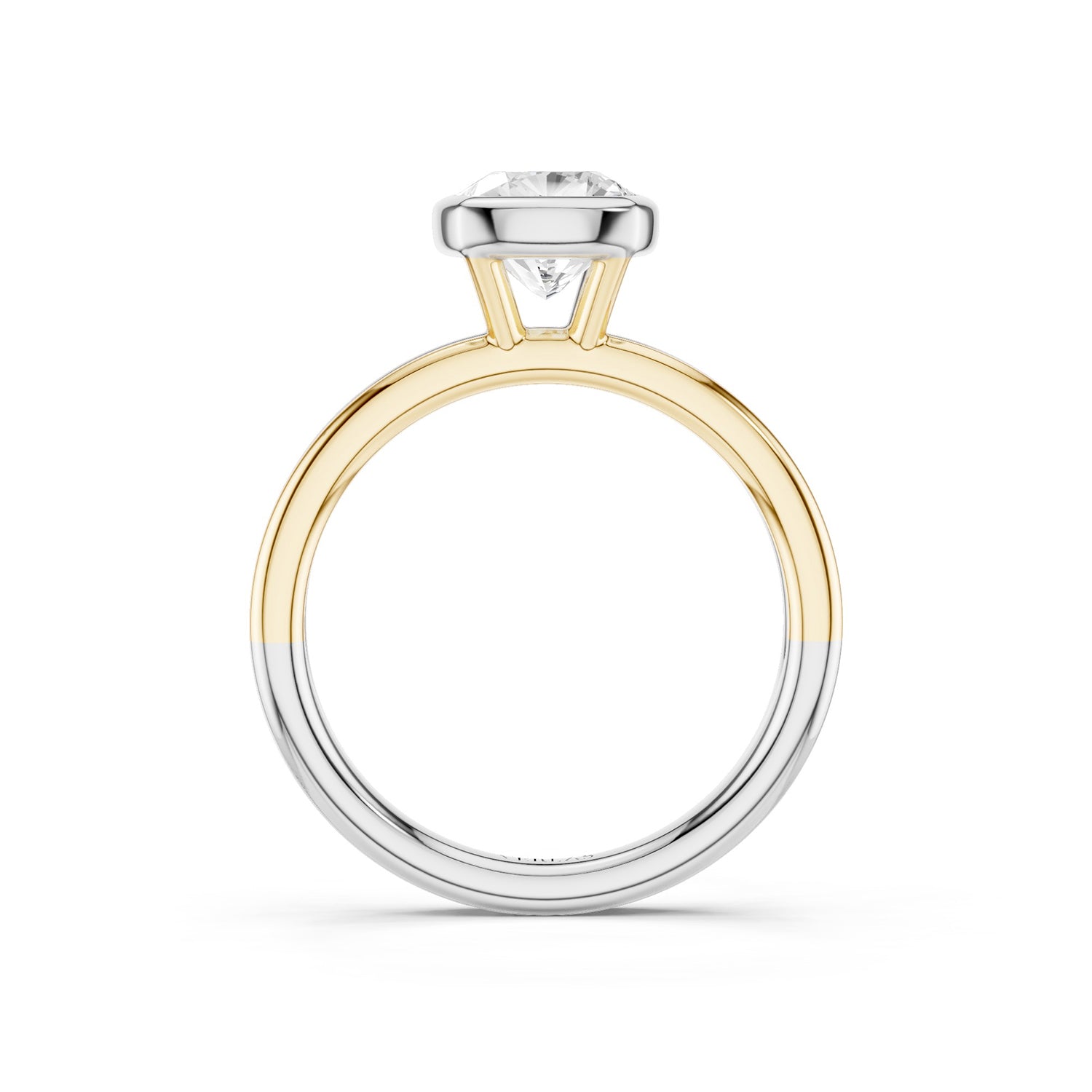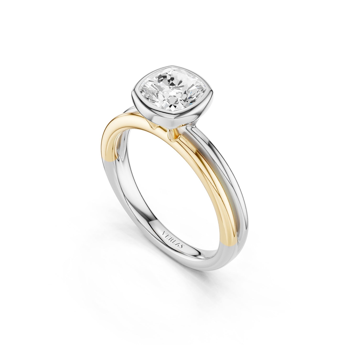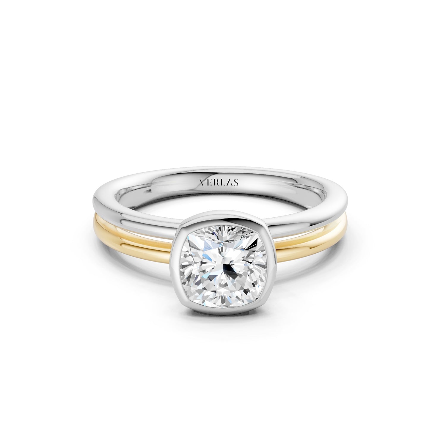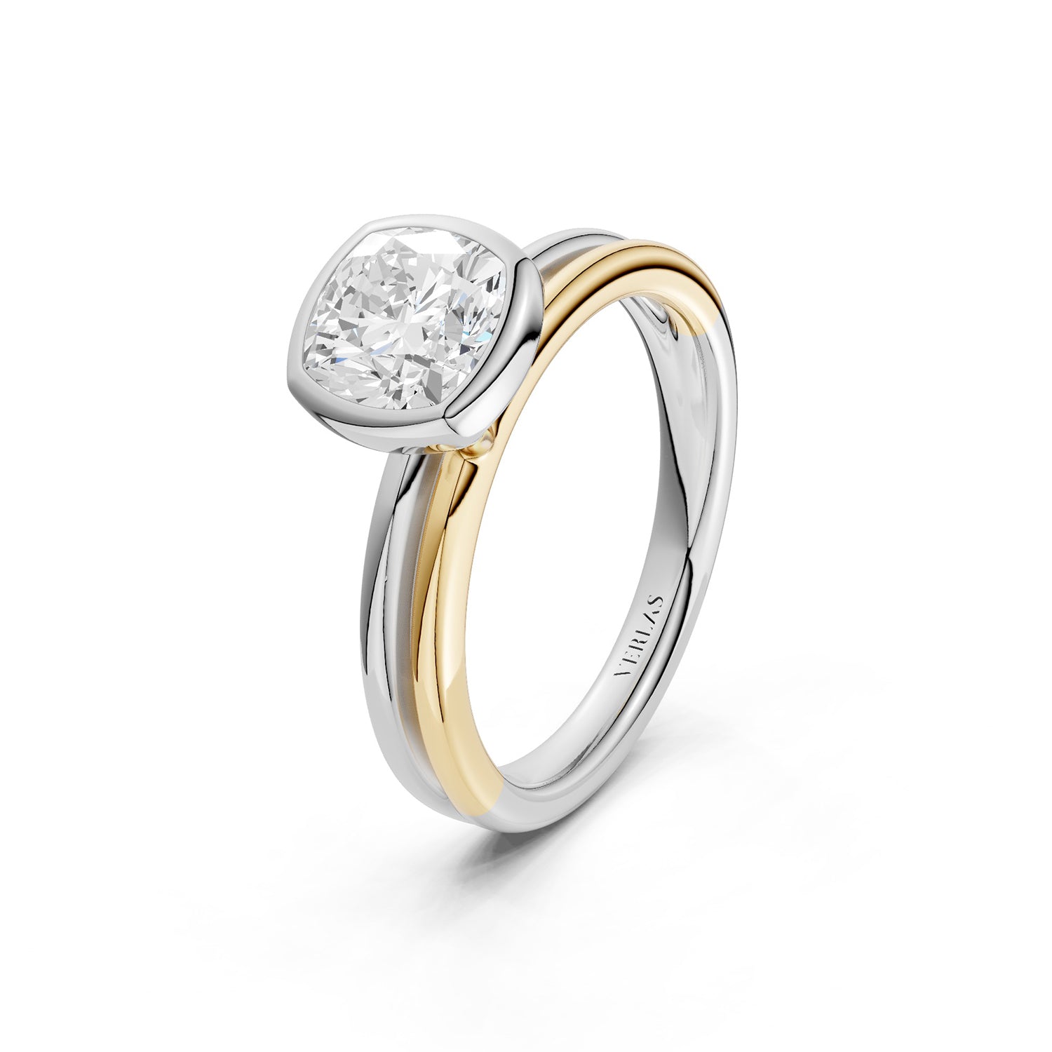 Our Coupled Cushion Bezel Ring is a stunning symbol of commitment and elegance. This solitaire ring features a bezel-set, lab-grown cushion-cut diamond in a unique dual-band design. The dual bands either gleam in lustrous white and yellow gold or shimmer in white and rose gold, creating a harmonious contrast that enhances the brilliance of the diamond. Ideal as an engagement ring or an anniversary gift, this solitaire diamond ring combines classic charm with modern sophistication. Also available in the all-white gold setting.