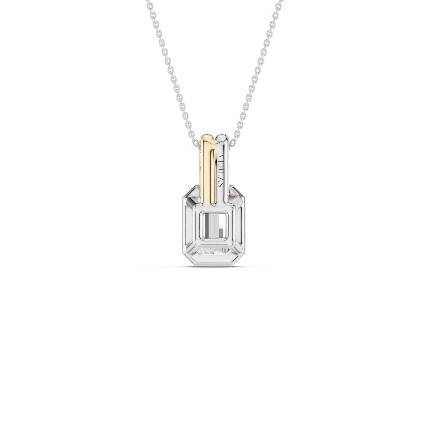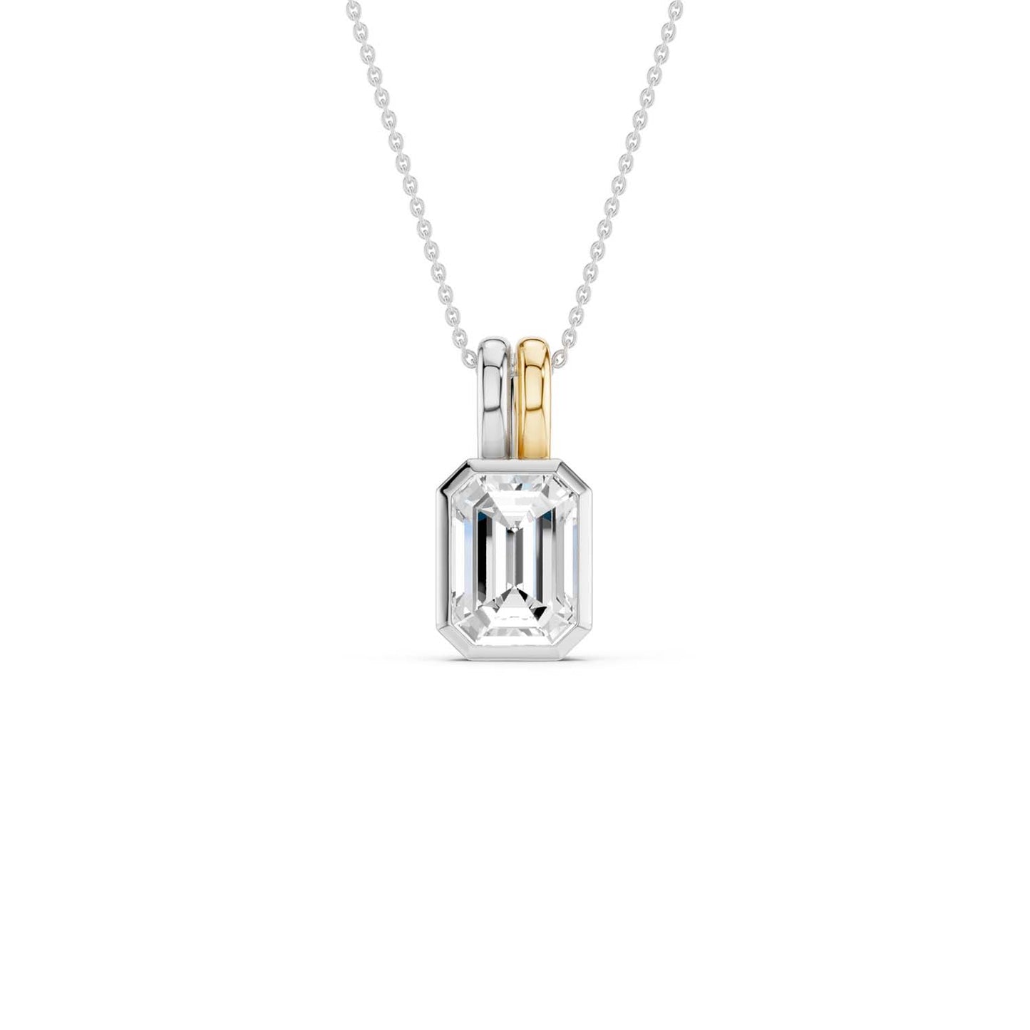 Elegance meets modern allure with our Coupled Emerald Bezel Necklace, a stunning addition to any collection. This solitaire necklace features a pear-shaped lab-grown diamond in a bezel setting, meticulously crafted to capture light from every angle. The unique double bail design is either in white and yellow gold or white and rose gold. It adds a contemporary twist to the classic solitaire pendant, making it a versatile piece for both casual and formal occasions.