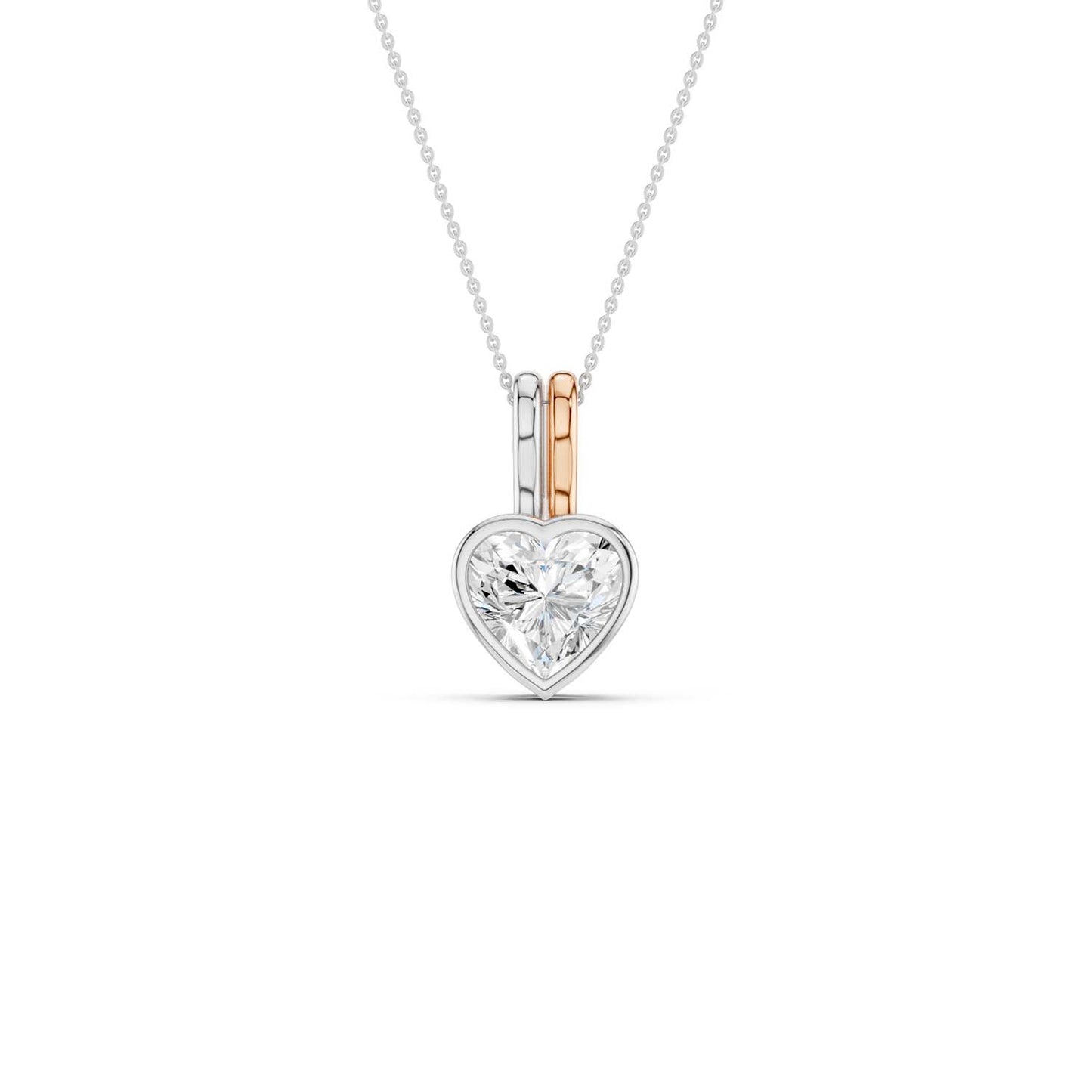 Elevate your style with our Coupled Heart Bezel Necklace, a stunning fusion of elegance and modern design. This captivating pendant features a bezel-set, lab-grown heart-shaped diamond that catches the light from every angle, exuding unparalleled brilliance and sophistication. The diamond necklace is designed with a unique double bail, where two parallel bars—crafted in a choice of lustrous white and yellow gold or white and rose gold—graciously frame the diamond, creating a refined and contemporary look. Perfect for adding a touch of luxury to any occasion, this necklace seamlessly blends timeless beauty with a modern twist, making it.