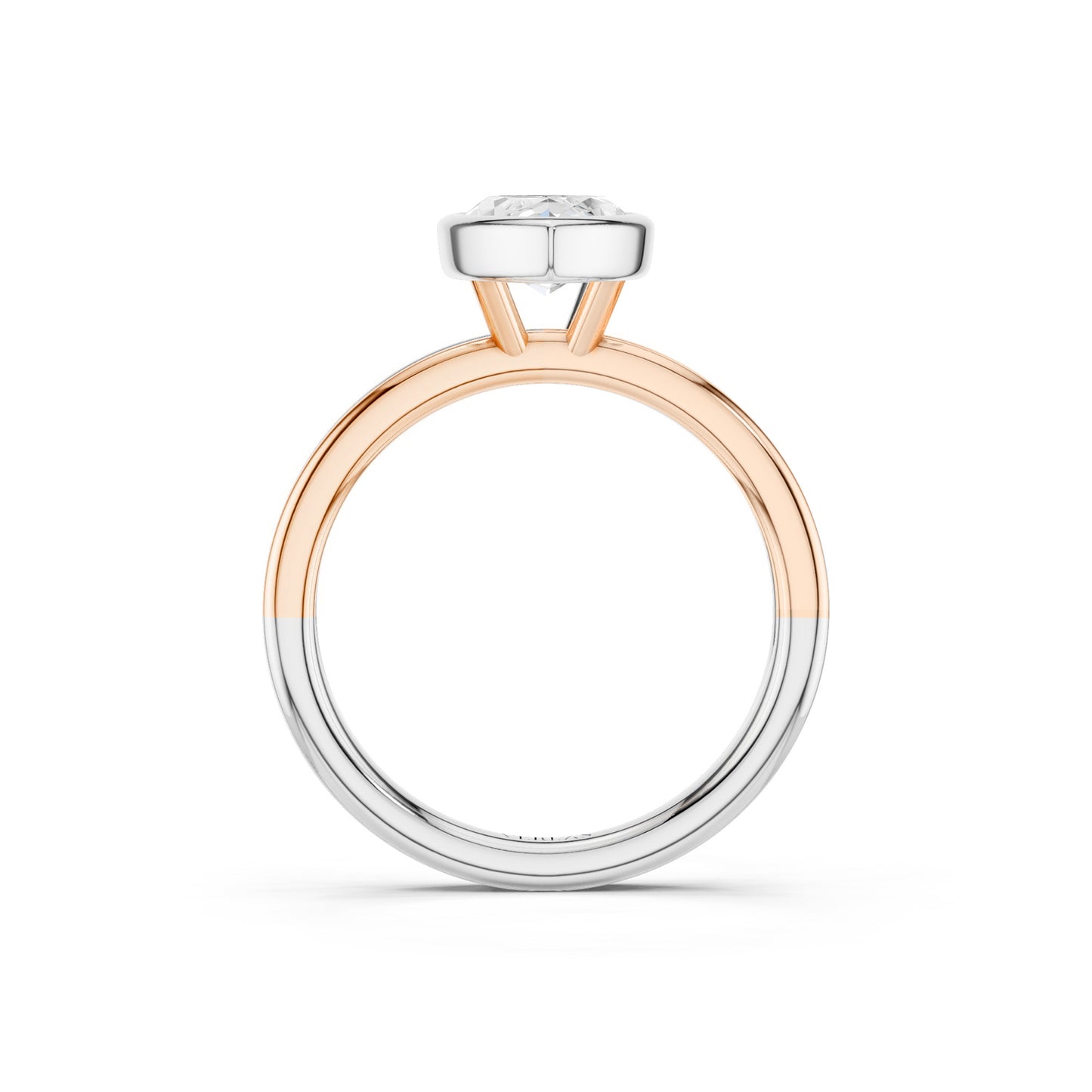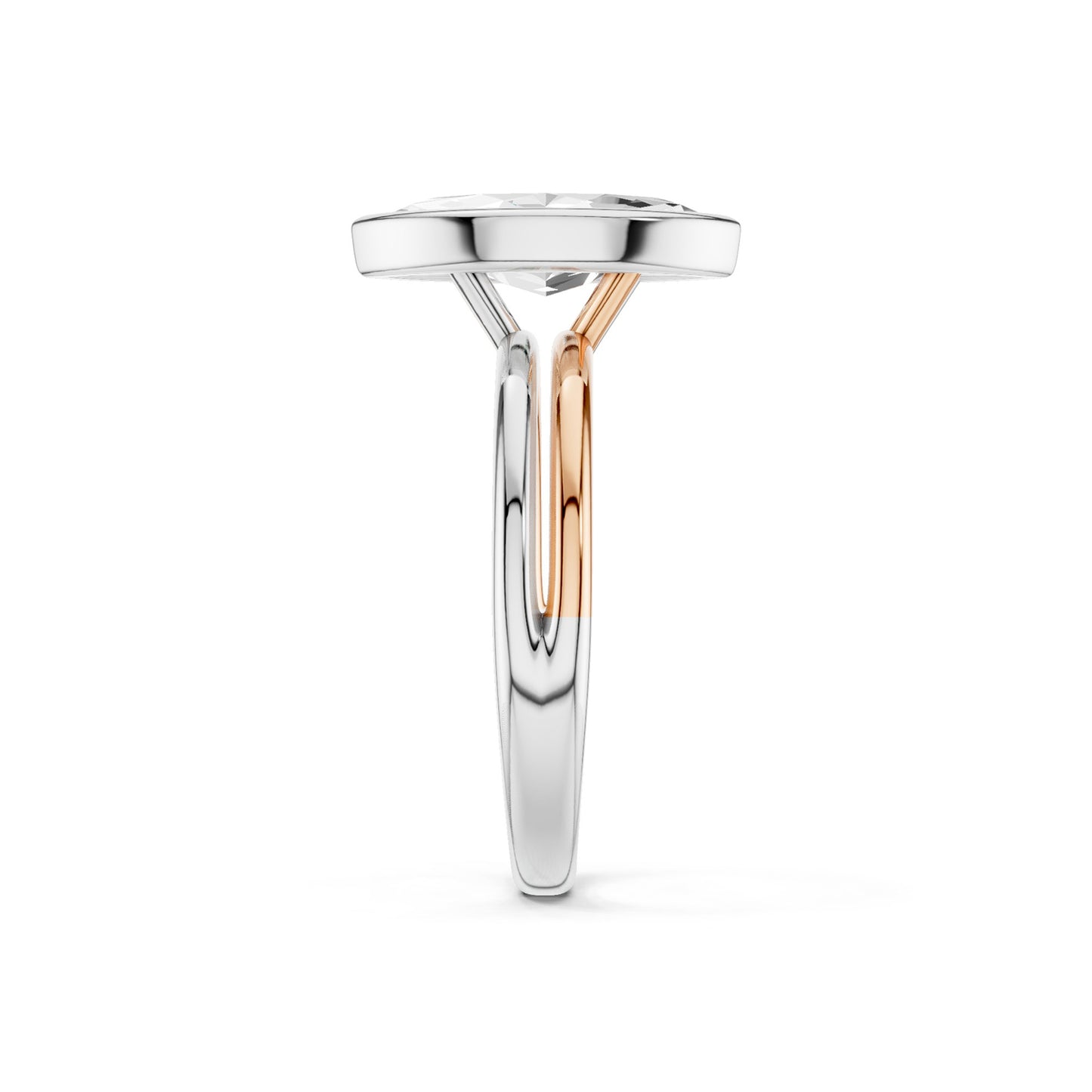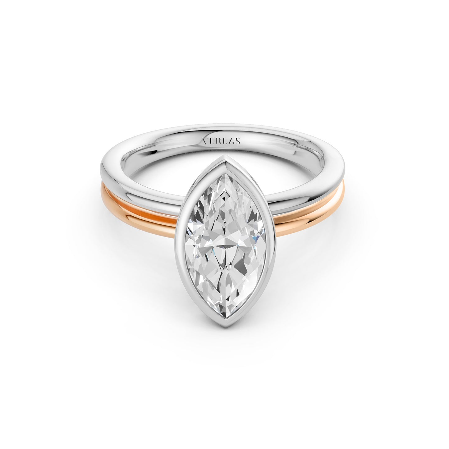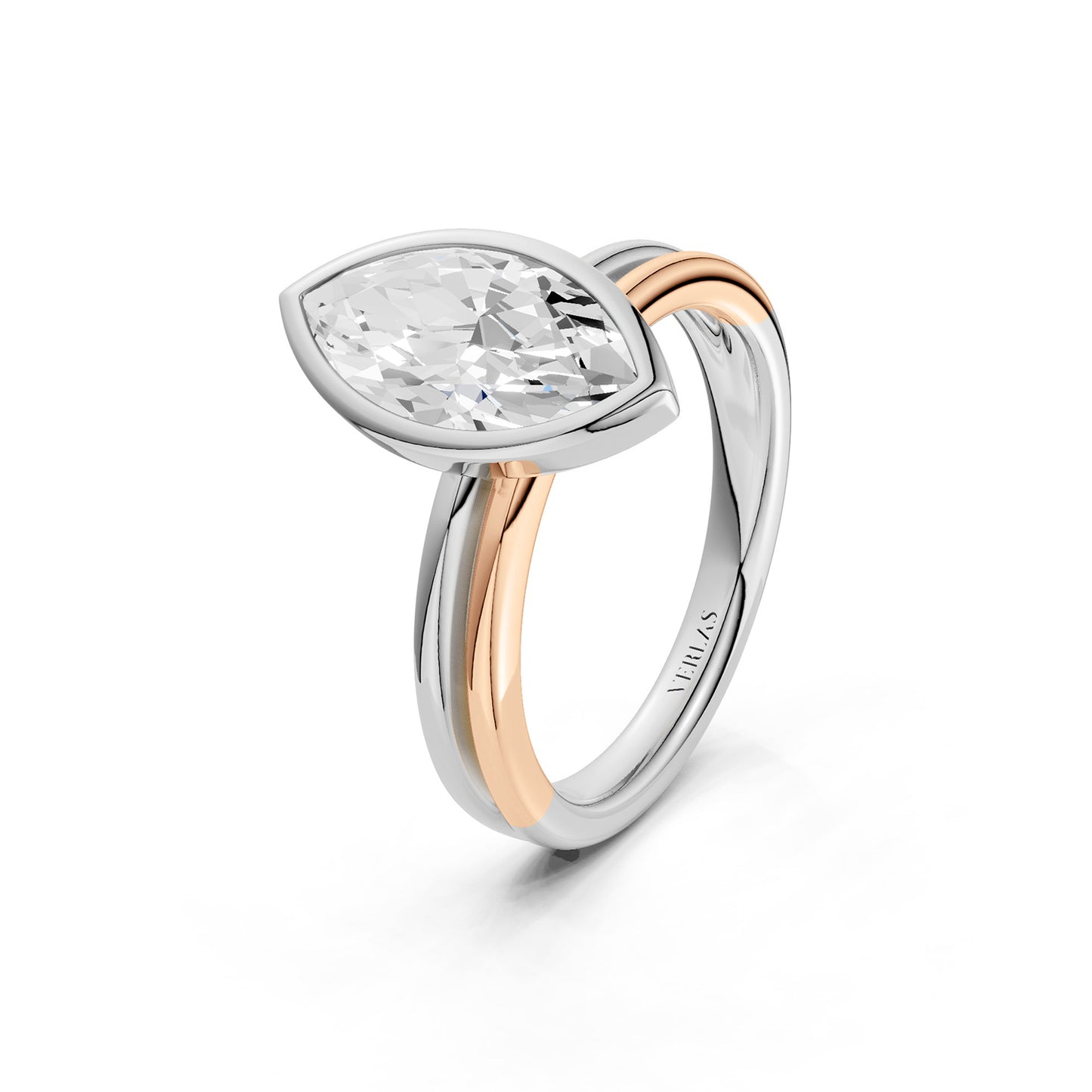 Our Coupled Marquise Bezel Ring is a captivating symbol of love and elegance, reimagined for those seeking modern sophistication. This exquisite solitaire ring showcases a bezel-set, lab-grown marquise-cut diamond, celebrated for its elongated, eye-catching shape that sparkles brilliantly from every angle. The ring features a unique dual-band design, available in a choice of lustrous white and yellow gold or the romantic pairing of white and rose gold, creating a striking contrast that enhances the diamond's radiance.
