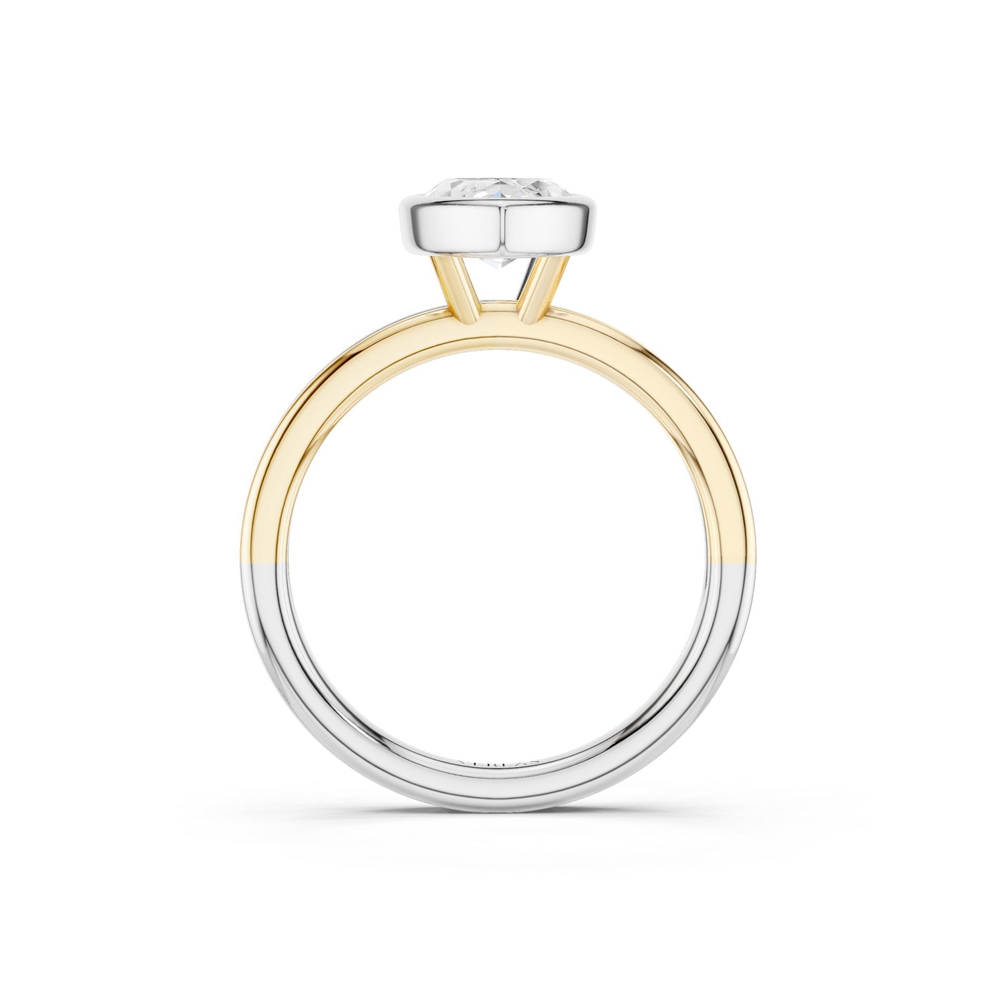 Our Coupled Marquise Bezel Ring is a captivating symbol of love and elegance, reimagined for those seeking modern sophistication. This exquisite solitaire ring showcases a bezel-set, lab-grown marquise-cut diamond, celebrated for its elongated, eye-catching shape that sparkles brilliantly from every angle. The ring features a unique dual-band design, available in a choice of lustrous white and yellow gold or the romantic pairing of white and rose gold, creating a striking contrast that enhances the diamond's radiance.