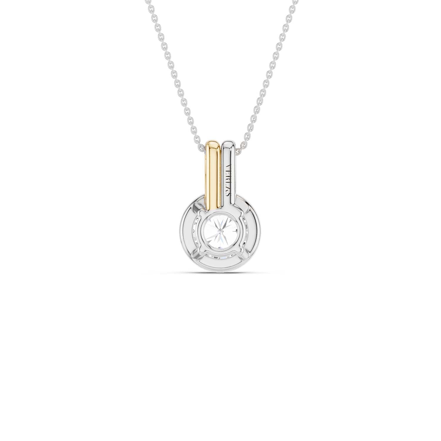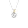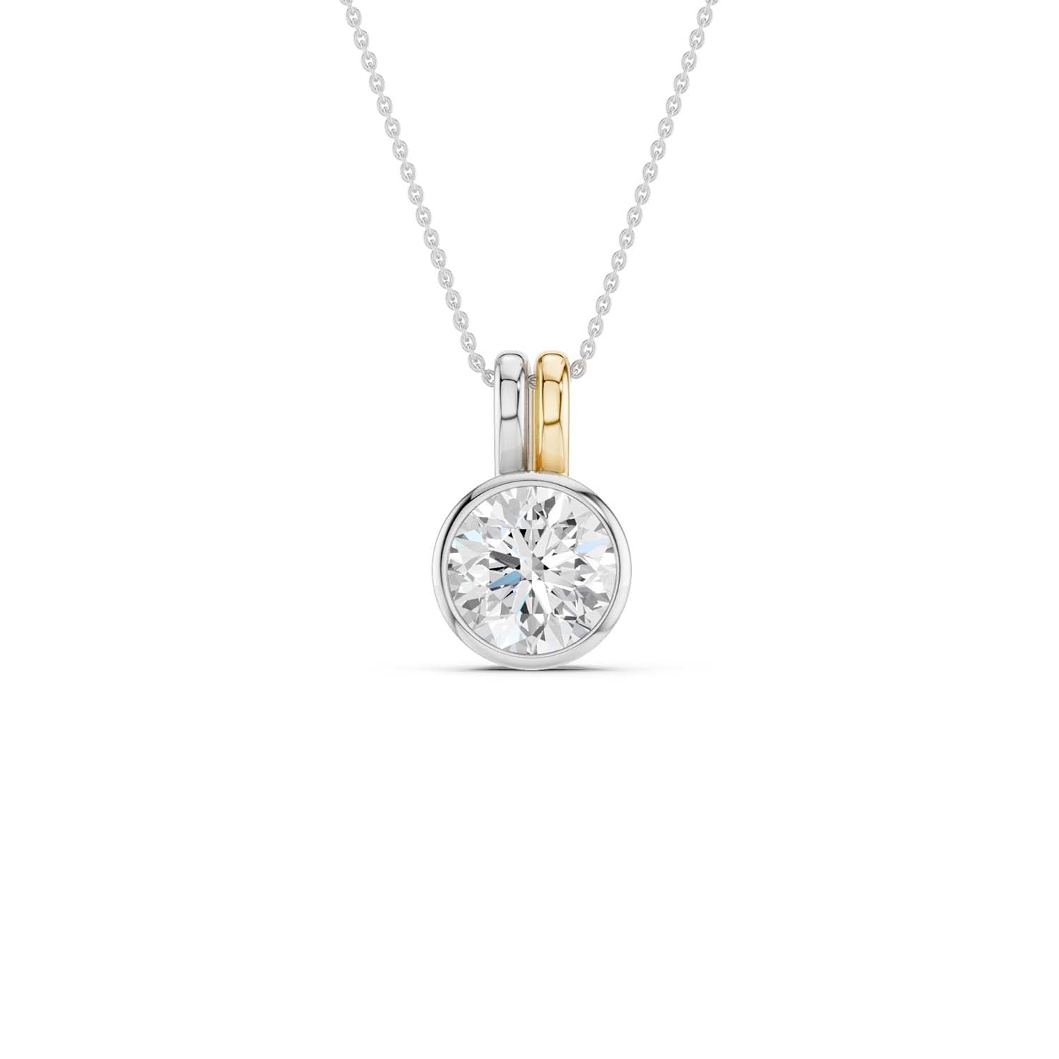 Discover timeless elegance with our Coupled Solitaire Bezel Necklace, a captivating blend of sterling white and radiant yellow gold. To enhance its brilliance and allure, it features a stunning round lab-grown diamond in a bezel setting. The unique double bail design adds a contemporary twist, allowing the diamond to float gracefully on the neckline, catching every glimmer of light. This diamond pendant necklace effortlessly blends classic charm with modern style, perfect for everyday wear and special occasions.