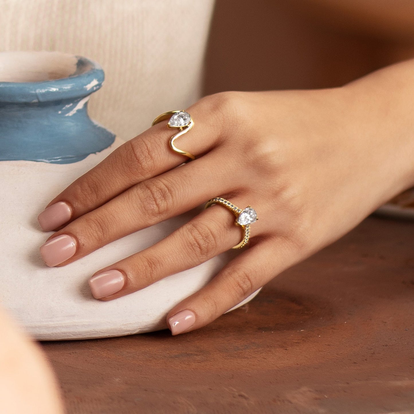 Read MoreFor a more contemporary and edgy flair, opt for this wrap-around curved design with a pear-cut lab diamond ring. This unique ring with a sleek and chic spin exudes an enthralling charm showcasing its everlasting beauty.