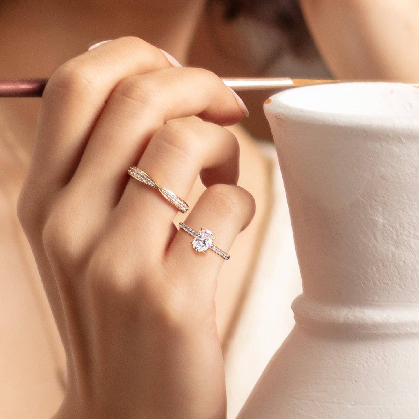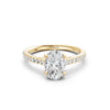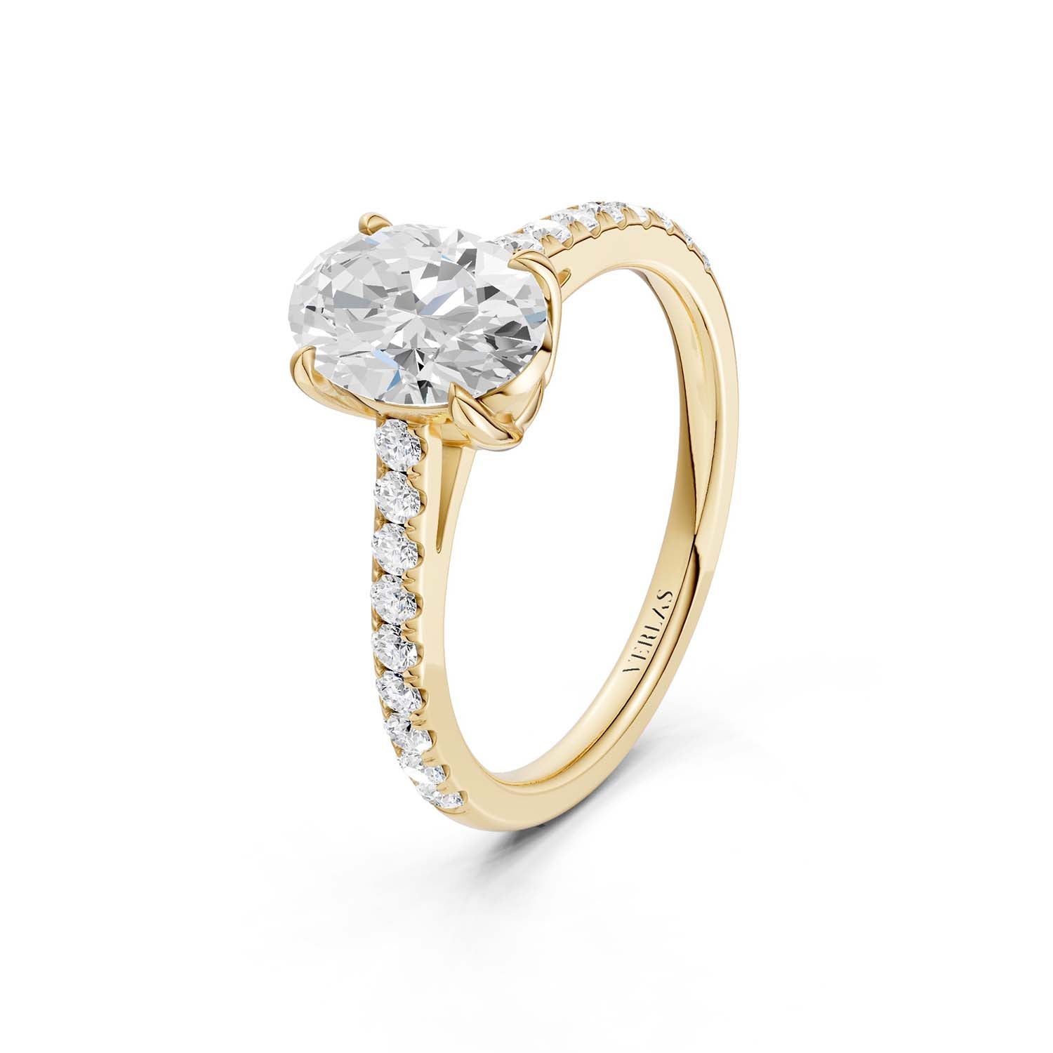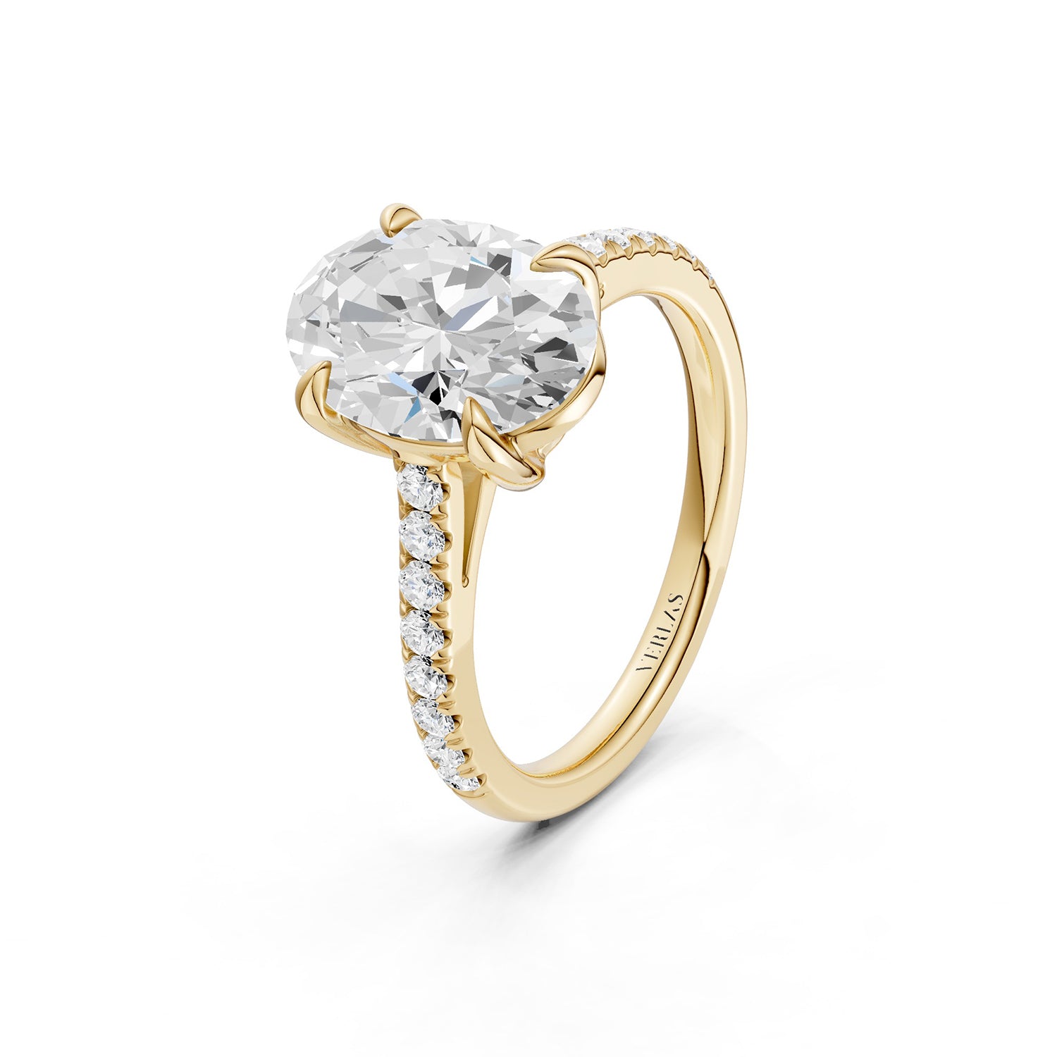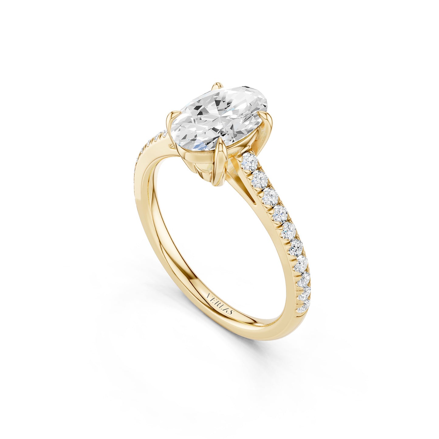 This dainty lab-created oval diamond engagement ring features lab-grown diamonds with sheer sparkle that extends halfway around the ring. The prong-set center diamond is complemented by glittering micro pave diamonds along the shank, giving it an elegant, chic look.