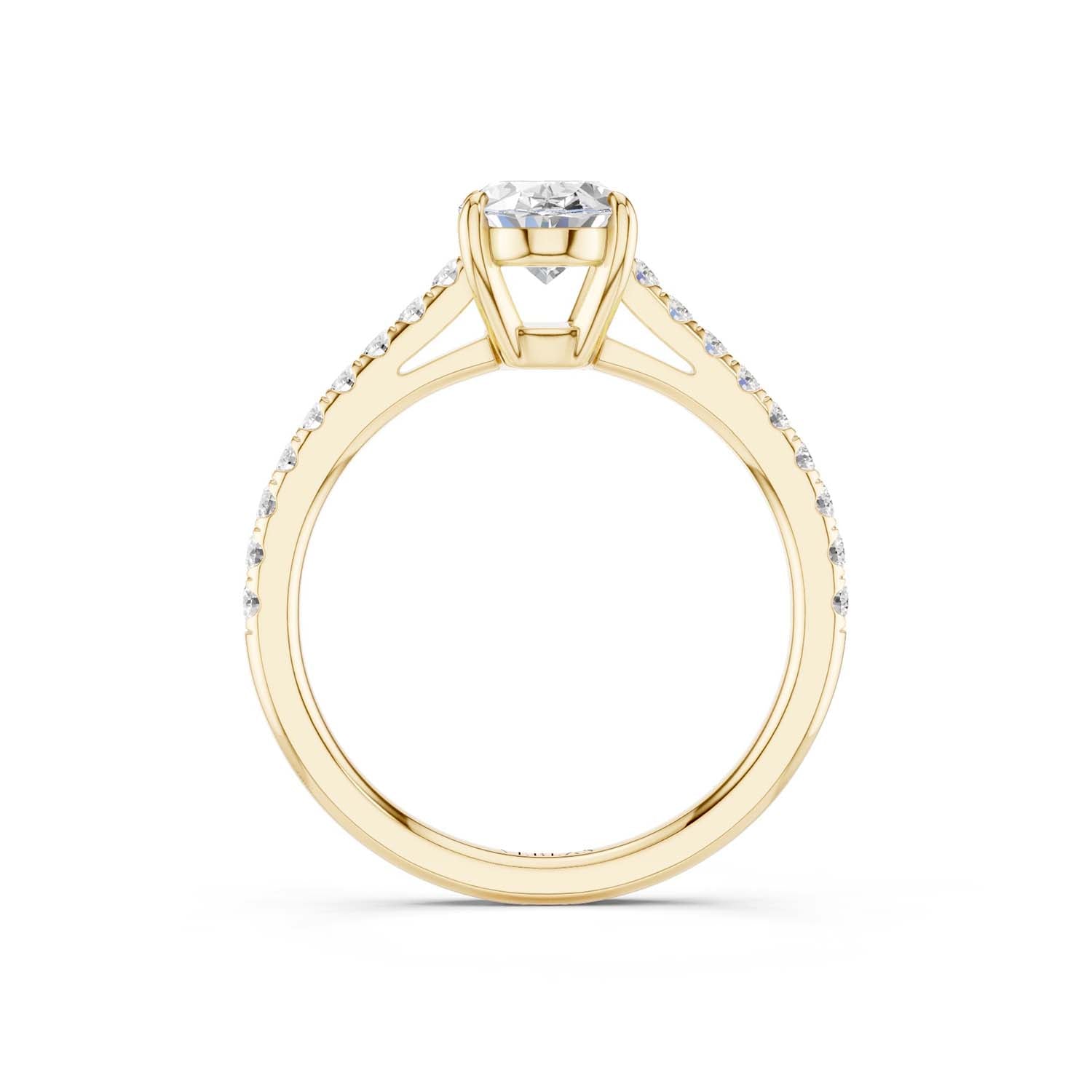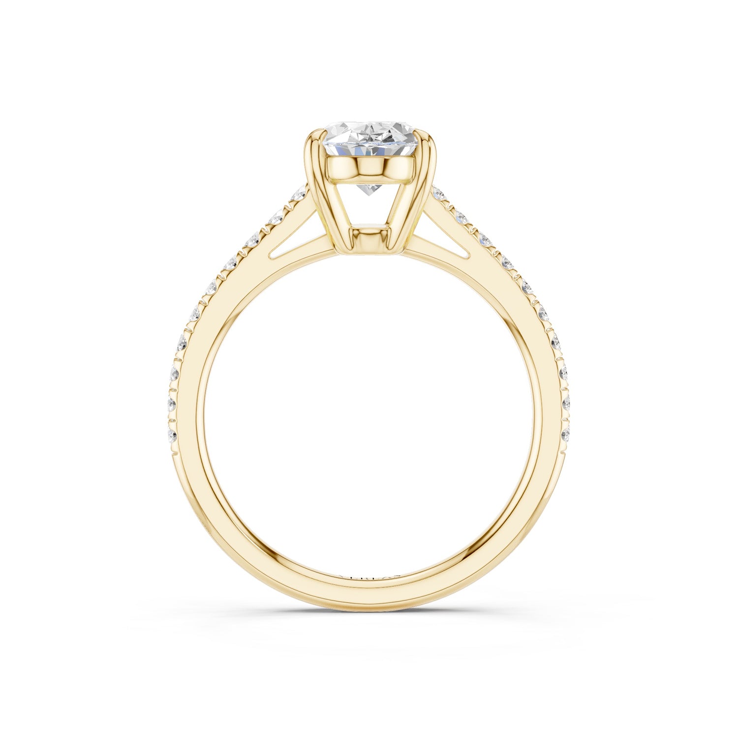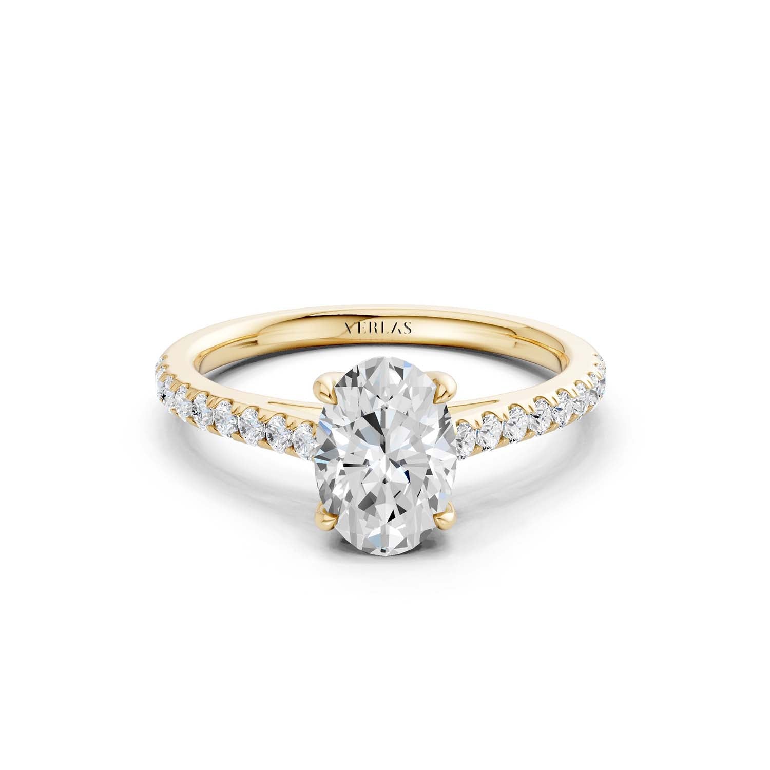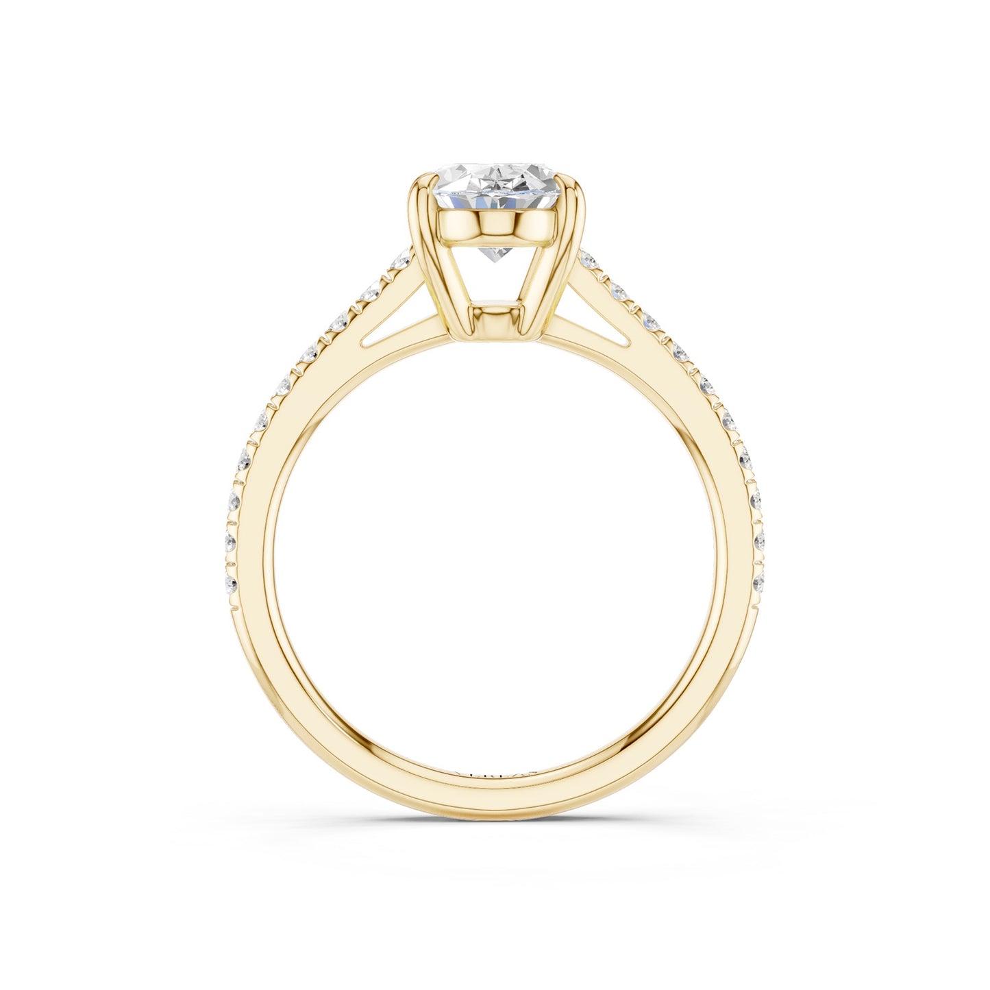 This dainty lab-created oval diamond engagement ring features lab-grown diamonds with sheer sparkle that extends halfway around the ring. The prong-set center diamond is complemented by glittering micro pave diamonds along the shank, giving it an elegant, chic look.