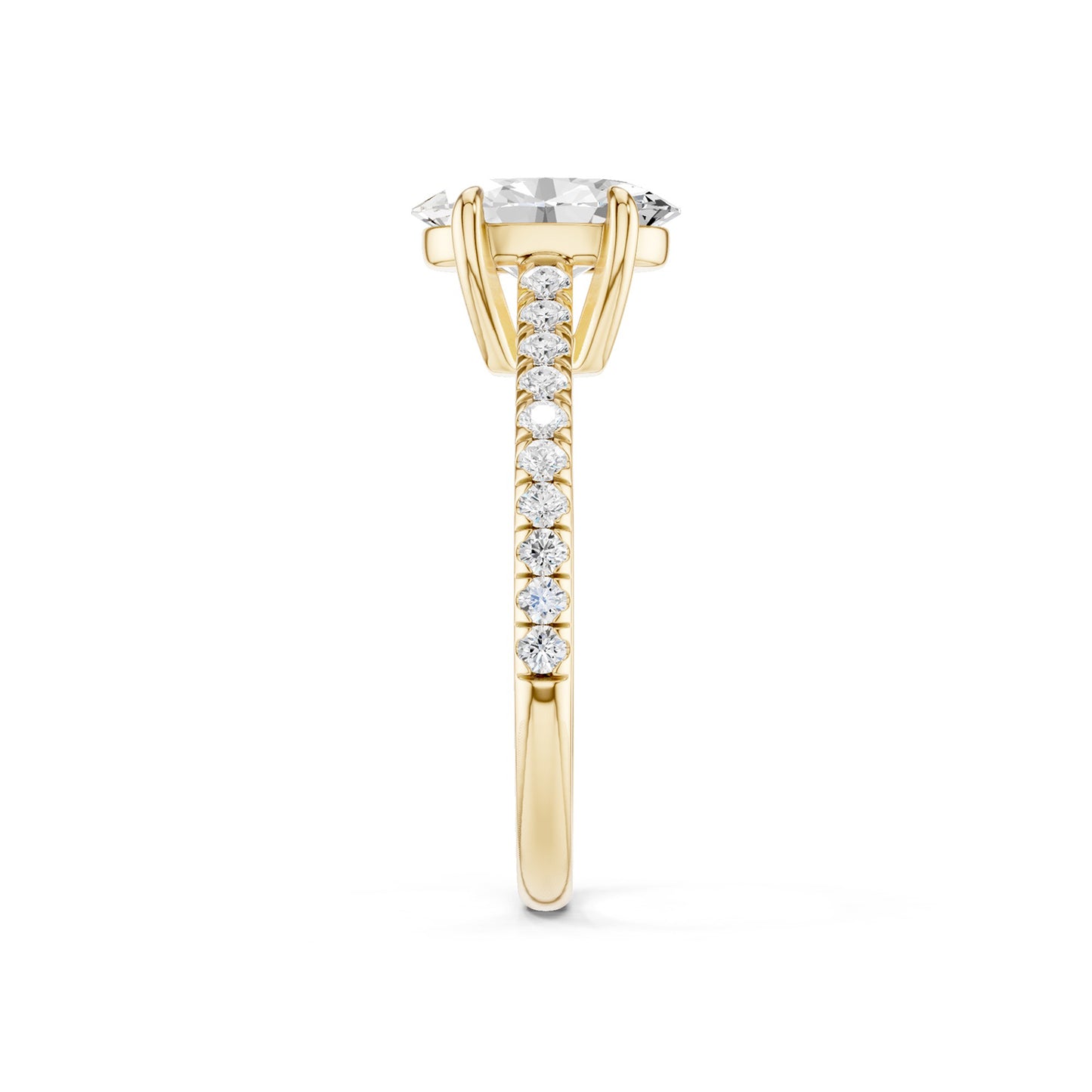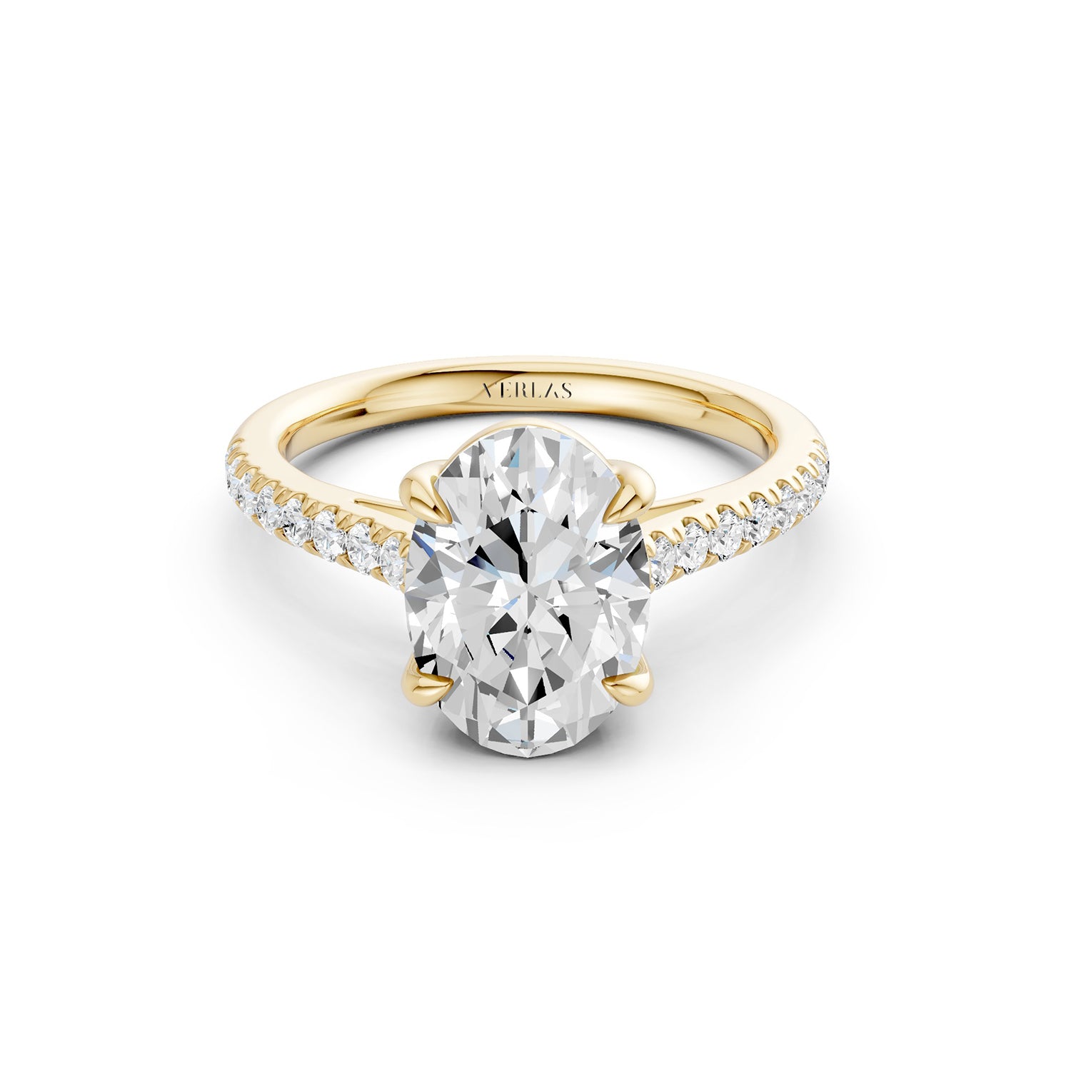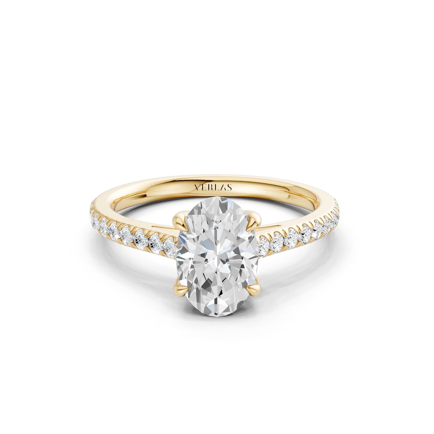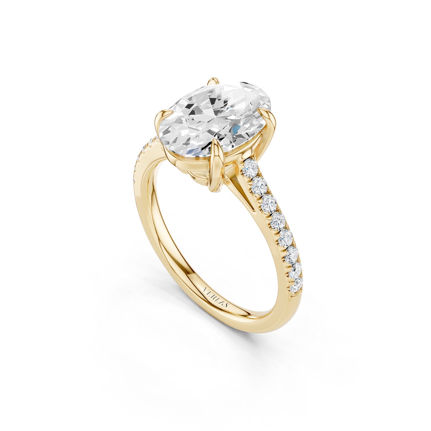 This dainty lab-created oval diamond engagement ring features lab-grown diamonds with sheer sparkle that extends halfway around the ring. The prong-set center diamond is complemented by glittering micro pave diamonds along the shank, giving it an elegant, chic look.
