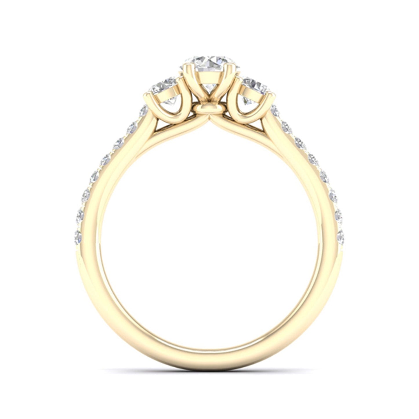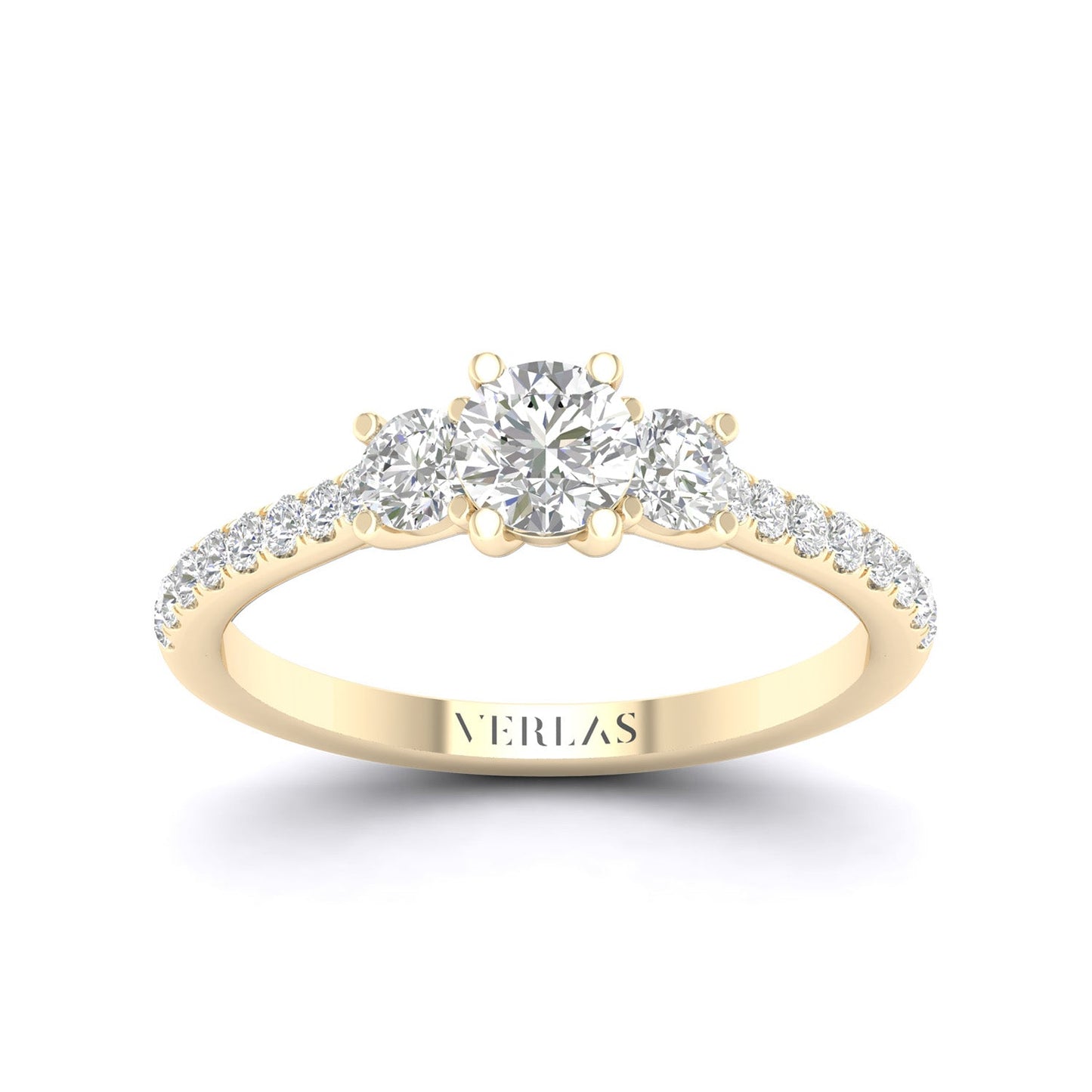 The center diamond in this Embellished Round Vows takes center stage, showcasing its magnificence. Flanked by two smaller diamonds, it symbolizes the enduring partnership of two souls coming together. This round diamond engagement ring is an embodiment of the dreams you share as a couple.