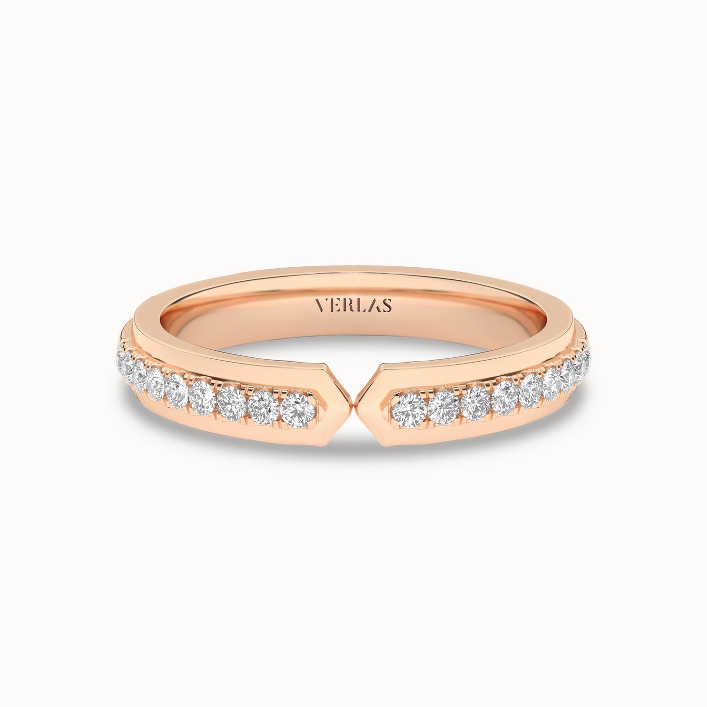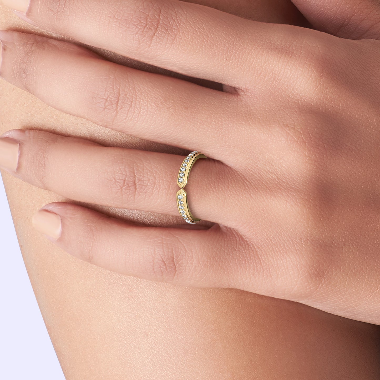 The Embrace Band’s striking appearance is characterized by a row of dazzling diamonds, thoughtfully interspersed with a pinch design at the center. This unique detail adds depth and character to the band, creating an engaging visual that sets it apart as an exceptional diamond stacking ring.
