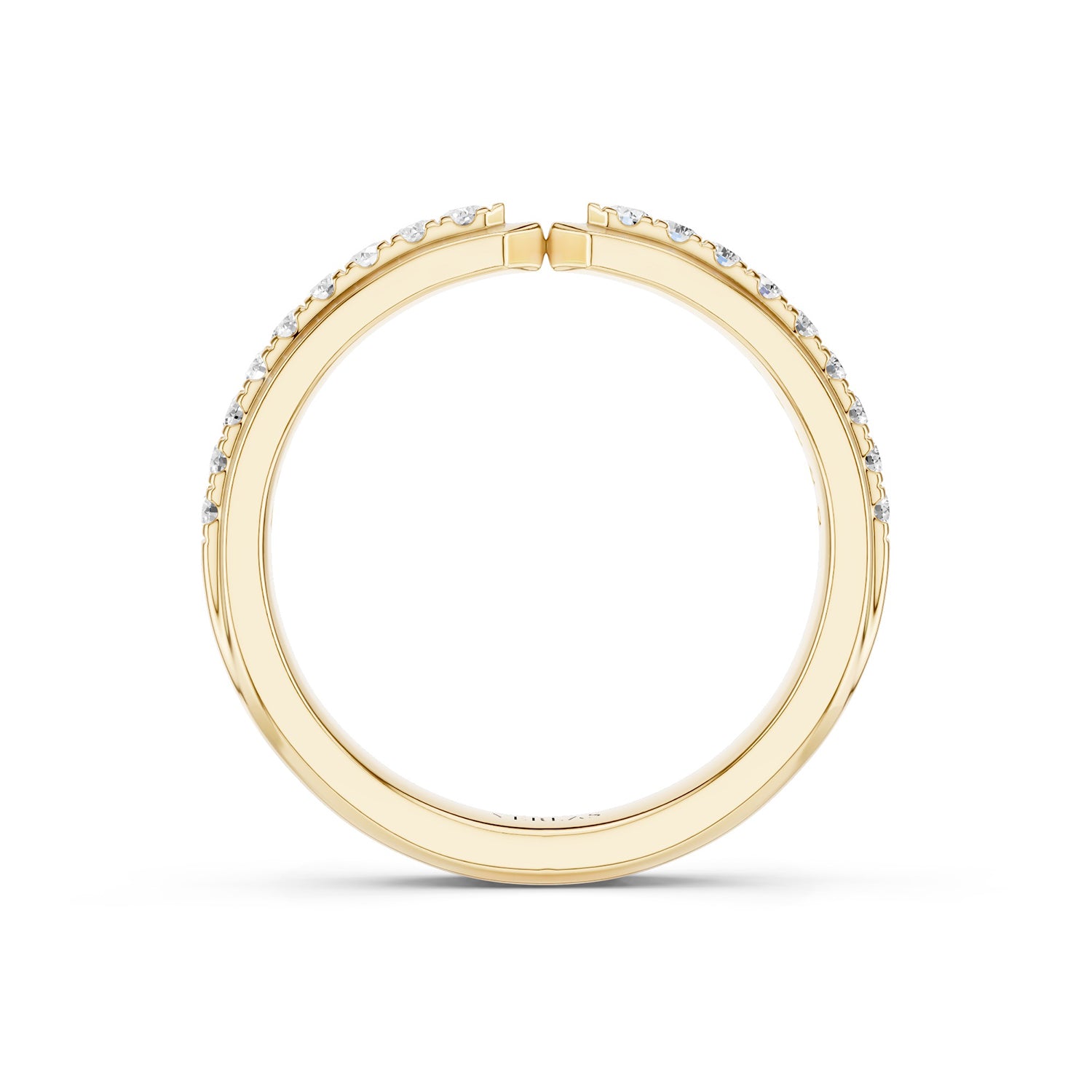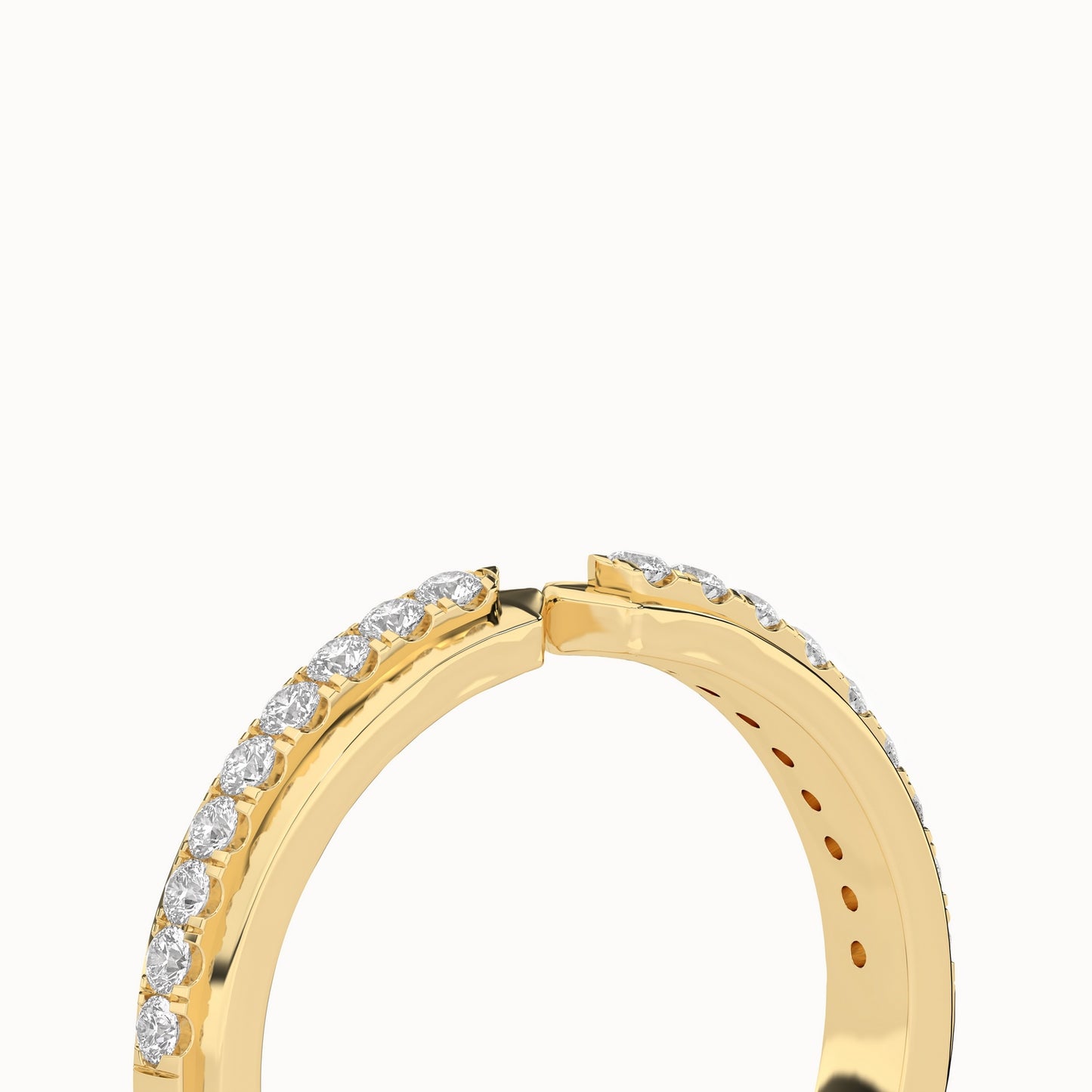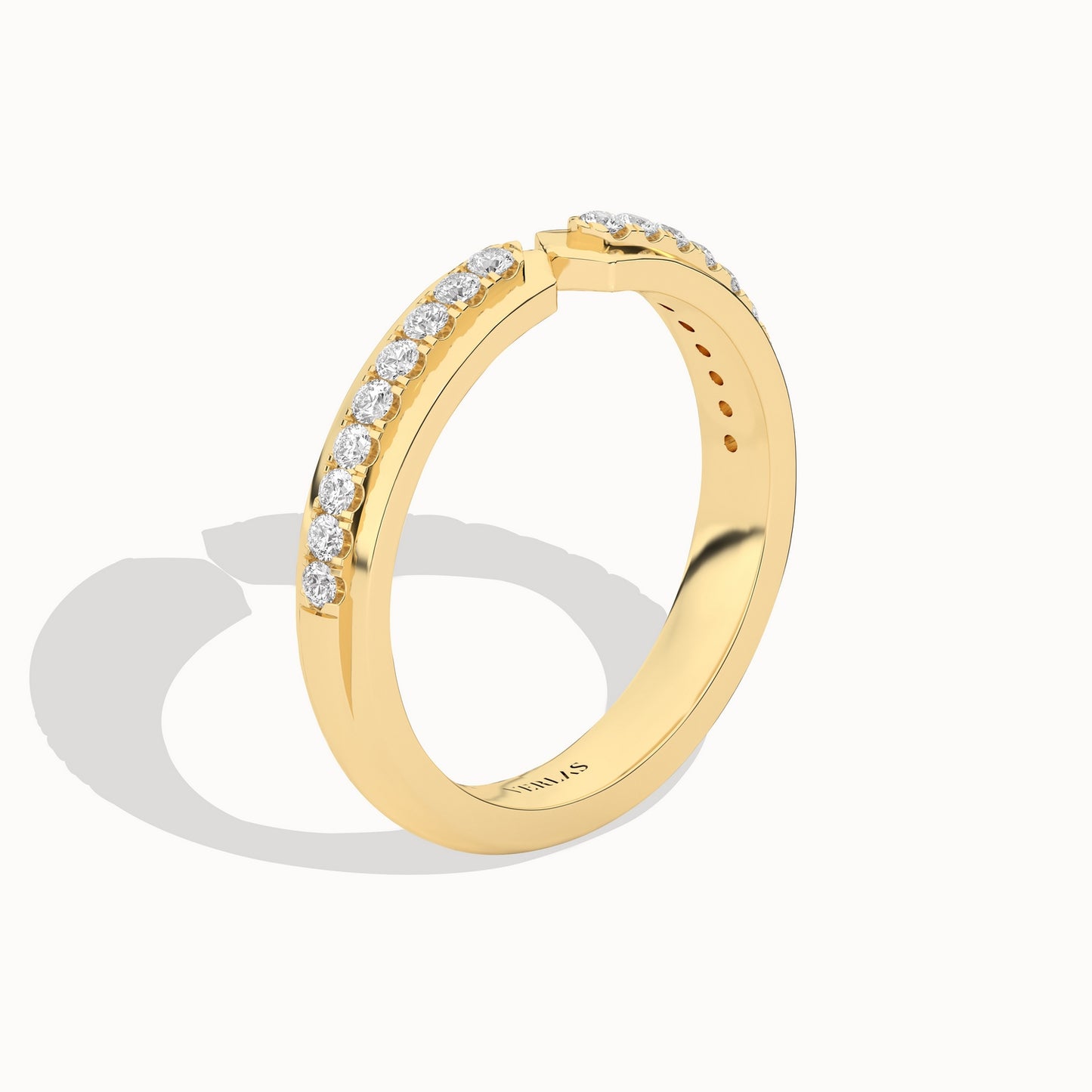 The Embrace Band’s striking appearance is characterized by a row of dazzling diamonds, thoughtfully interspersed with a pinch design at the center. This unique detail adds depth and character to the band, creating an engaging visual that sets it apart as an exceptional diamond stacking ring.