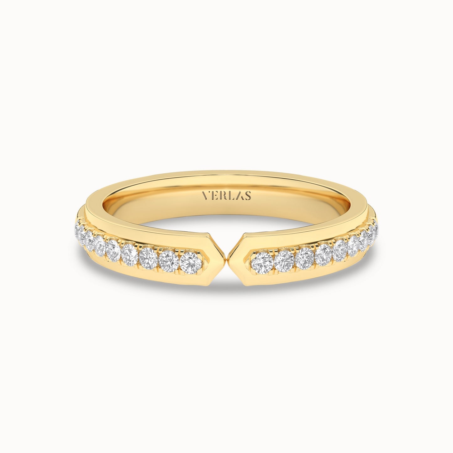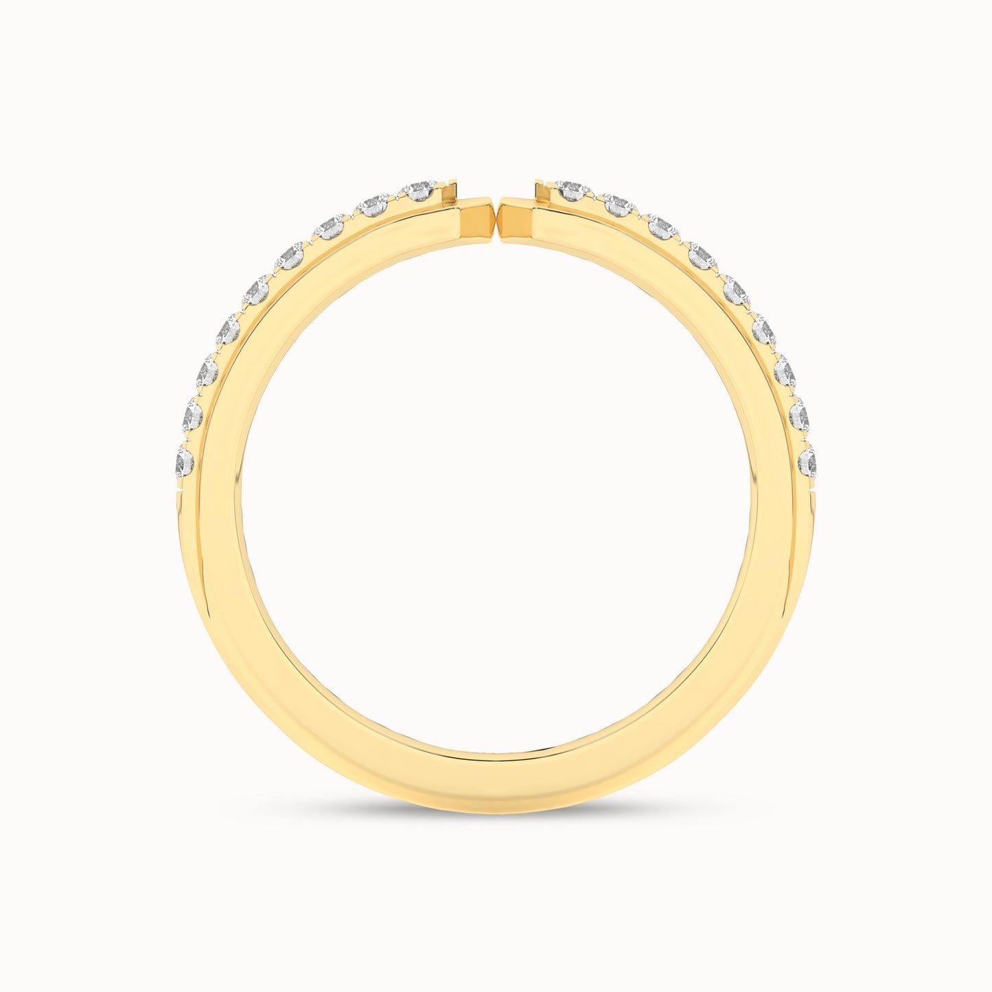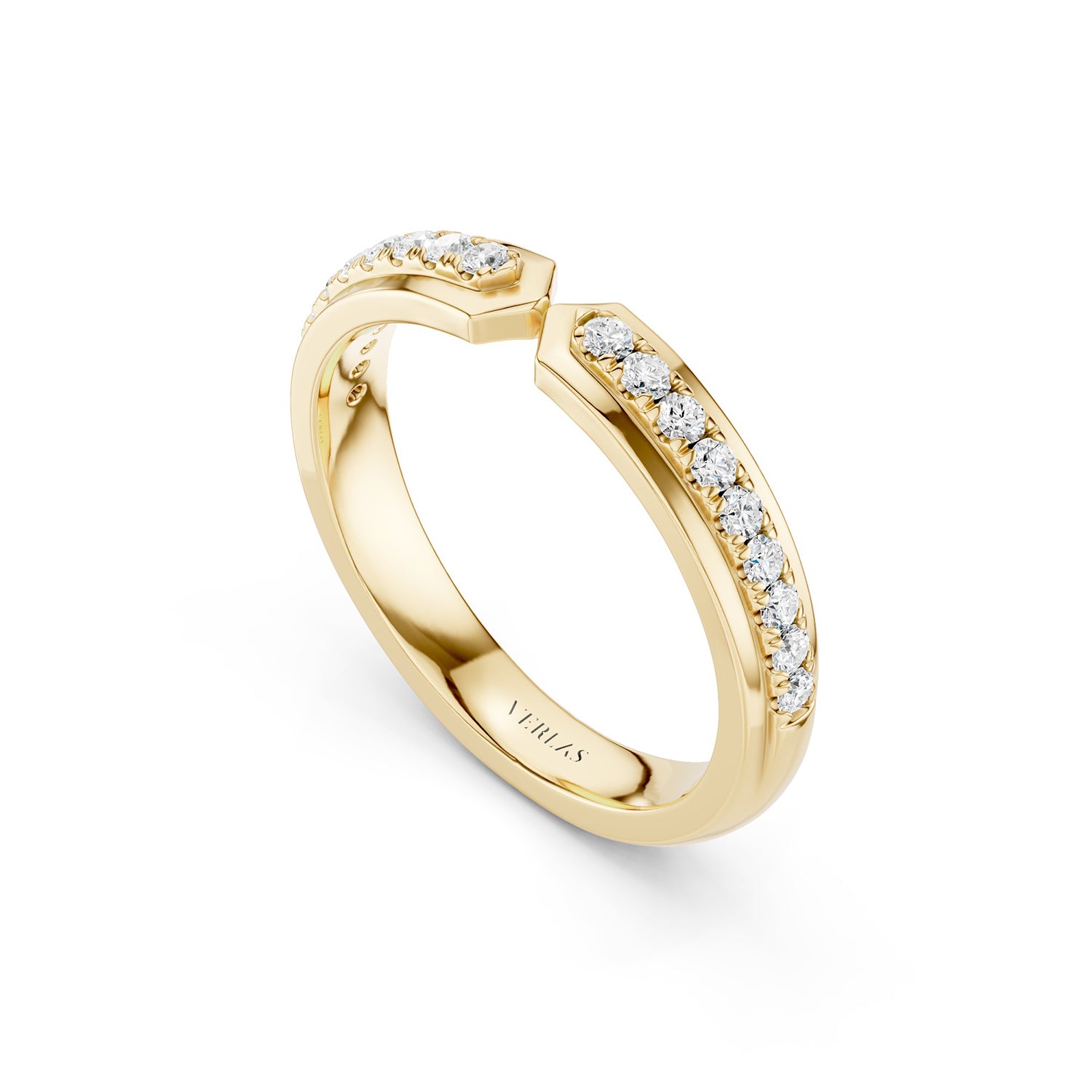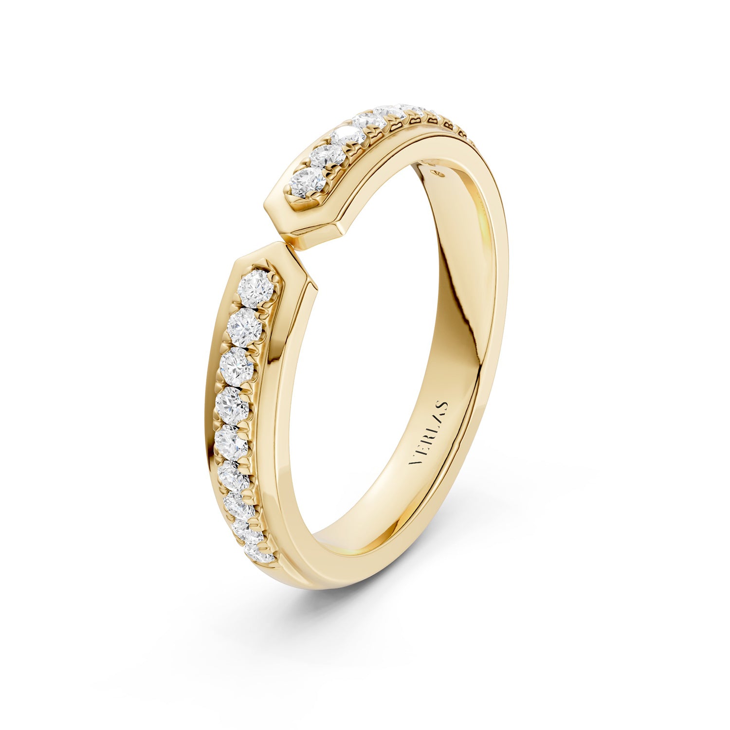 The Embrace Band’s striking appearance is characterized by a row of dazzling diamonds, thoughtfully interspersed with a pinch design at the center. This unique detail adds depth and character to the band, creating an engaging visual that sets it apart as an exceptional diamond stacking ring.