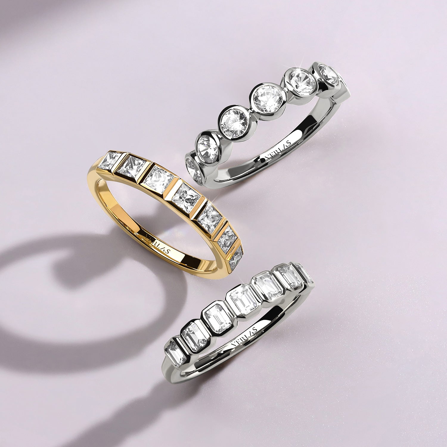 Blending contemporary design with classic appeal, the Bezel-Set Half-Eternity Diamond Band features ethereal diamonds securely encased in smooth bezels. This refined design balances durability with style, a versatile option for everyday elegance or celebratory occasions. Explore the entire range here