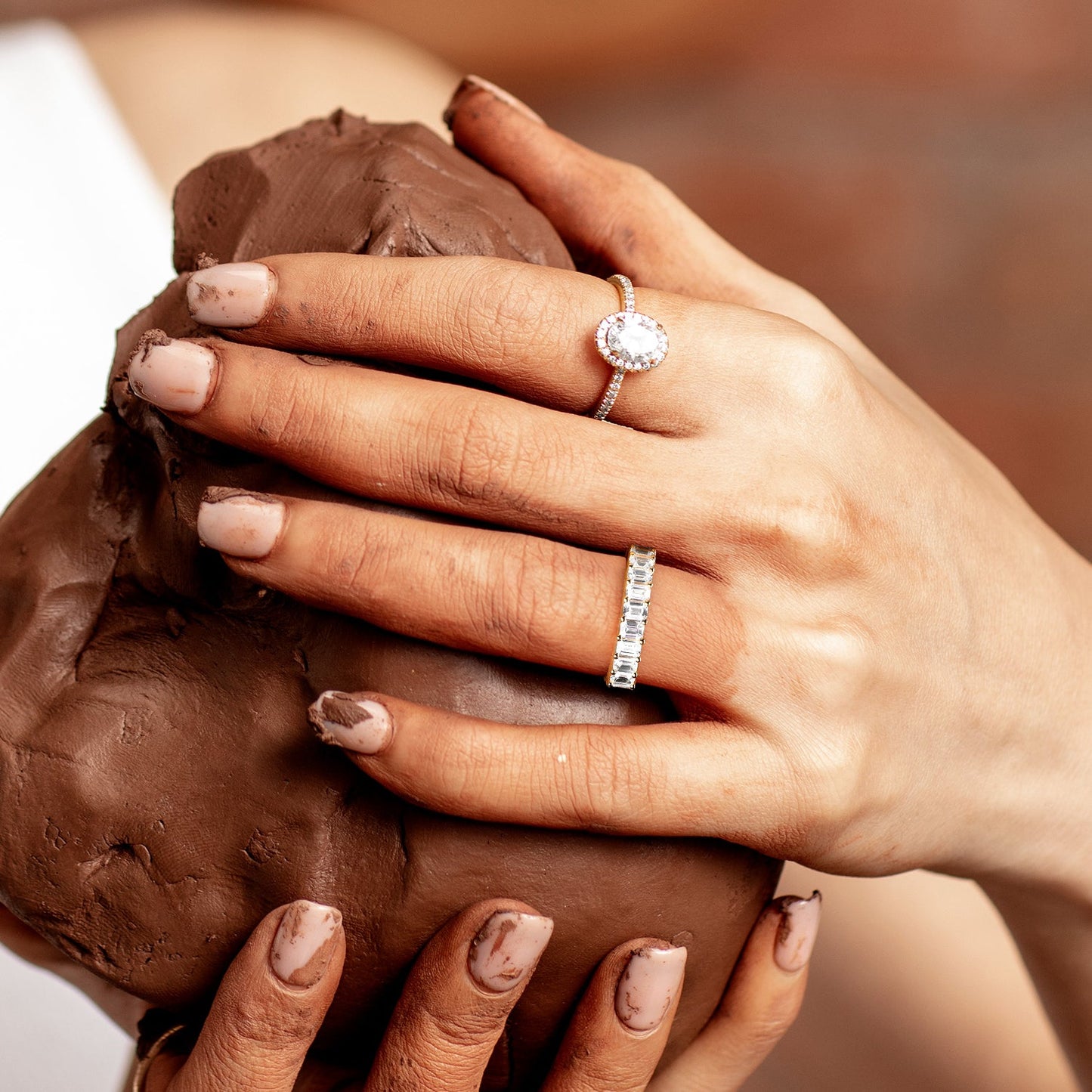 Symbolizing the never-ending love, this eternity band consists of a continuous line of emerald shape lab-grown diamonds. A beautiful alternative to a traditional wedding band, the band encircles the finger with pure radiance.