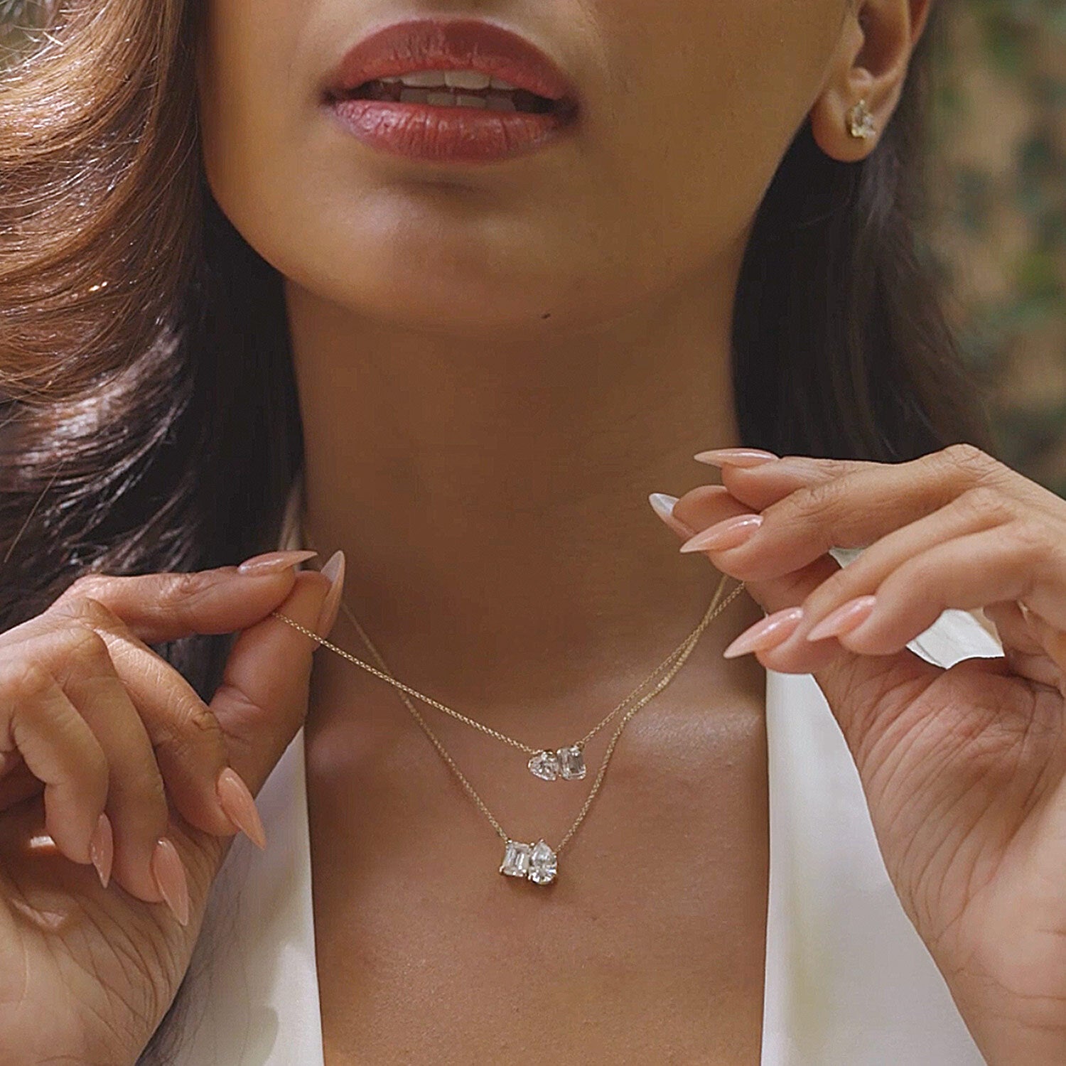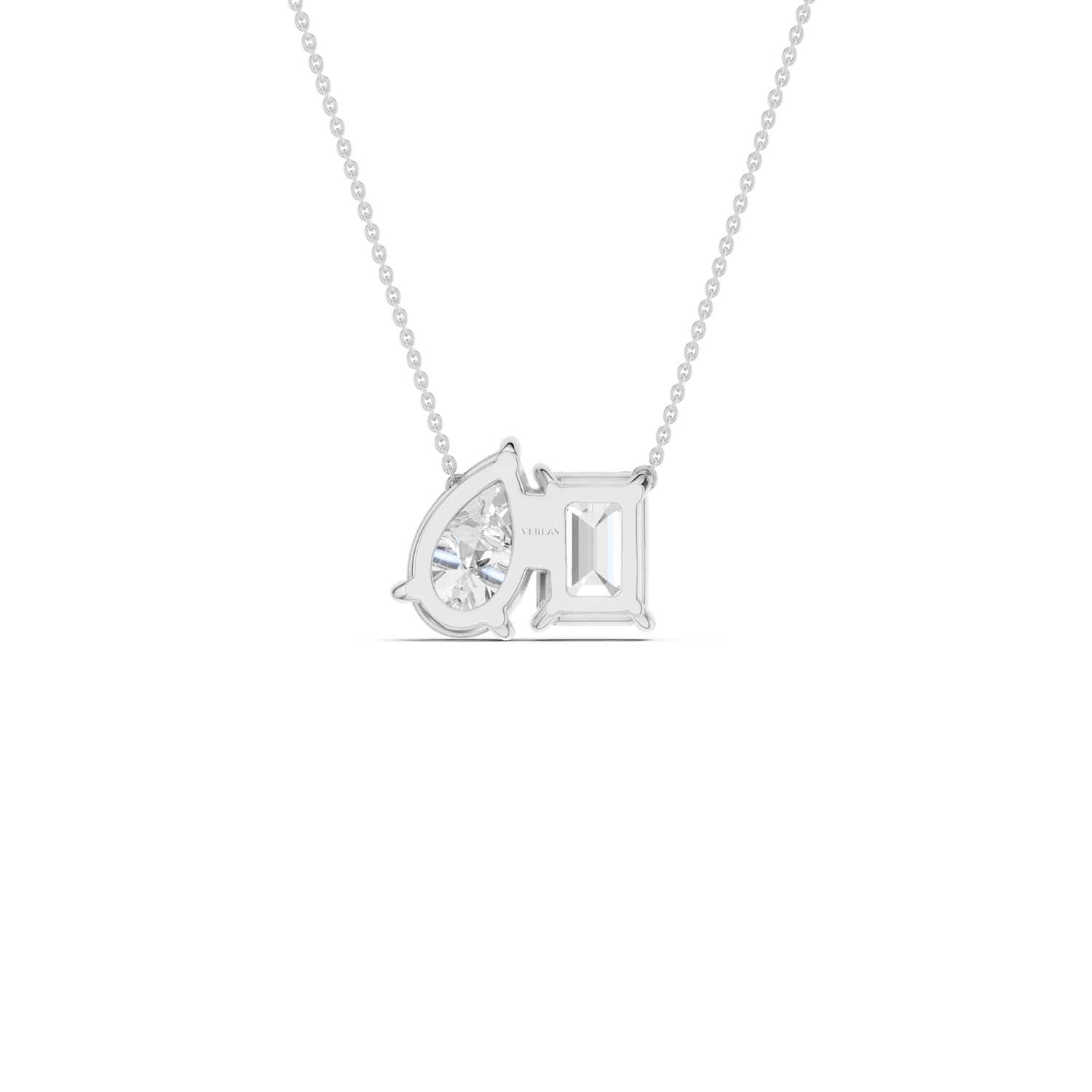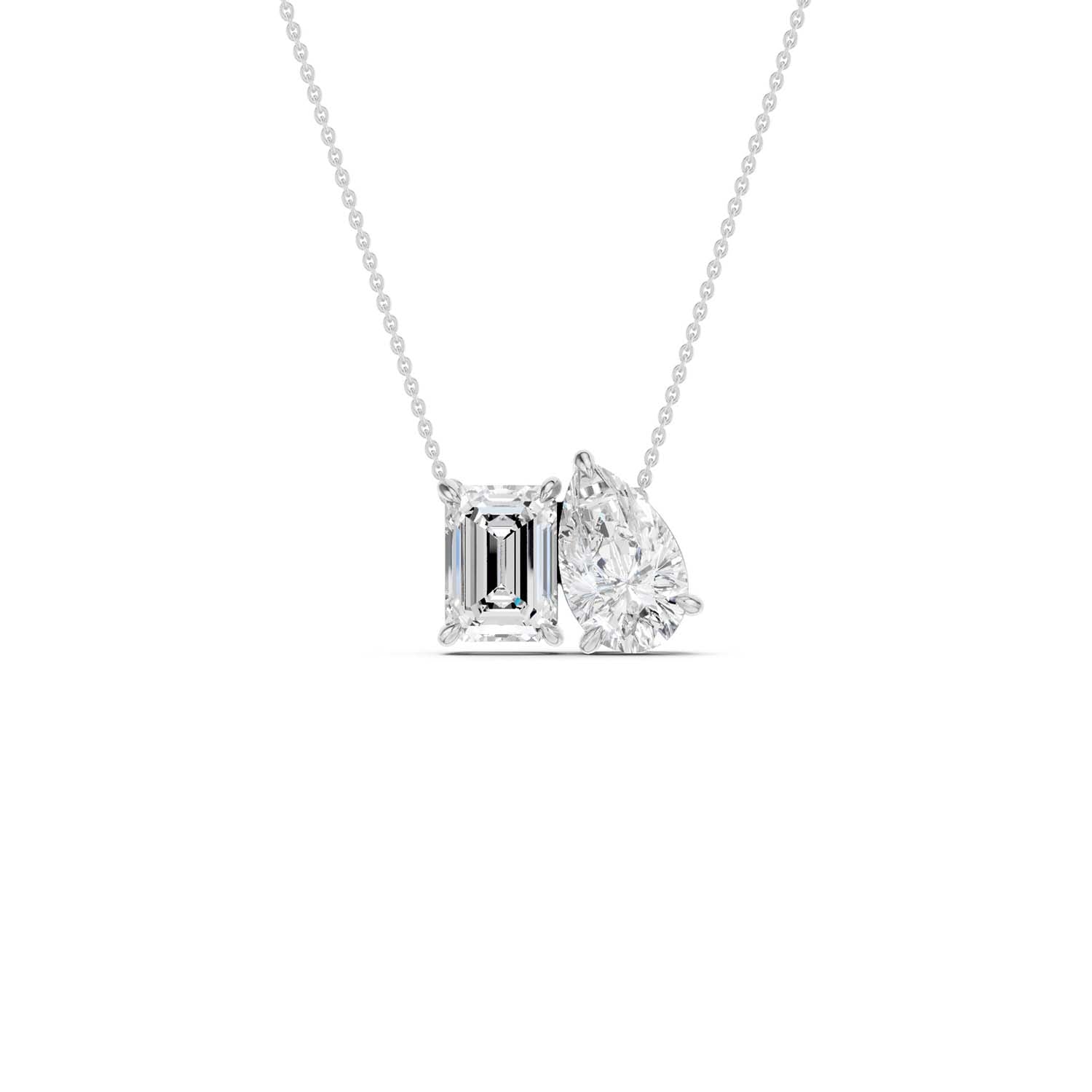 The emerald-cut diamond, with its step-cut facets and pear-cut diamond's graceful curves, creates a captivating core that adds a touch of uniqueness to this two stone necklace. Crafted with love, the diamonds are securely held in a prong setting. The design of this Toi et Moi necklace transcends trends, making it a timeless piece that you can cherish for generations to come.