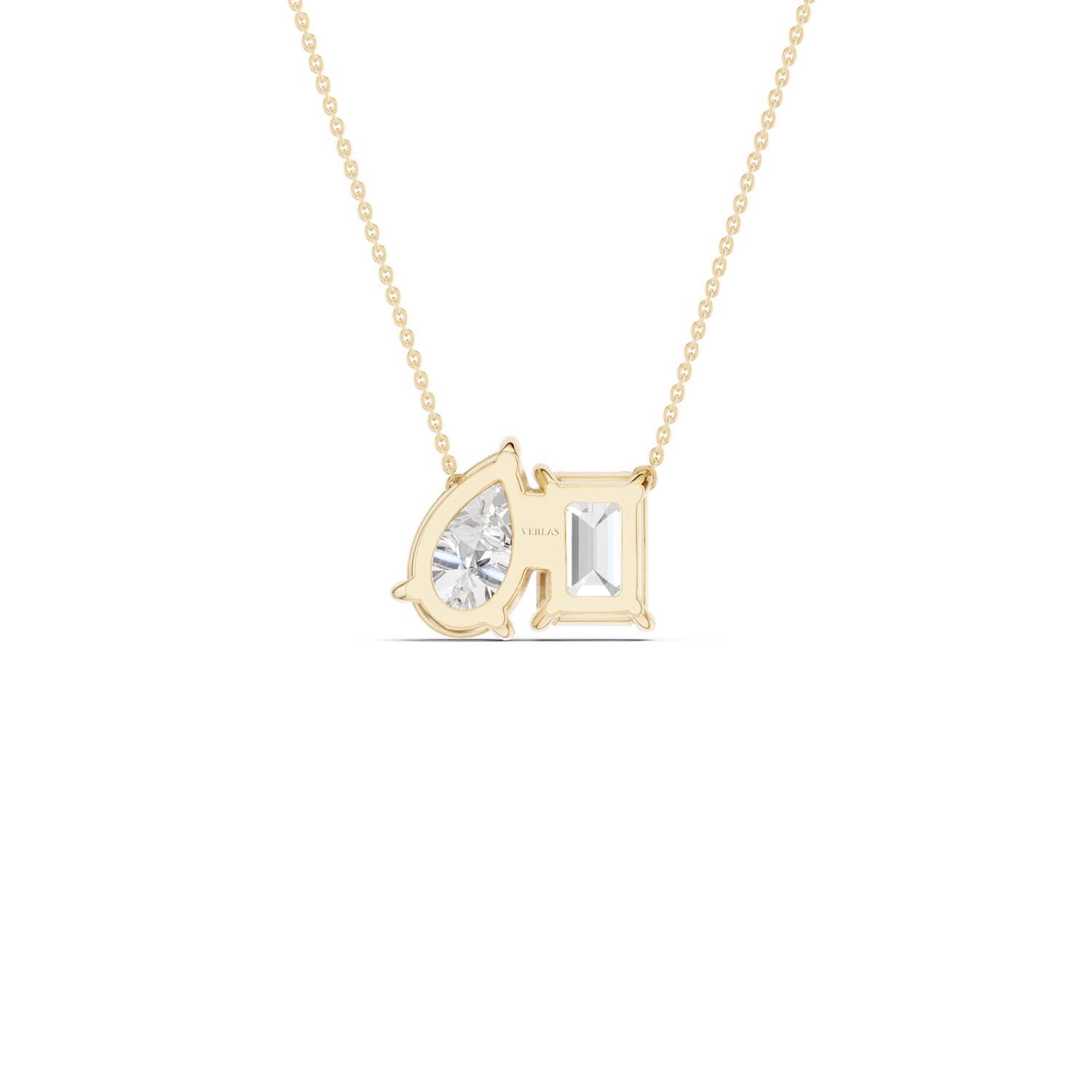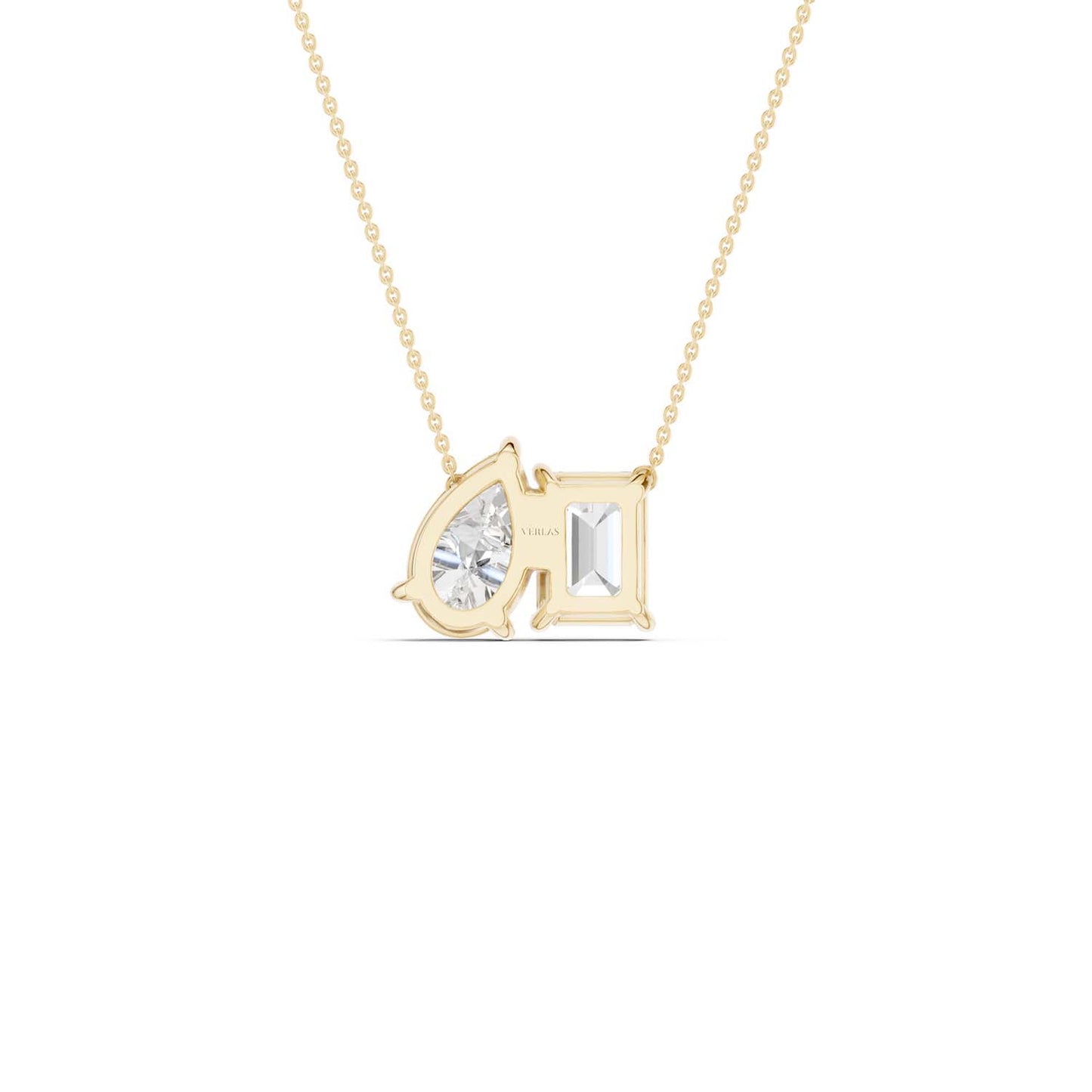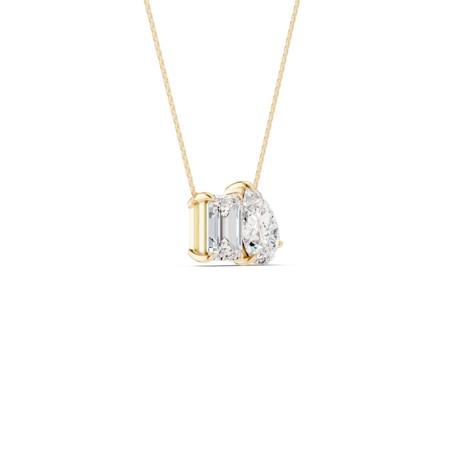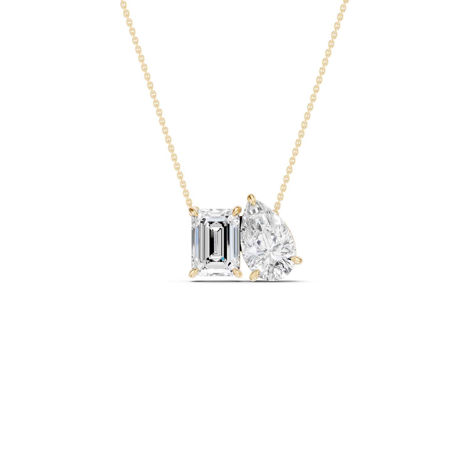 The emerald-cut diamond, with its step-cut facets and pear-cut diamond's graceful curves, creates a captivating core that adds a touch of uniqueness to this two stone necklace. Crafted with love, the diamonds are securely held in a prong setting. The design of this Toi et Moi necklace transcends trends, making it a timeless piece that you can cherish for generations to come.