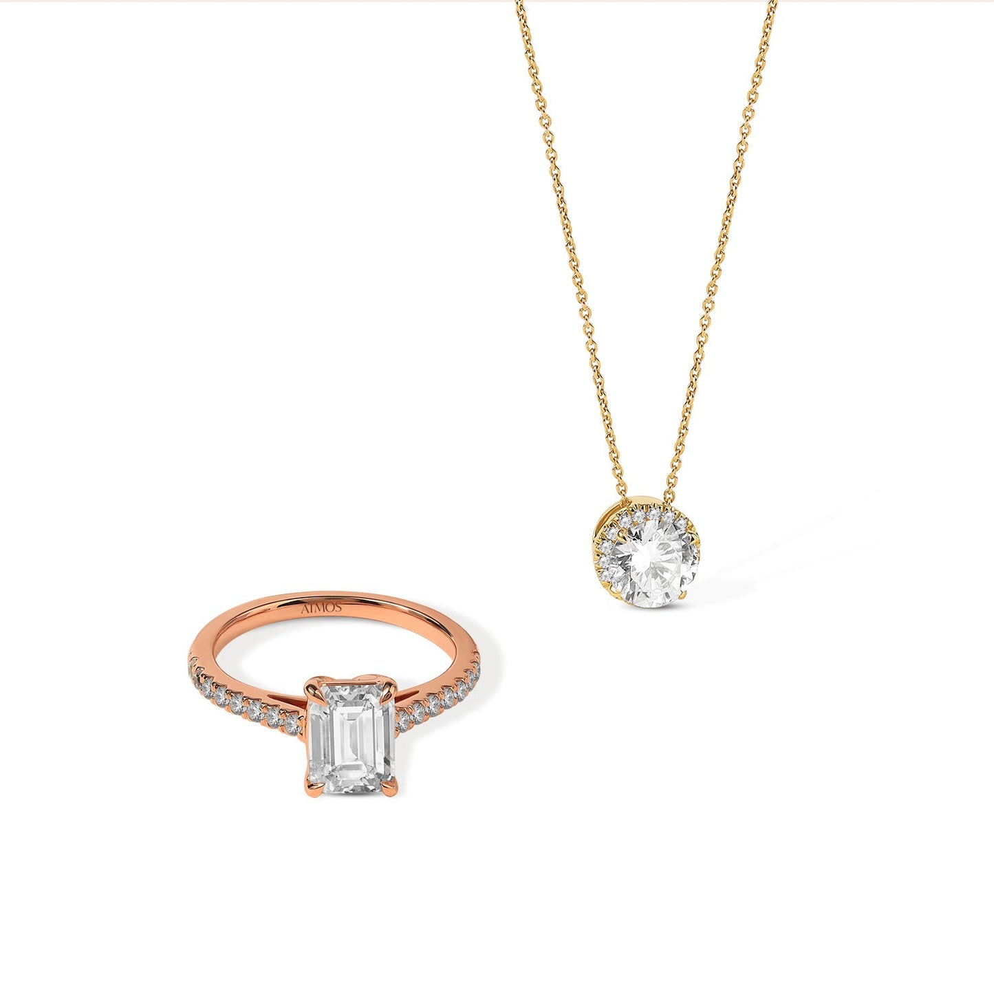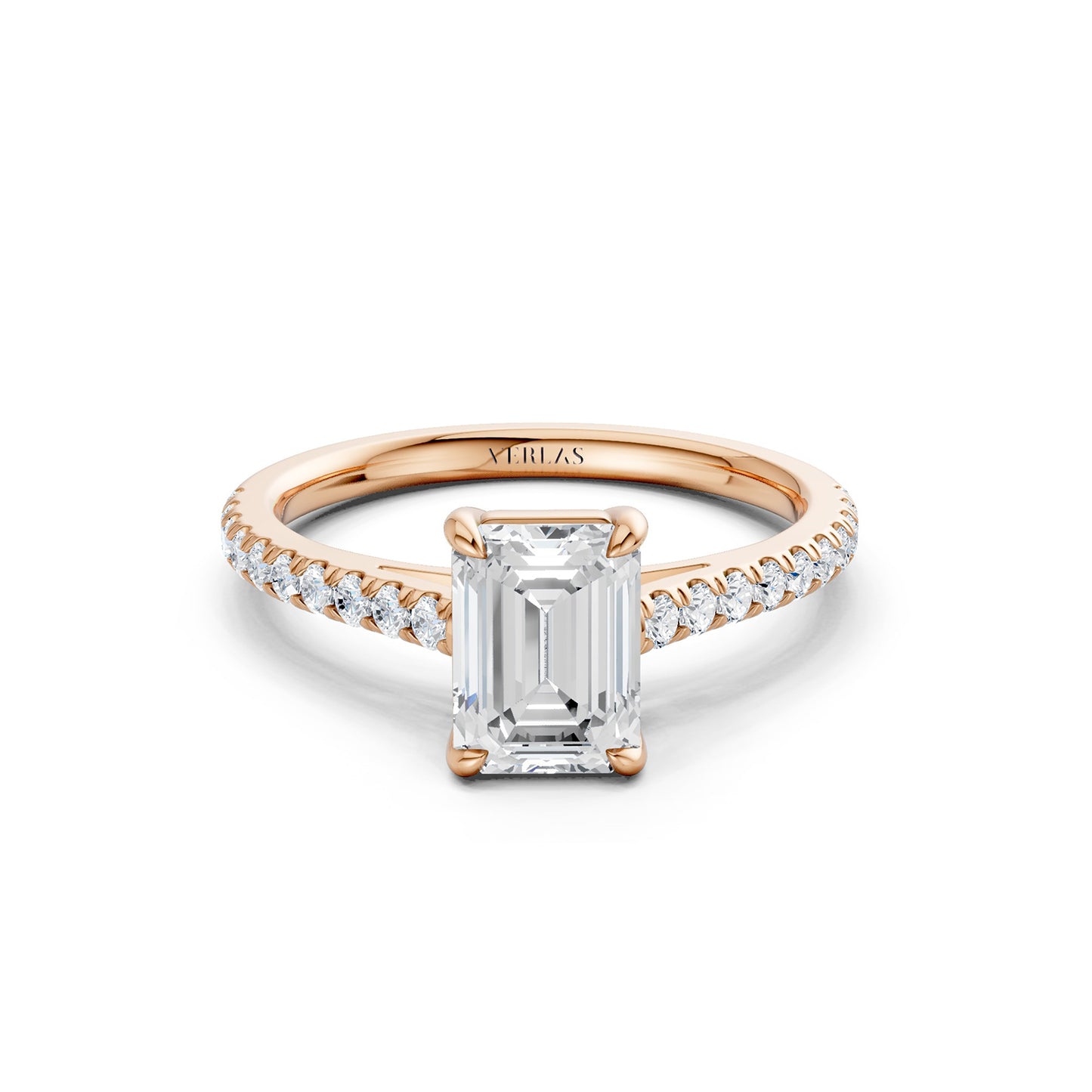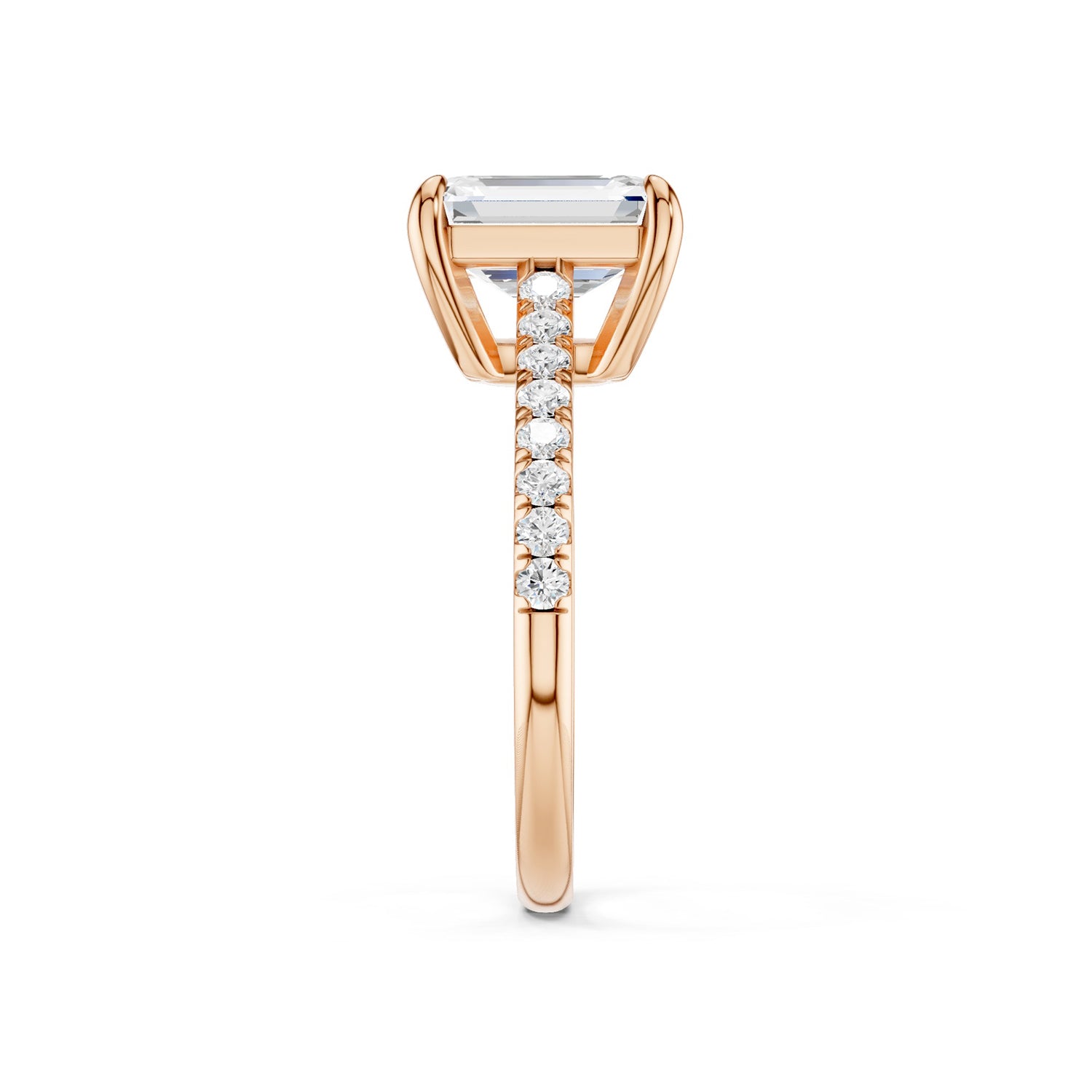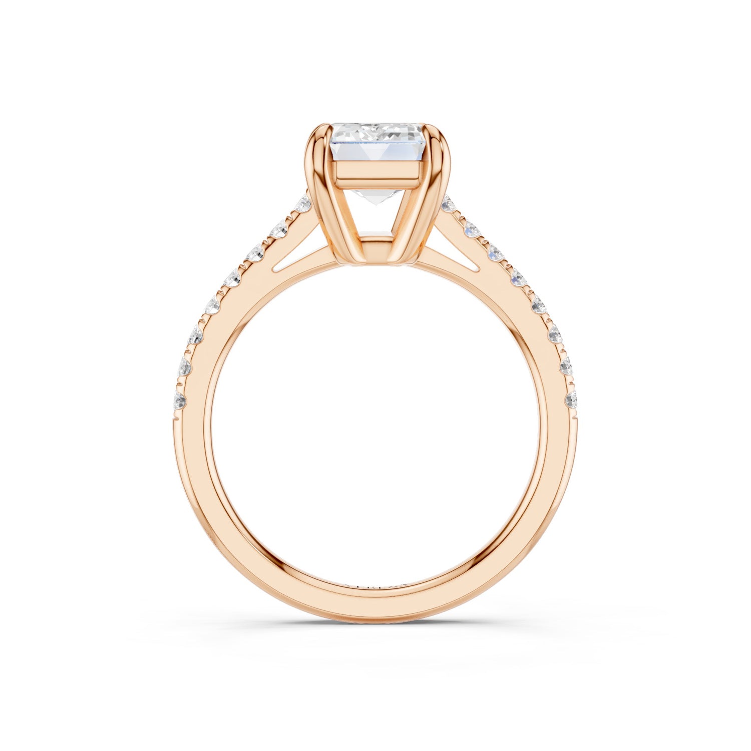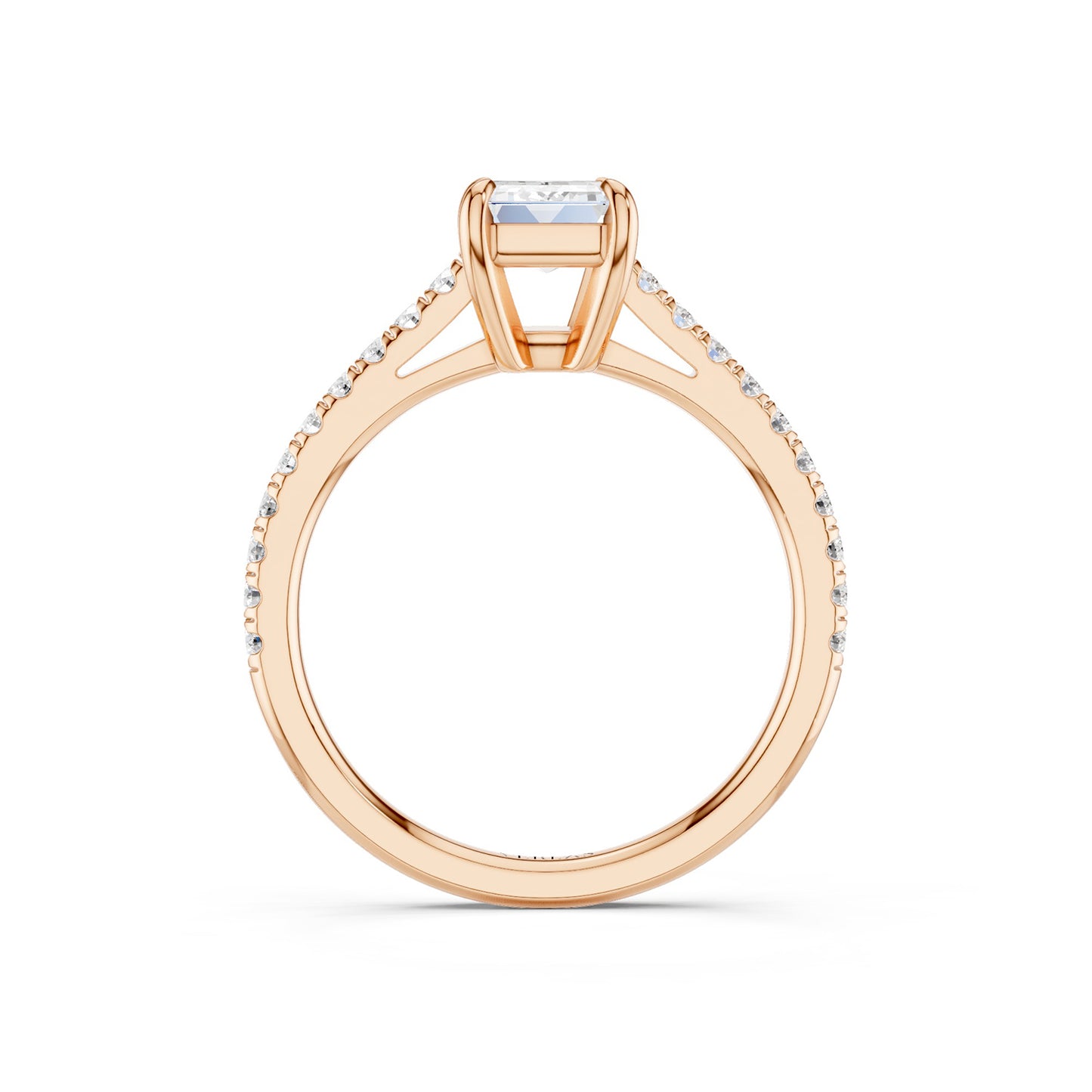 The emerald-cut lab-grown engagement ring is cut for brilliance with four prongs, giving it a feminine spirit. A lustrous band of micro-pavé-set diamonds lends these brilliantly-designed Atmos ring a modern edge.