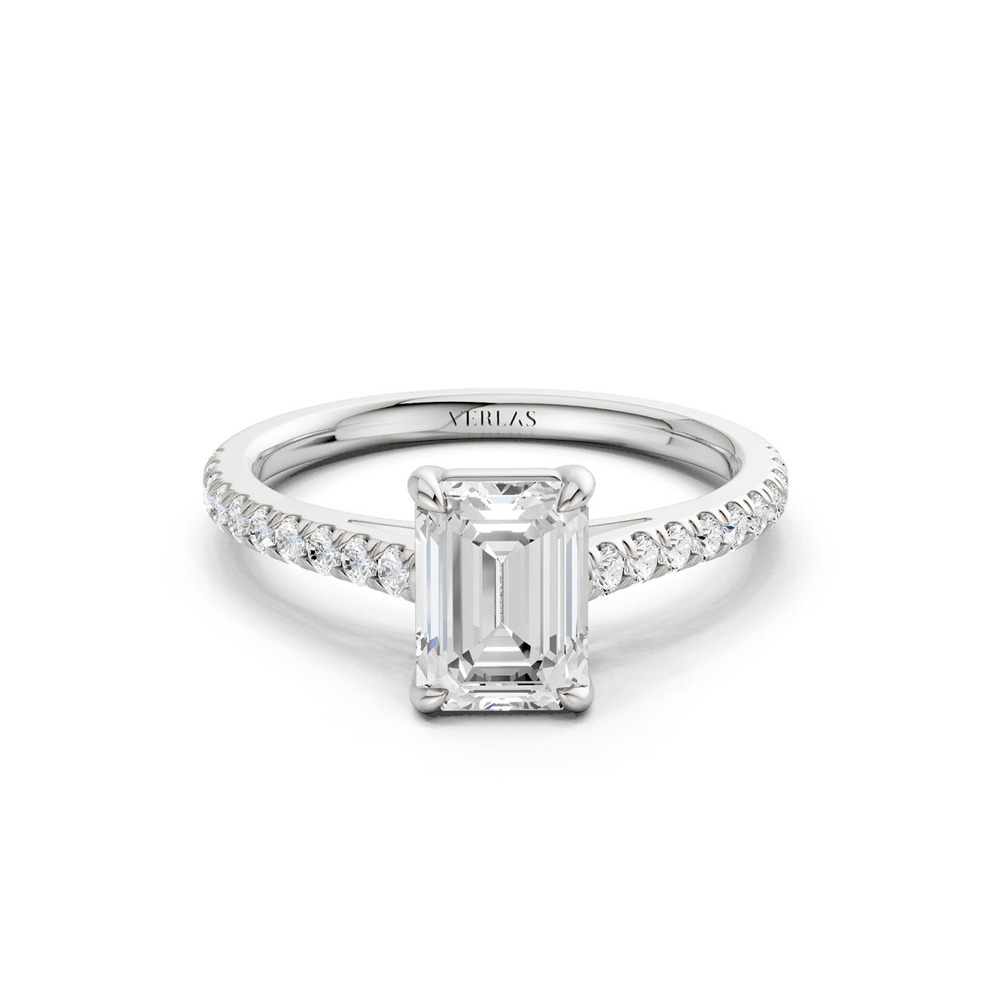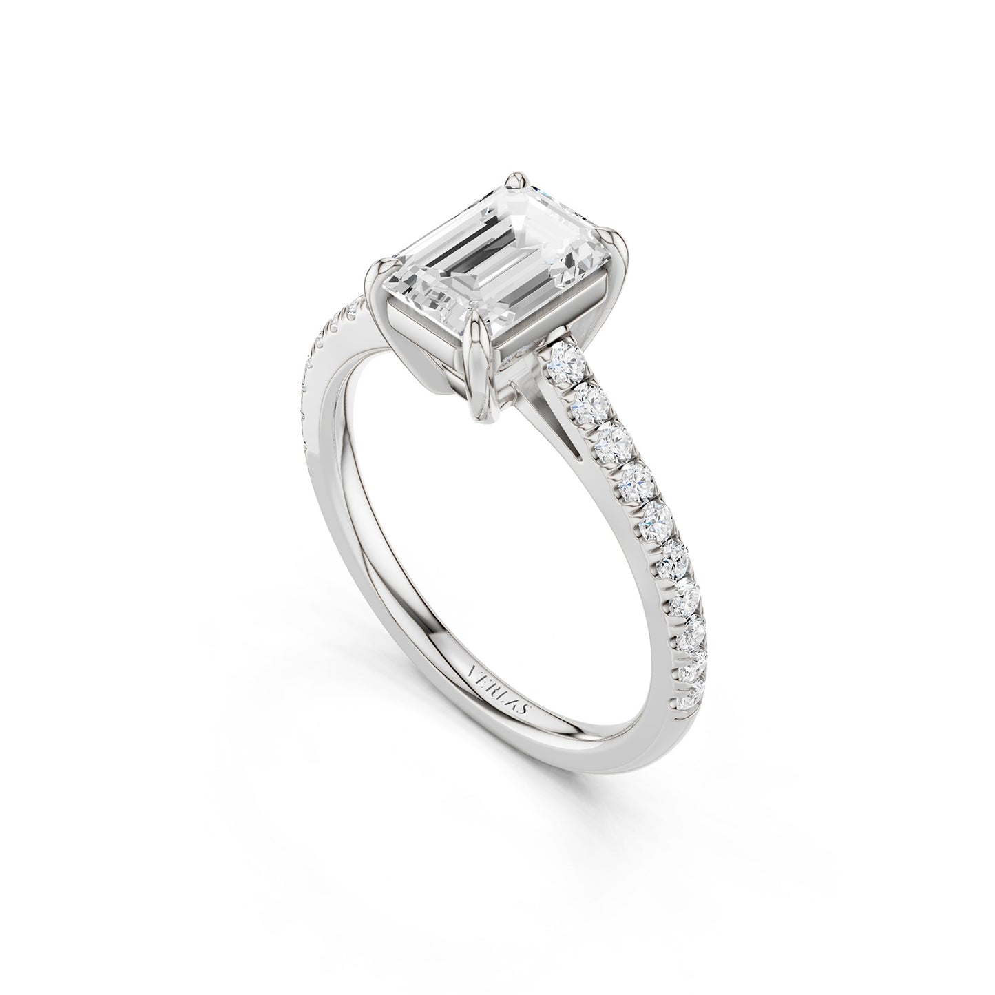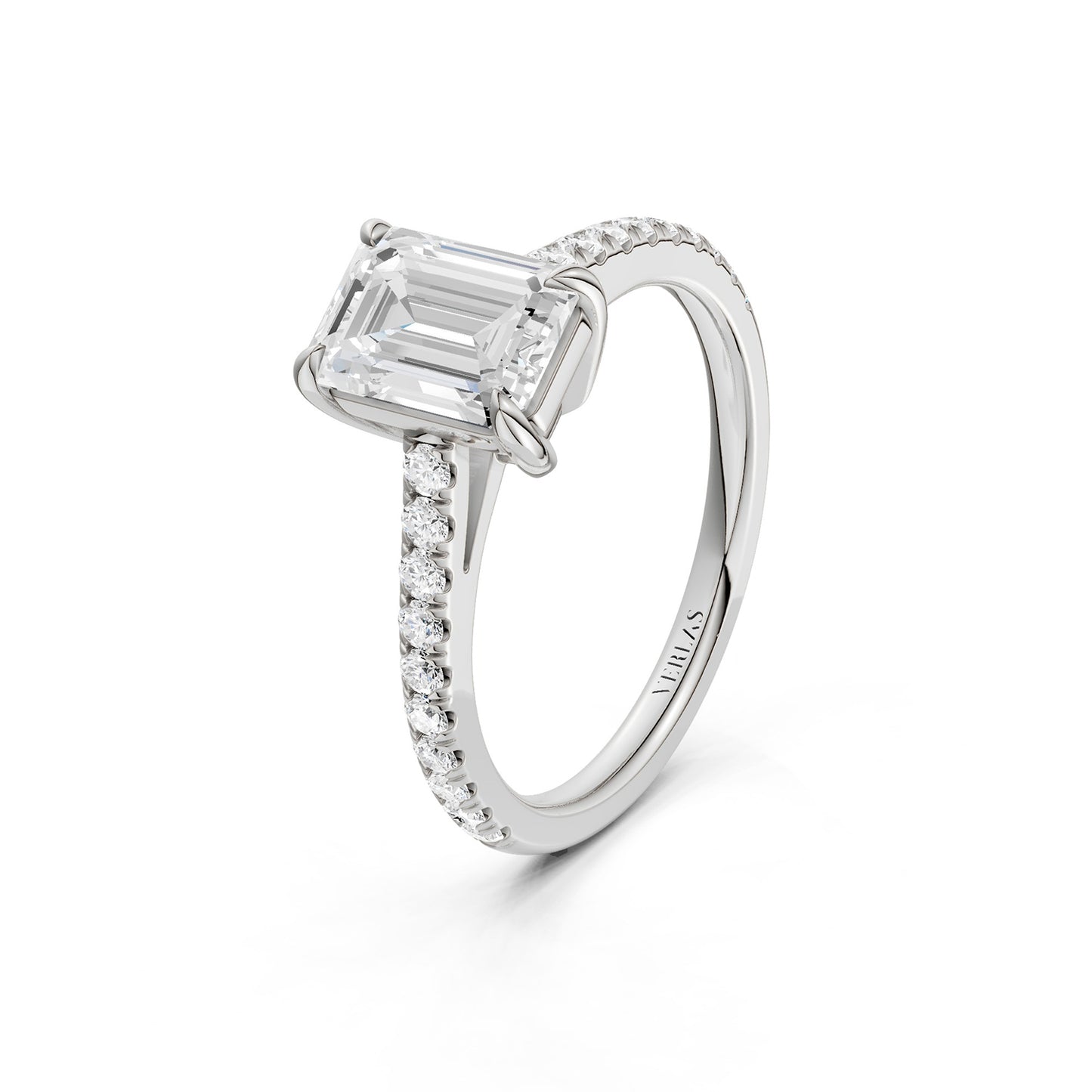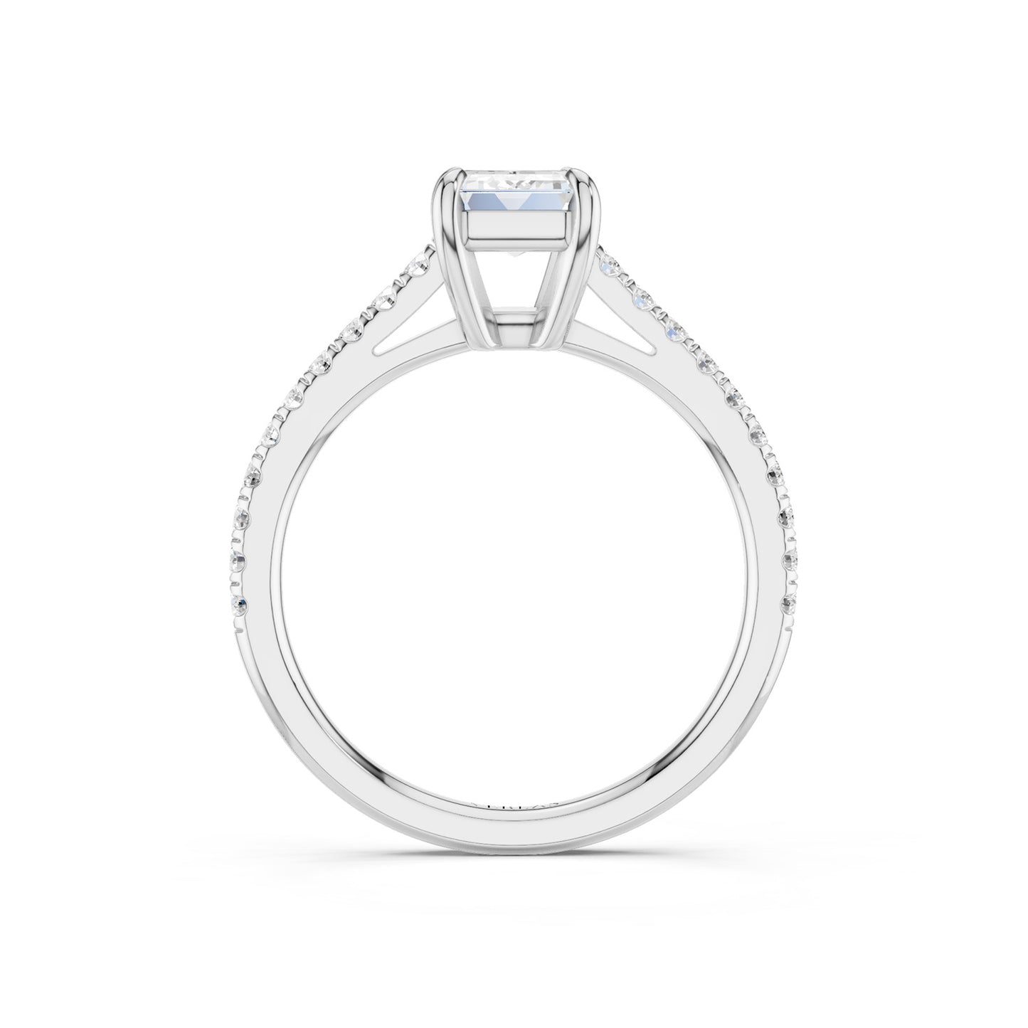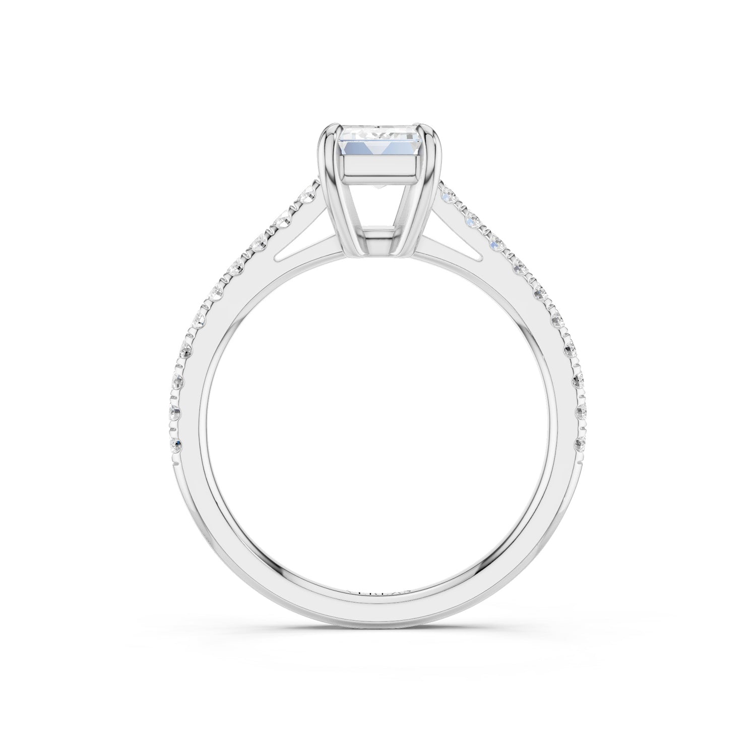 The emerald-cut lab-grown engagement ring is cut for brilliance with four prongs, giving it a feminine spirit. A lustrous band of micro-pavé-set diamonds lends these brilliantly-designed Atmos ring a modern edge.