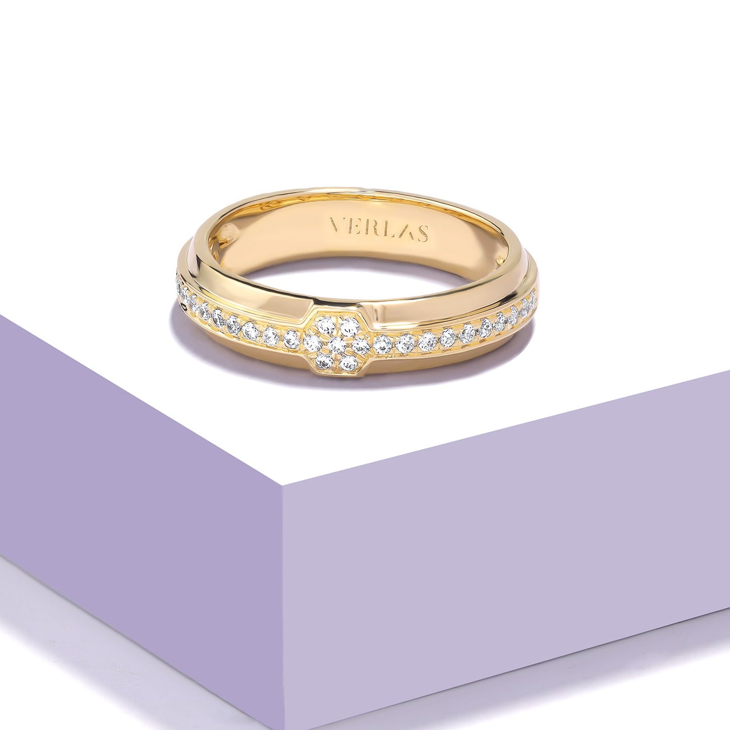 The Hexagon Trailing Band is a modern band with a unique and captivating hexagonal design of round diamonds set on a gold band. This stylish and edgy band is sure to turn heads.