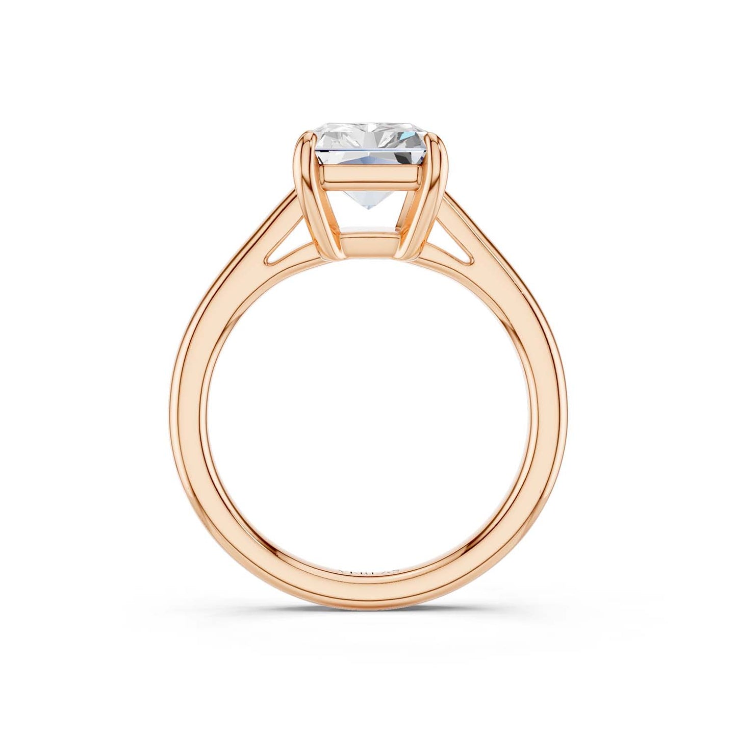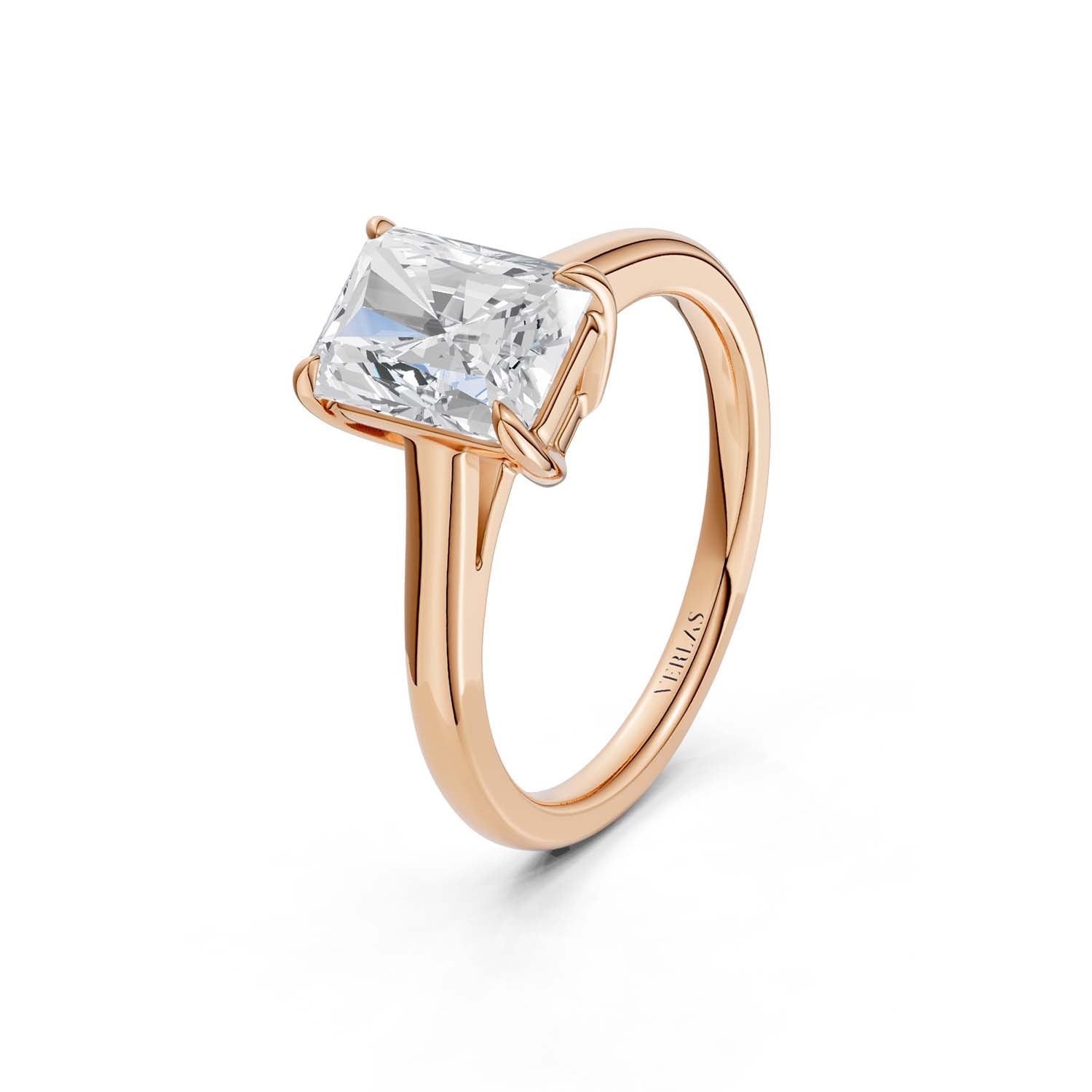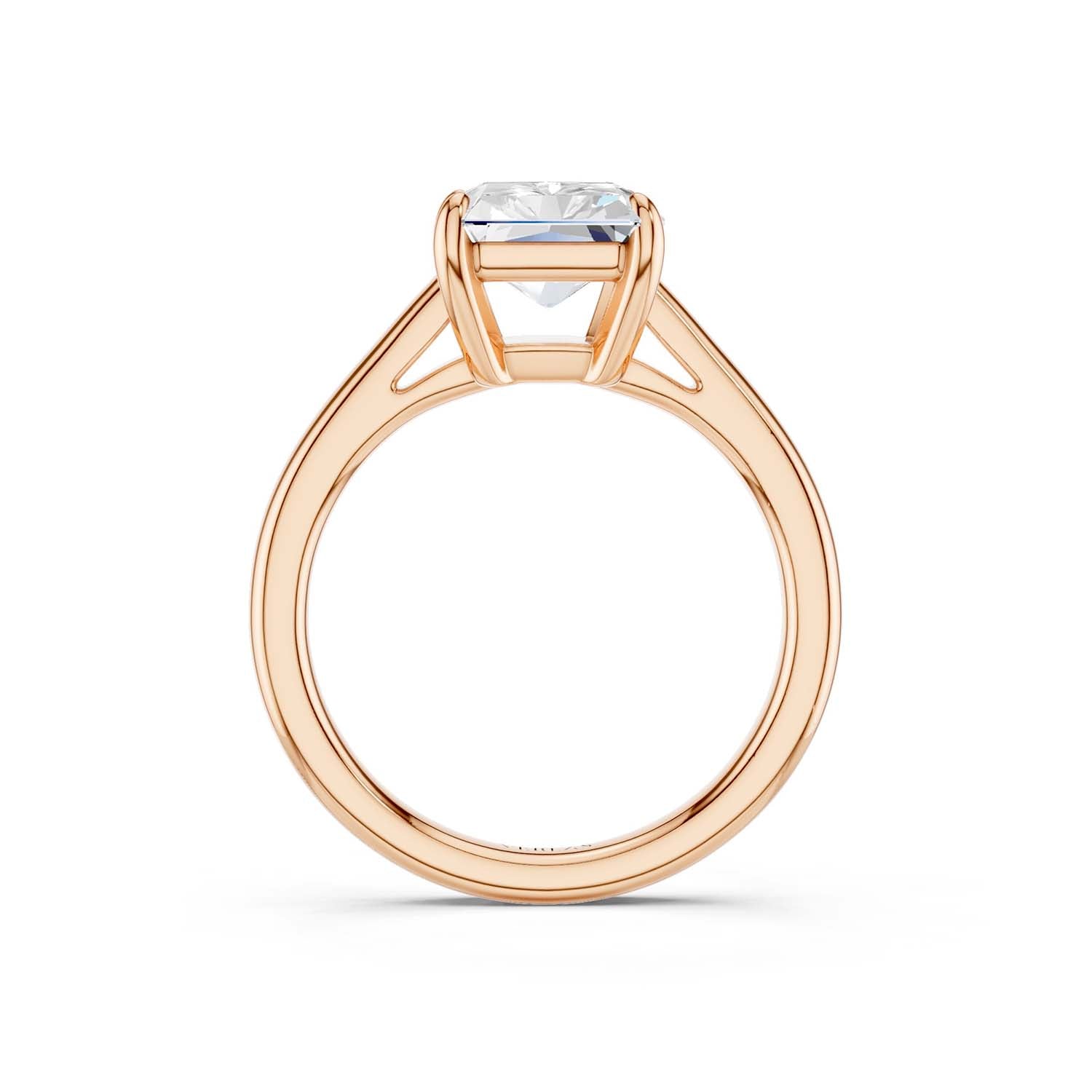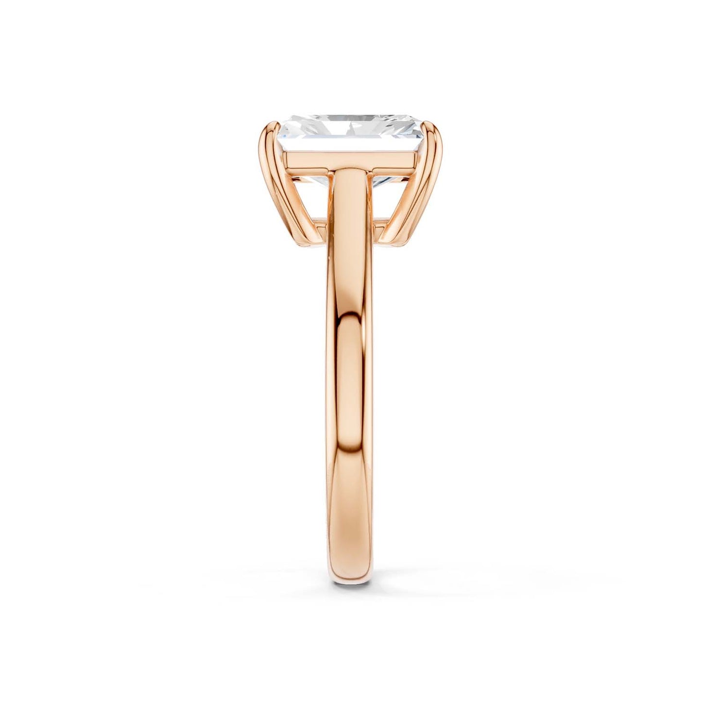 This elegant solitaire lab-grown diamond ring features an open basket with four claw prongs that cradle the center radiant-cut diamond. The lustrous gold band adds to the sleek, classic look of the design.