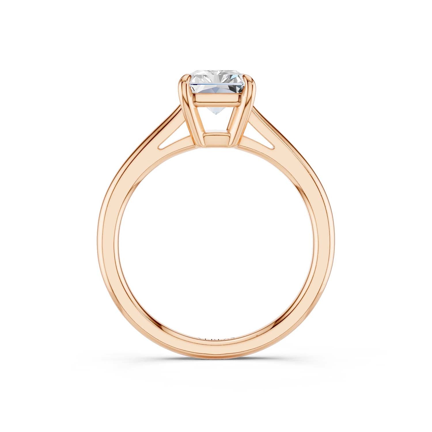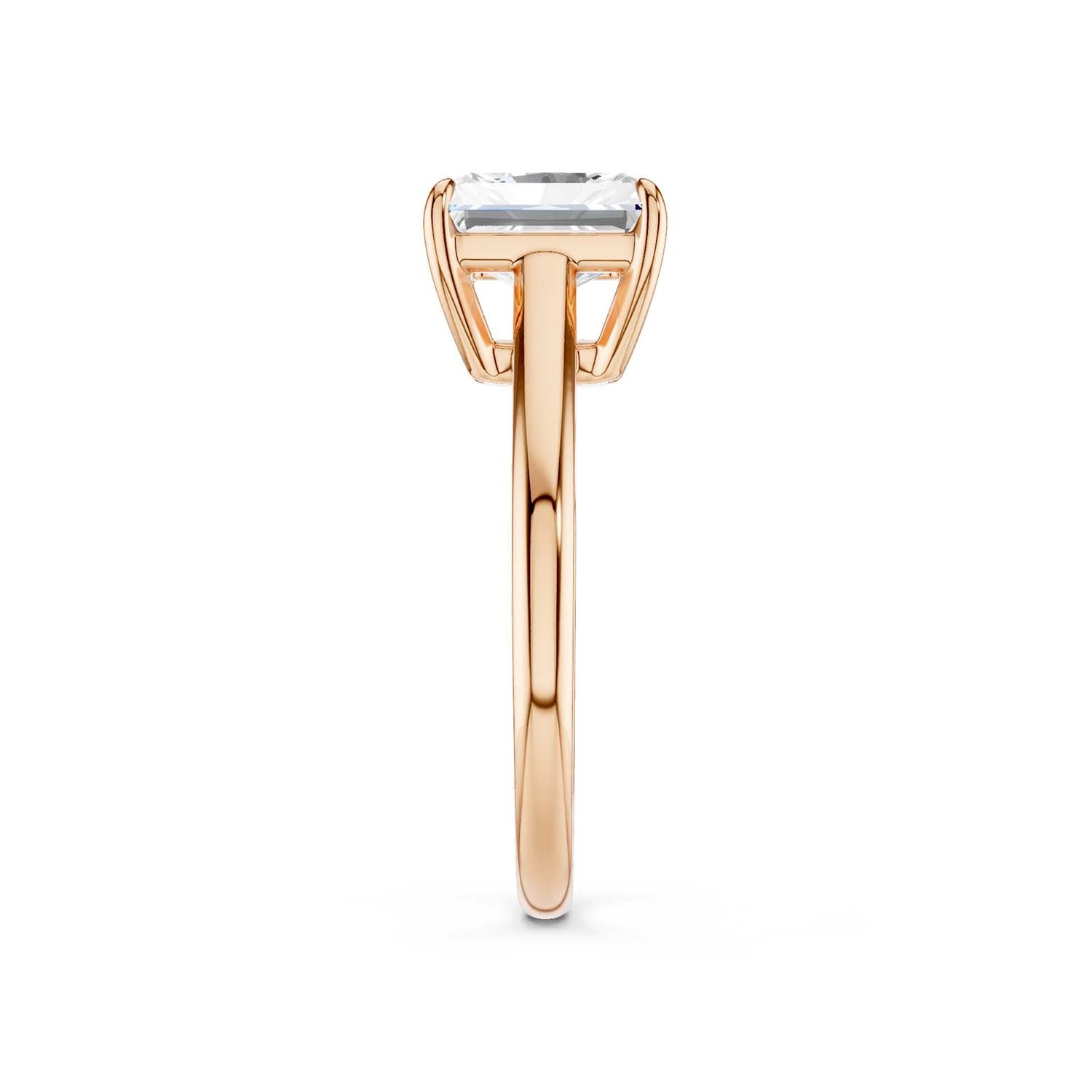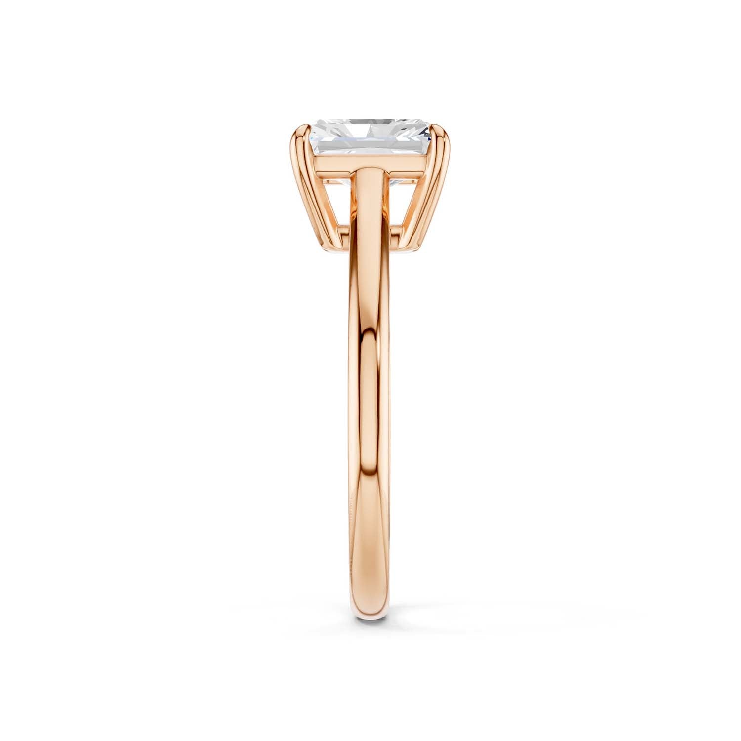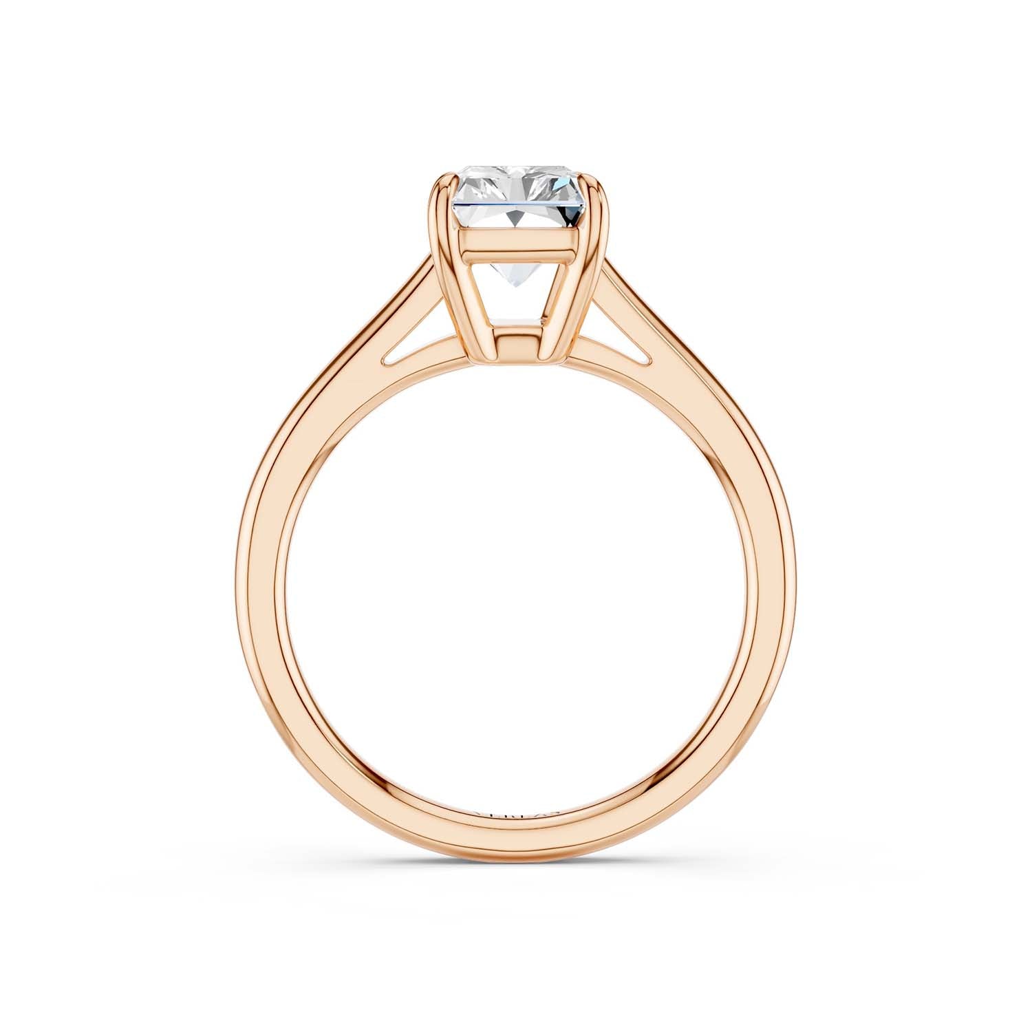 This elegant solitaire lab-grown diamond ring features an open basket with four claw prongs that cradle the center radiant-cut diamond. The lustrous gold band adds to the sleek, classic look of the design.