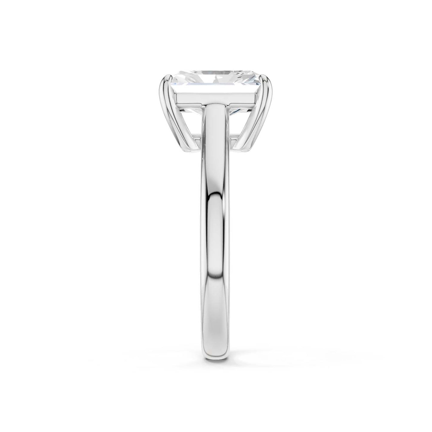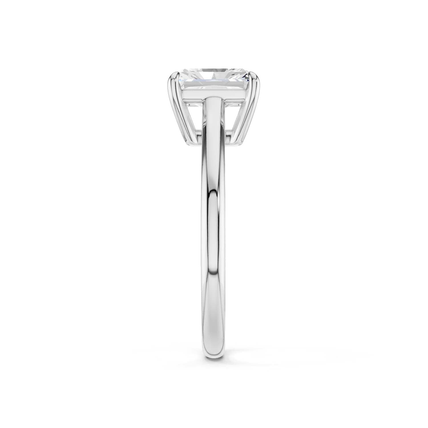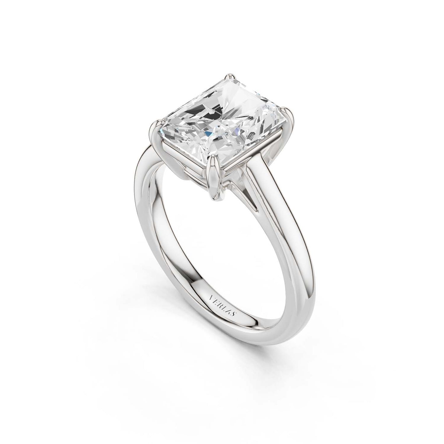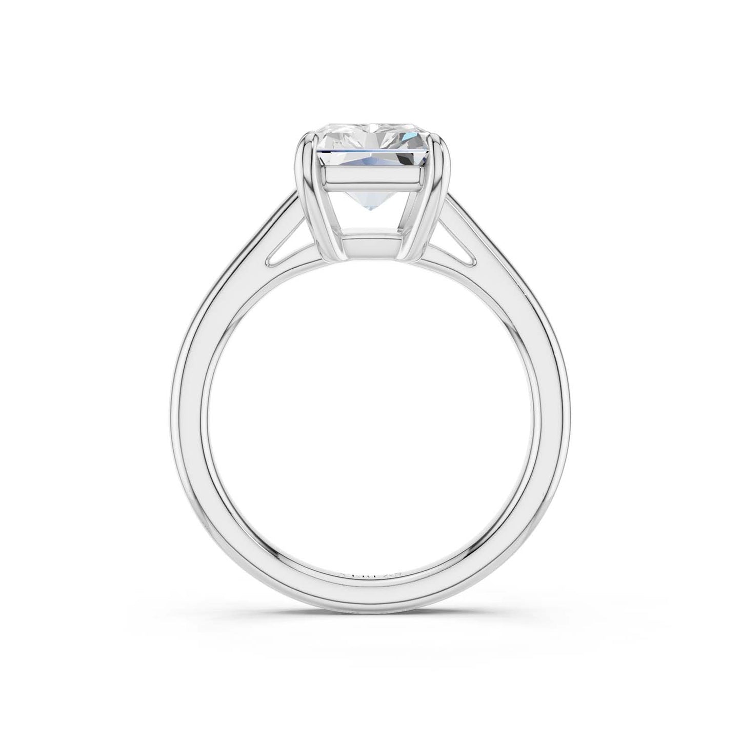 This elegant solitaire lab-grown diamond ring features an open basket with four claw prongs that cradle the center radiant-cut diamond. The lustrous gold band adds to the sleek, classic look of the design.