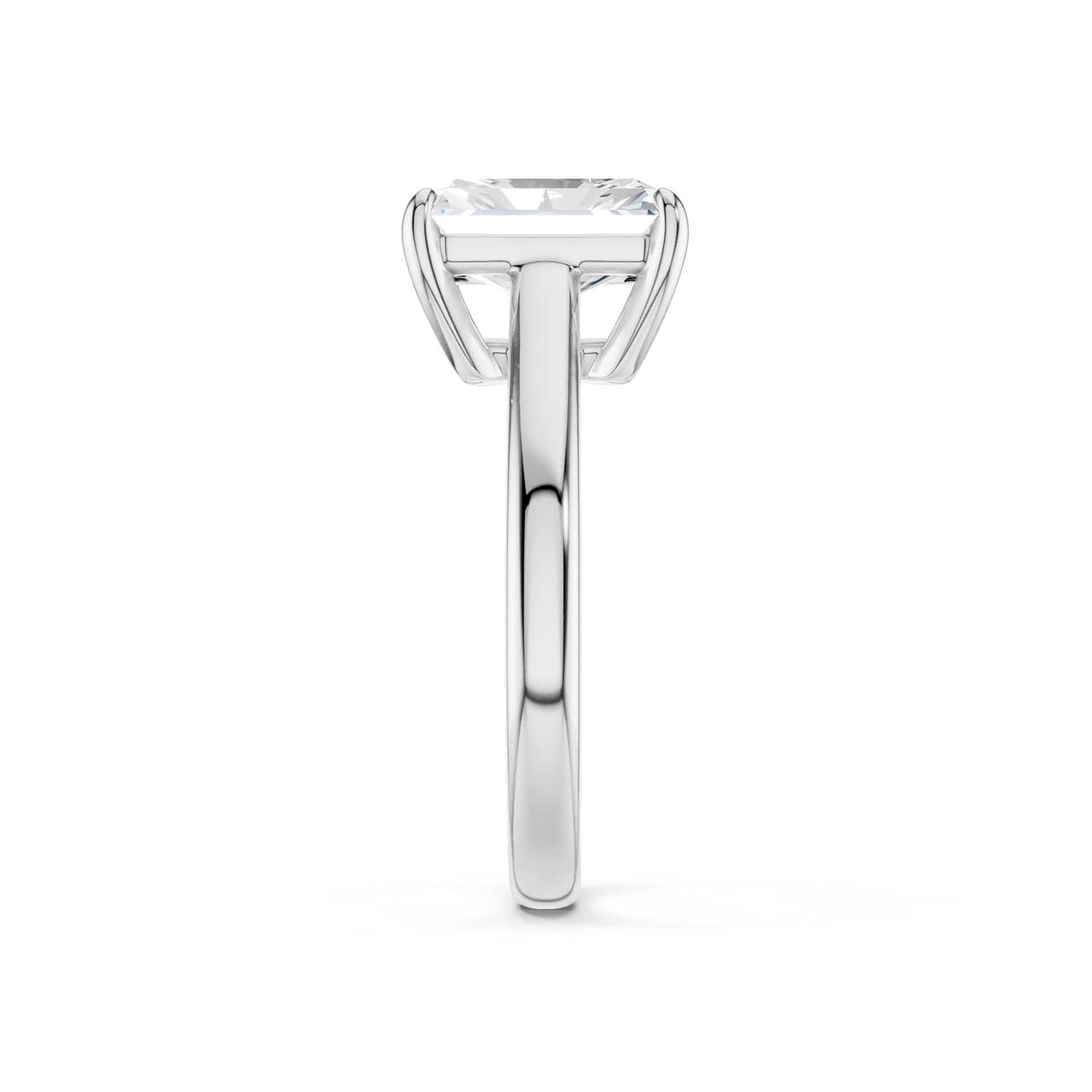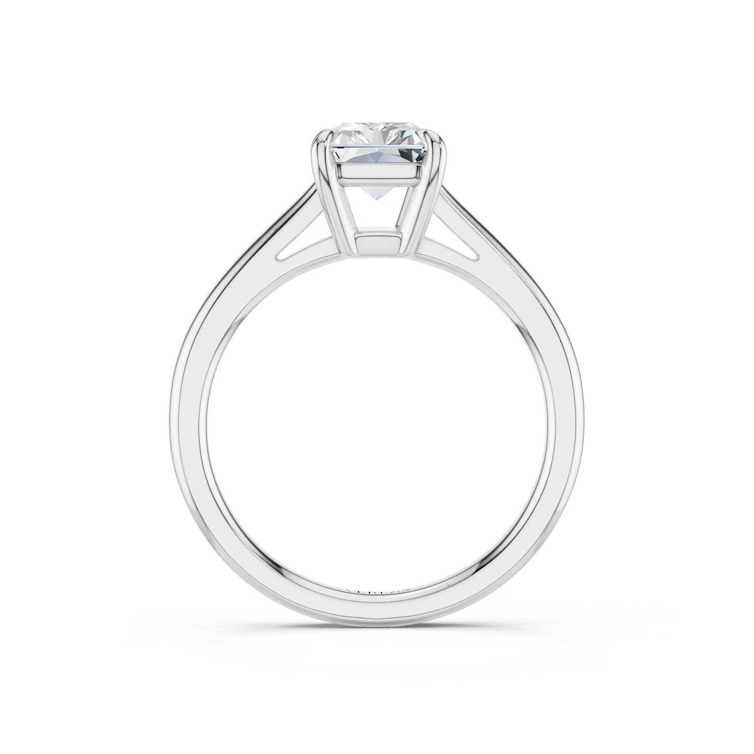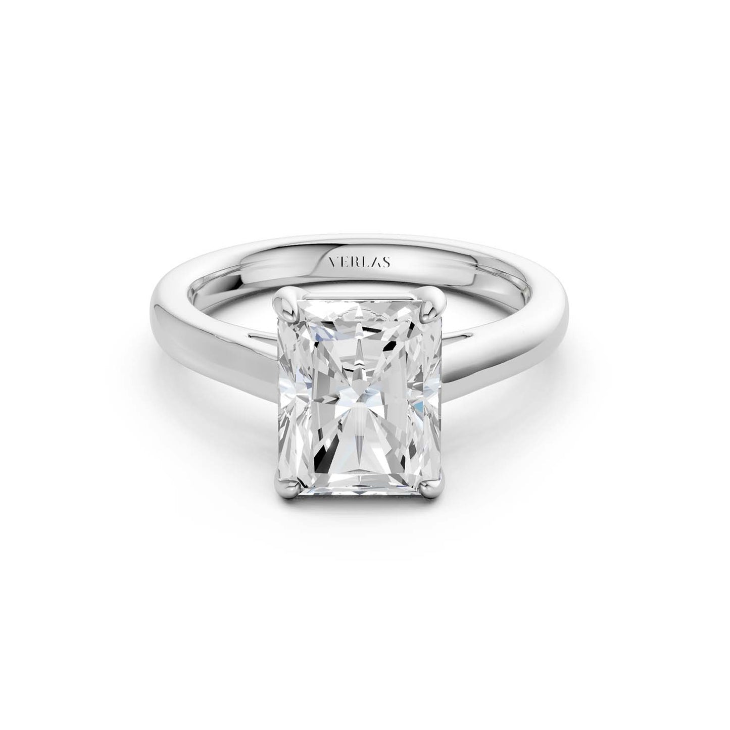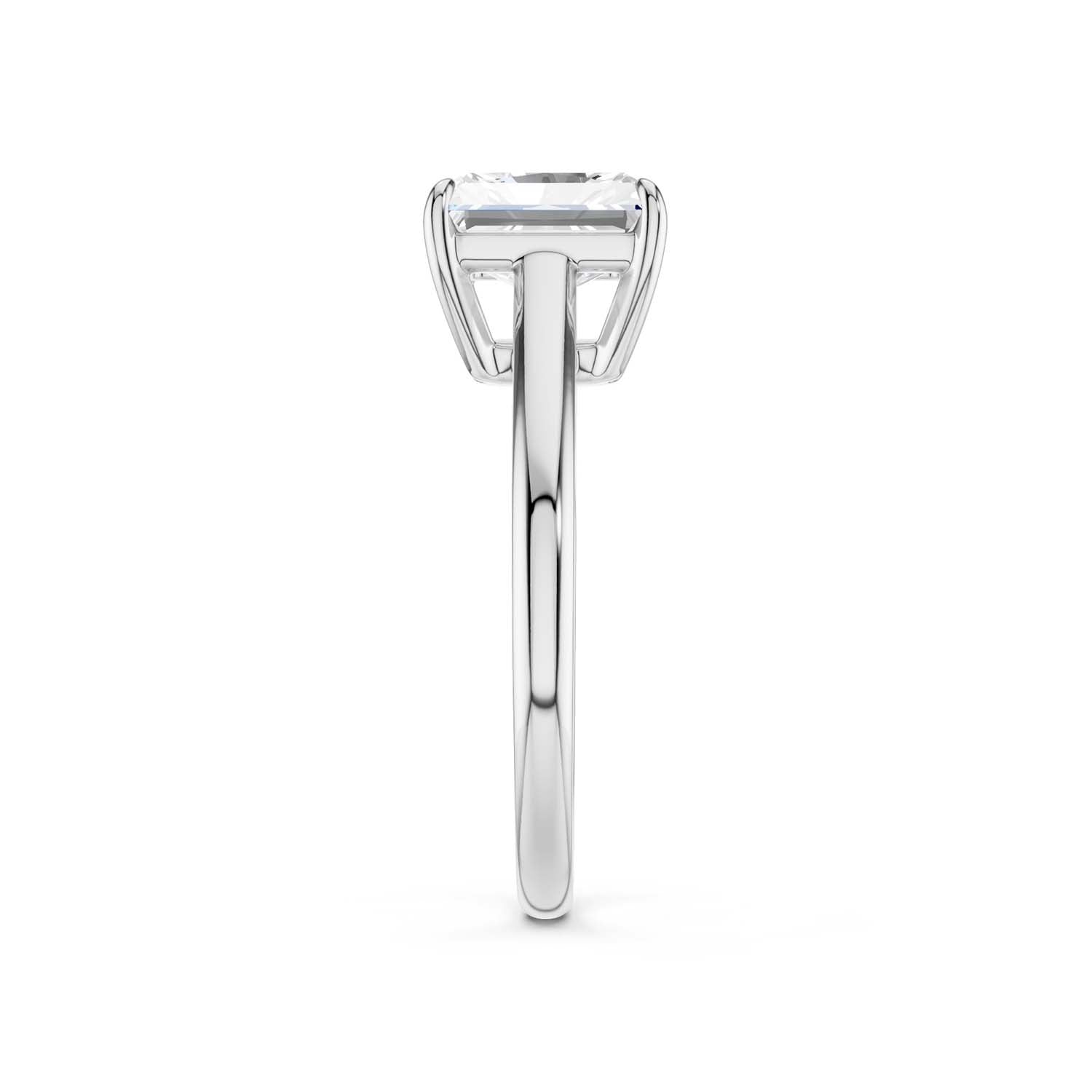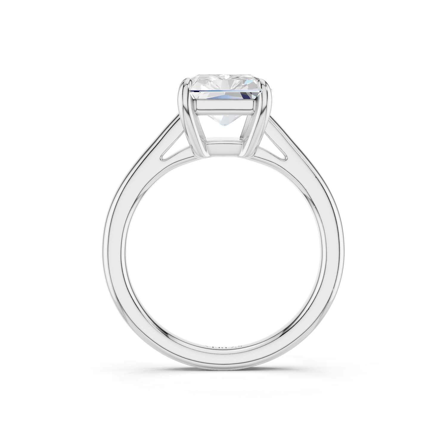 This elegant solitaire lab-grown diamond ring features an open basket with four claw prongs that cradle the center radiant-cut diamond. The lustrous gold band adds to the sleek, classic look of the design.