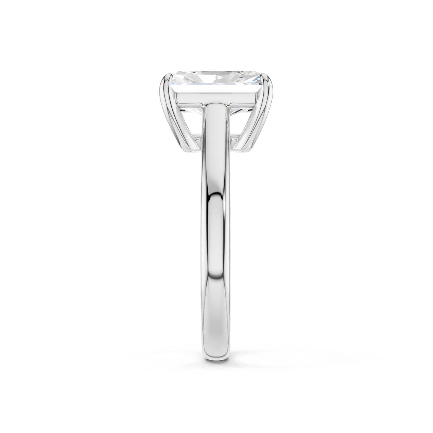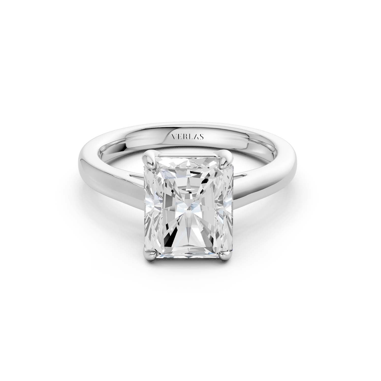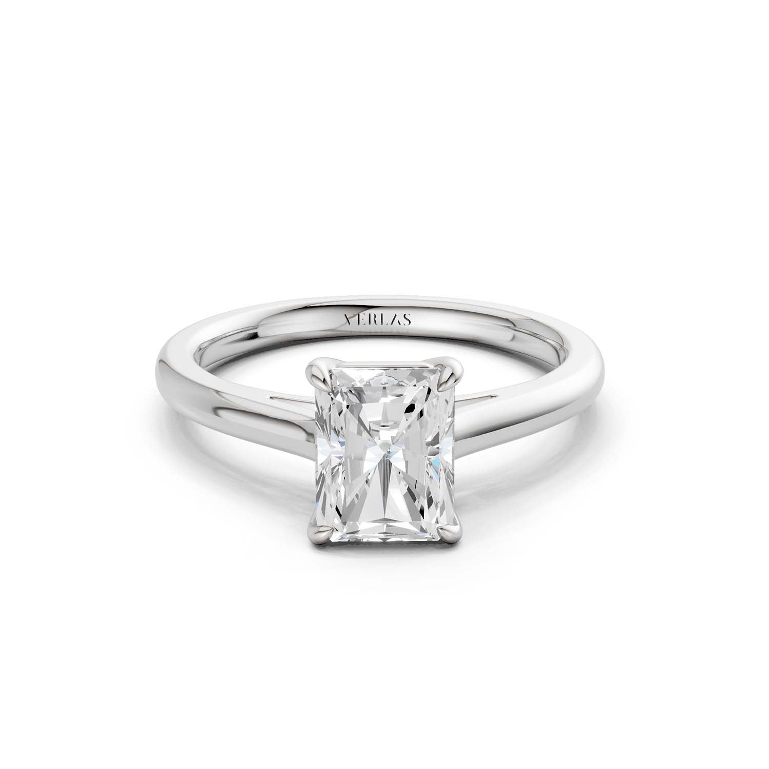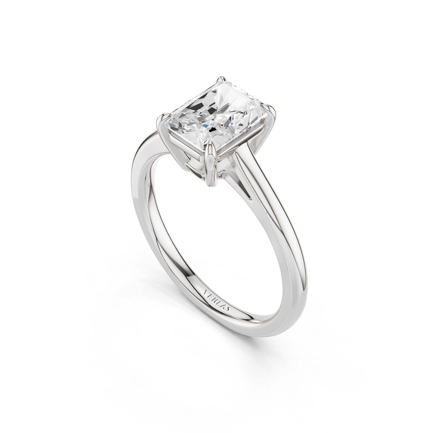 This elegant solitaire lab-grown diamond ring features an open basket with four claw prongs that cradle the center radiant-cut diamond. The lustrous gold band adds to the sleek, classic look of the design.