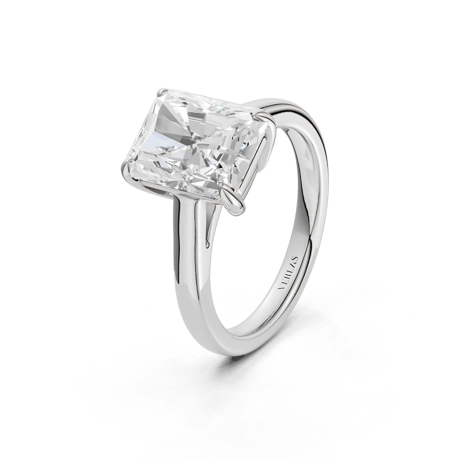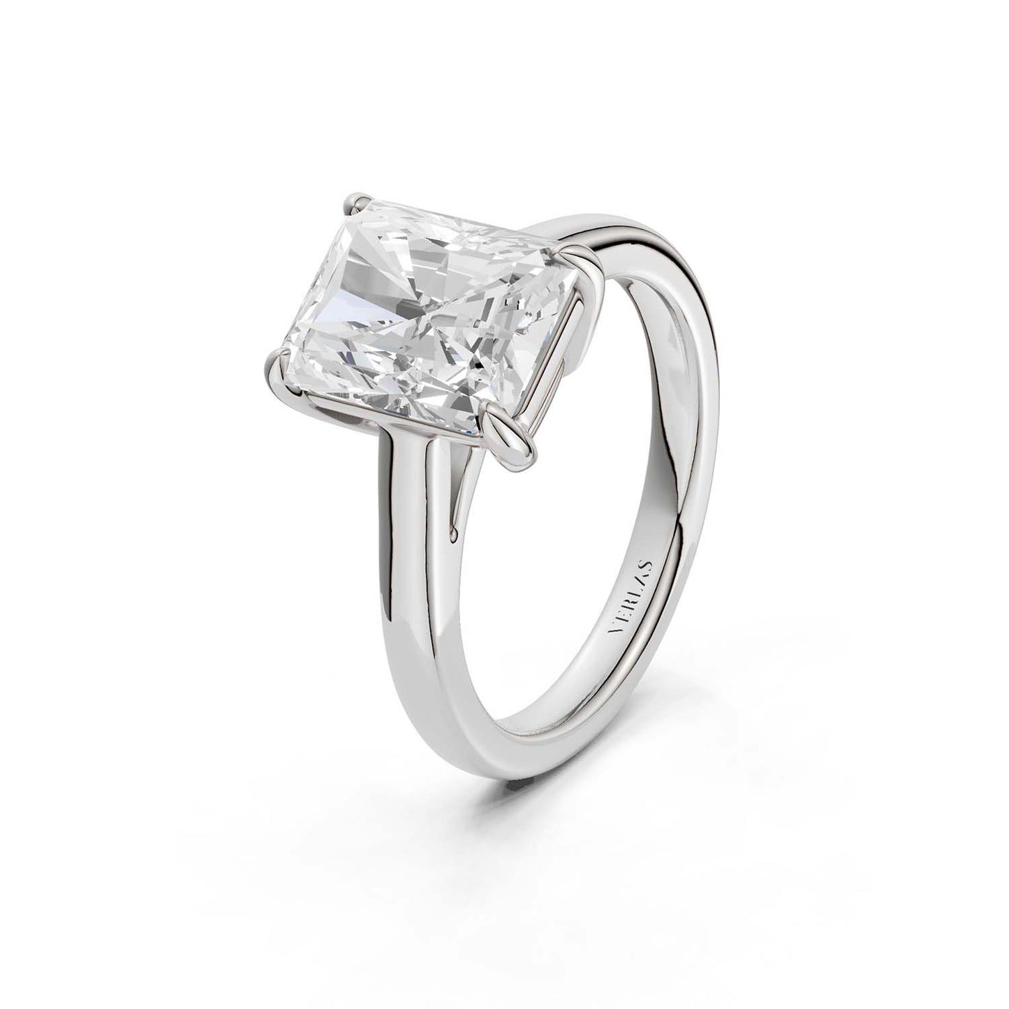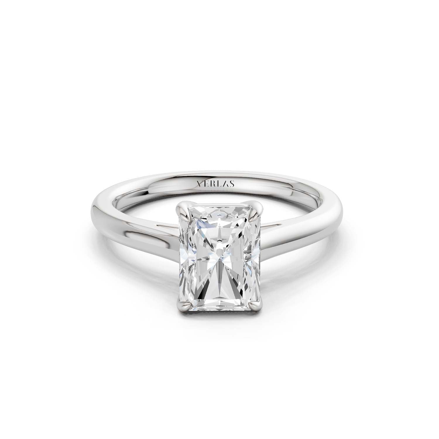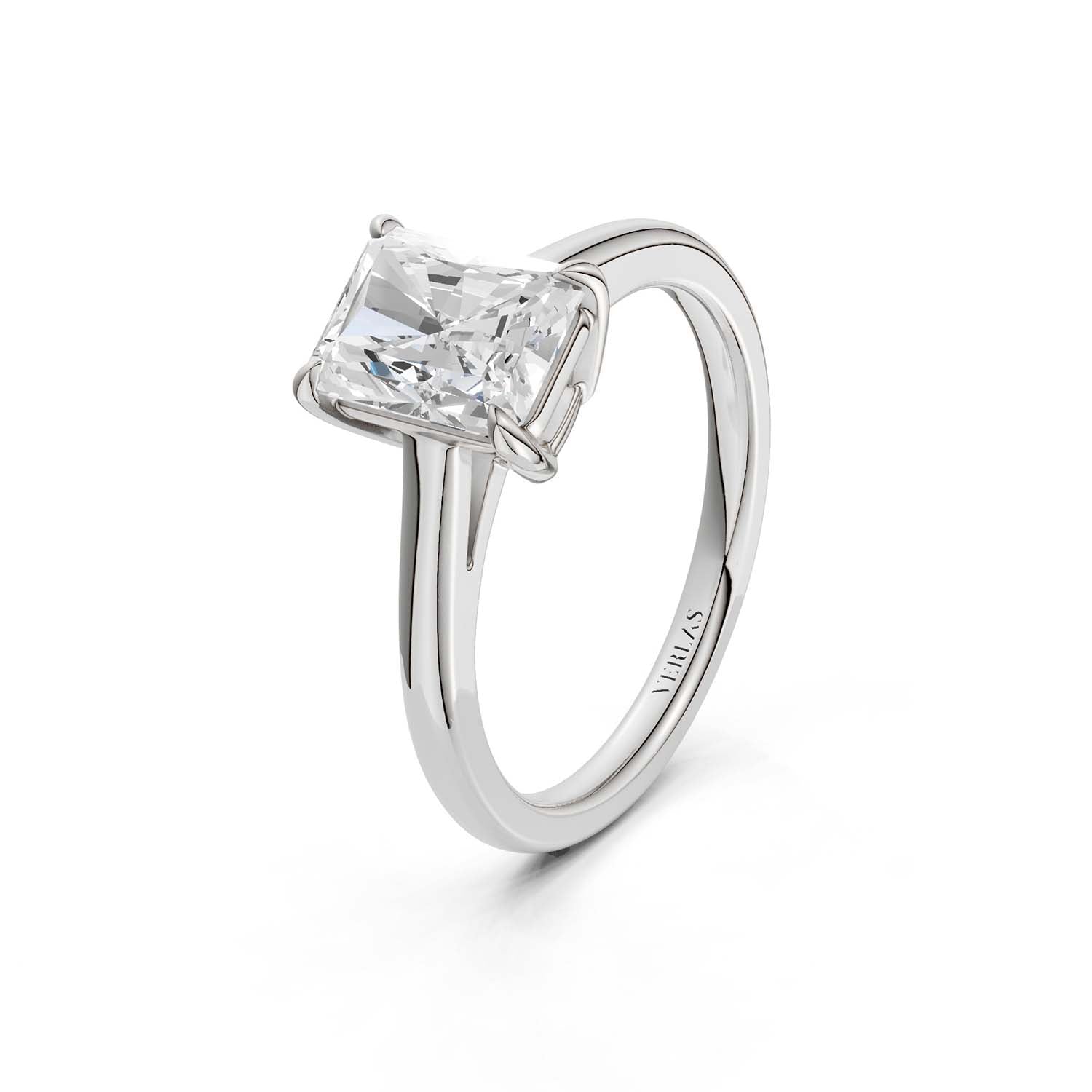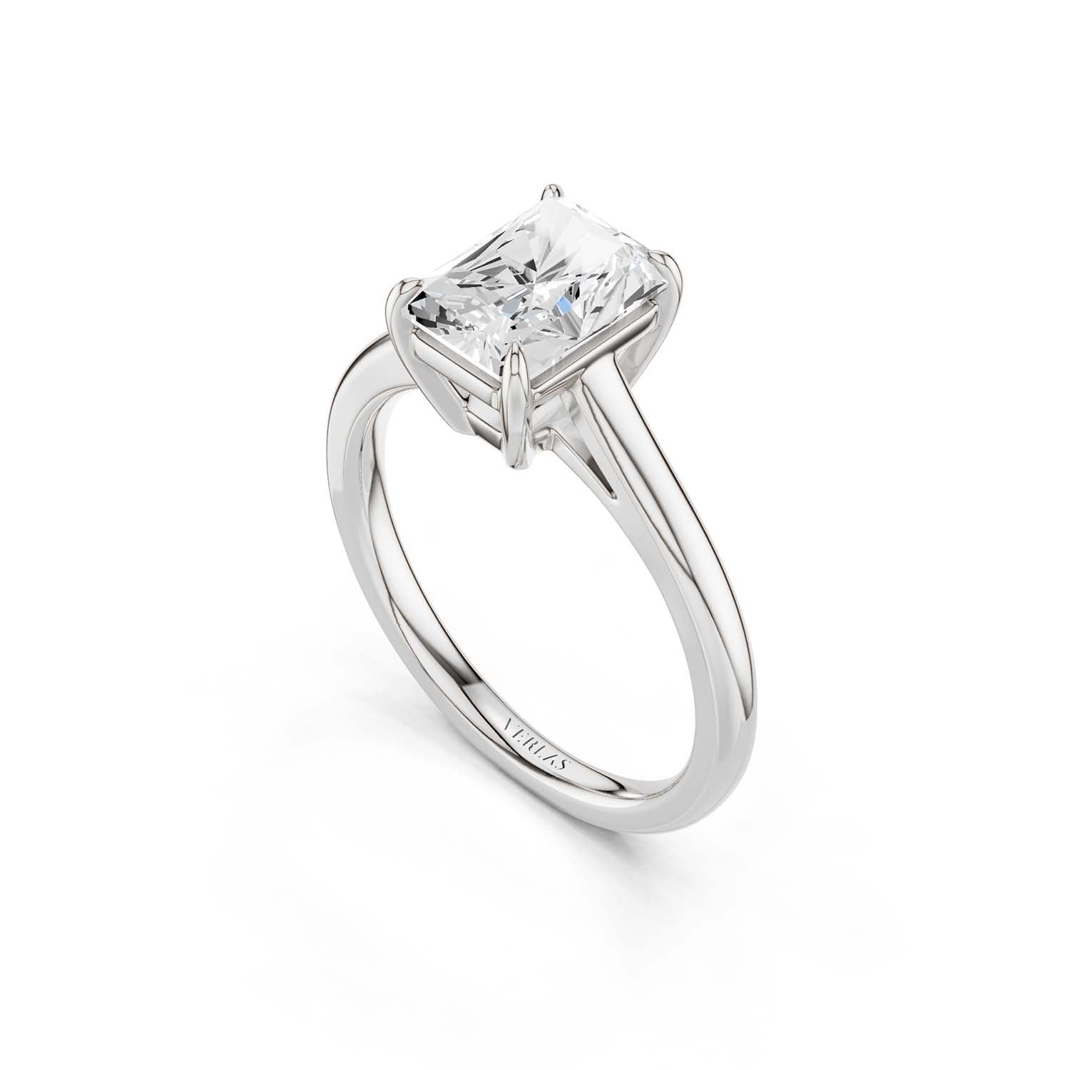 This elegant solitaire lab-grown diamond ring features an open basket with four claw prongs that cradle the center radiant-cut diamond. The lustrous gold band adds to the sleek, classic look of the design.
