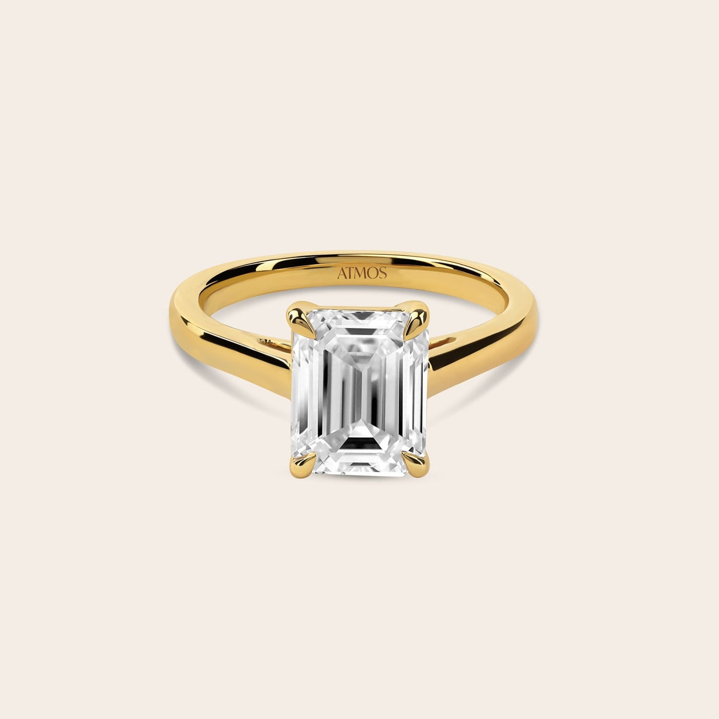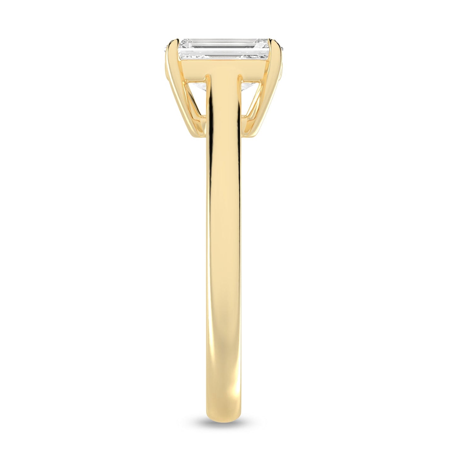 This elegant solitaire lab-grown diamond ring features an open basket with four claw prongs that cradle the center radiant-cut diamond. The lustrous gold band adds to the sleek, classic look of the design.
