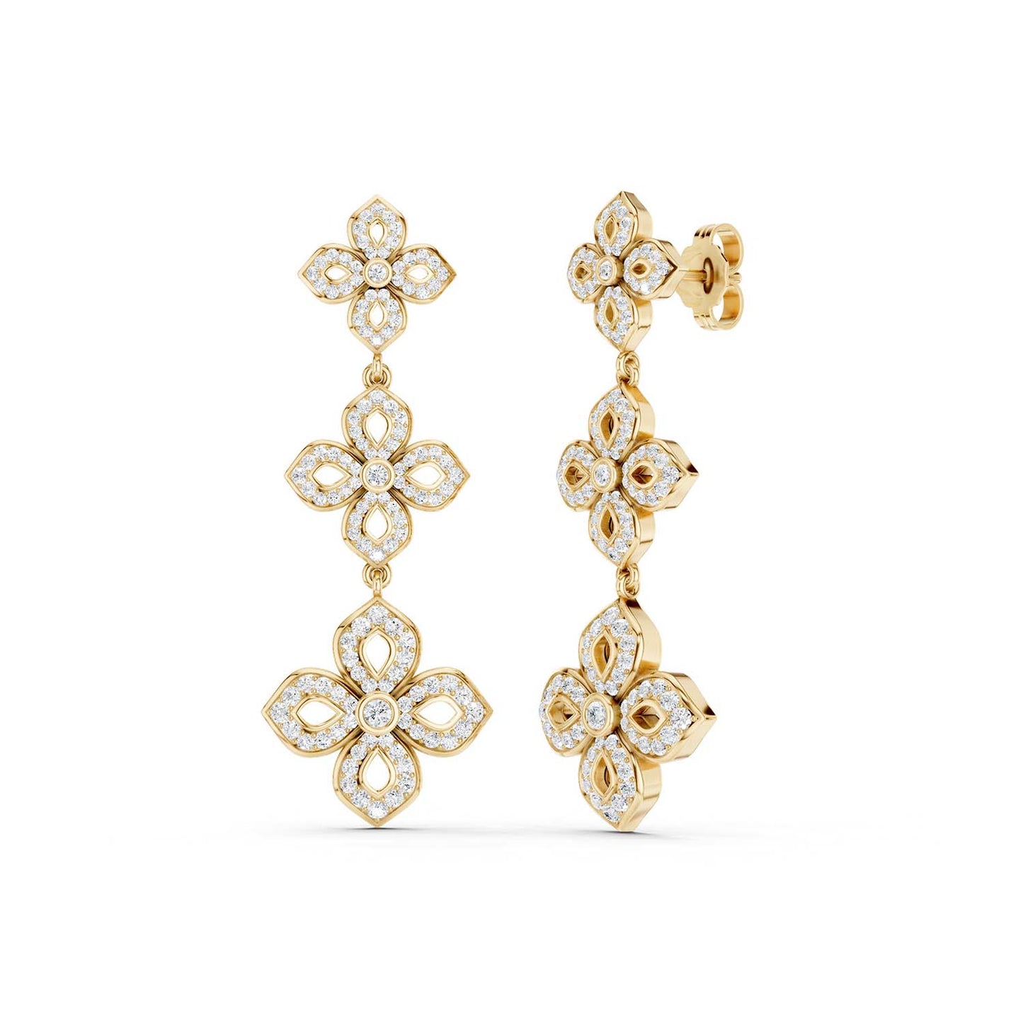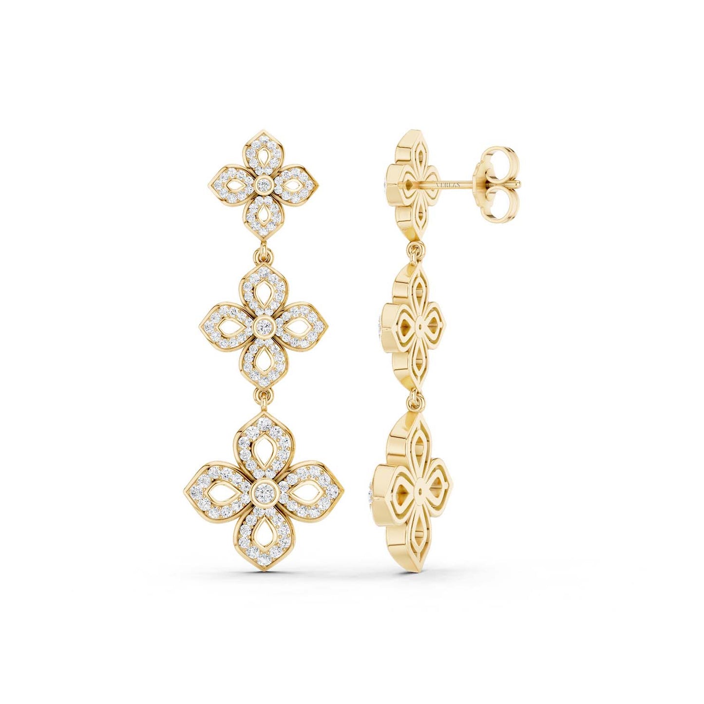 The La Fleur 2 Diamond Silhouette Drop Earrings are a harmonious blend of delicate floral motifs and the timeless allure of diamonds. Each earring features two intricate floral silhouettes brimming with brilliant-cut diamonds of exceptional quality. These diamond drop earrings are the perfect accessory for weddings, galas, anniversary celebrations, or any special moments in your life when you want to shine.