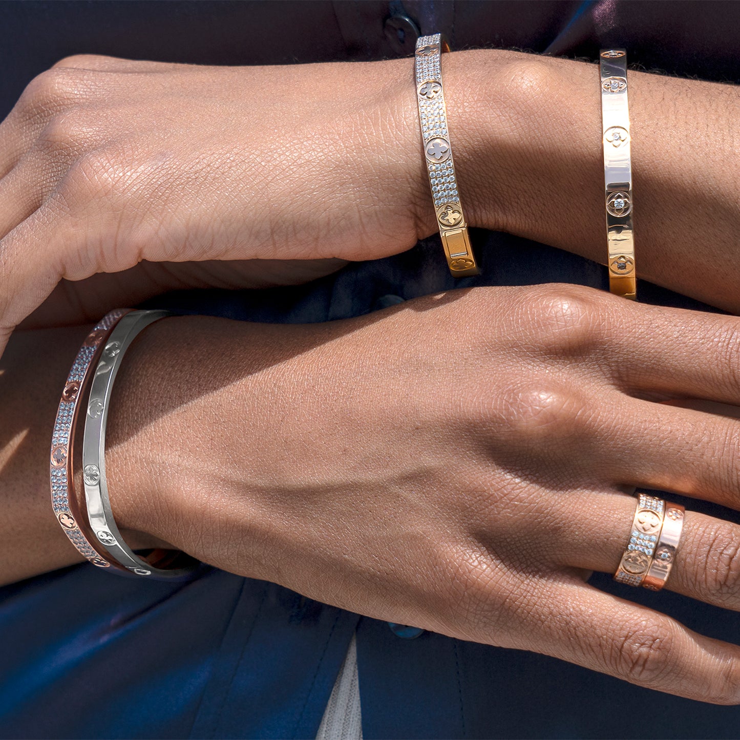Elevate your style with the La Fleur 3 Diamond Rows Square Bangle. This exquisite bangle features three rows of diamonds, creating an eye-catching design that radiates beauty. Crafted in solid gold with precision, this bangle exudes sophistication and elegance. The square shape adds a modern twist, making it a perfect accessory for any occasion.