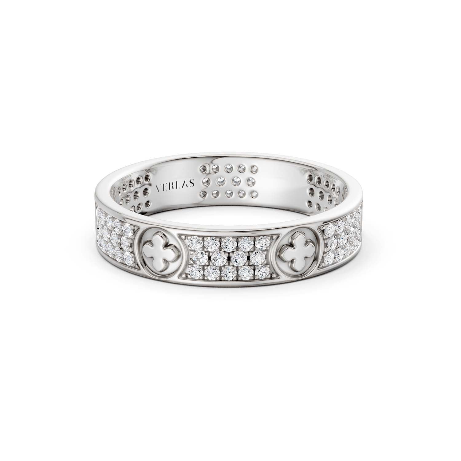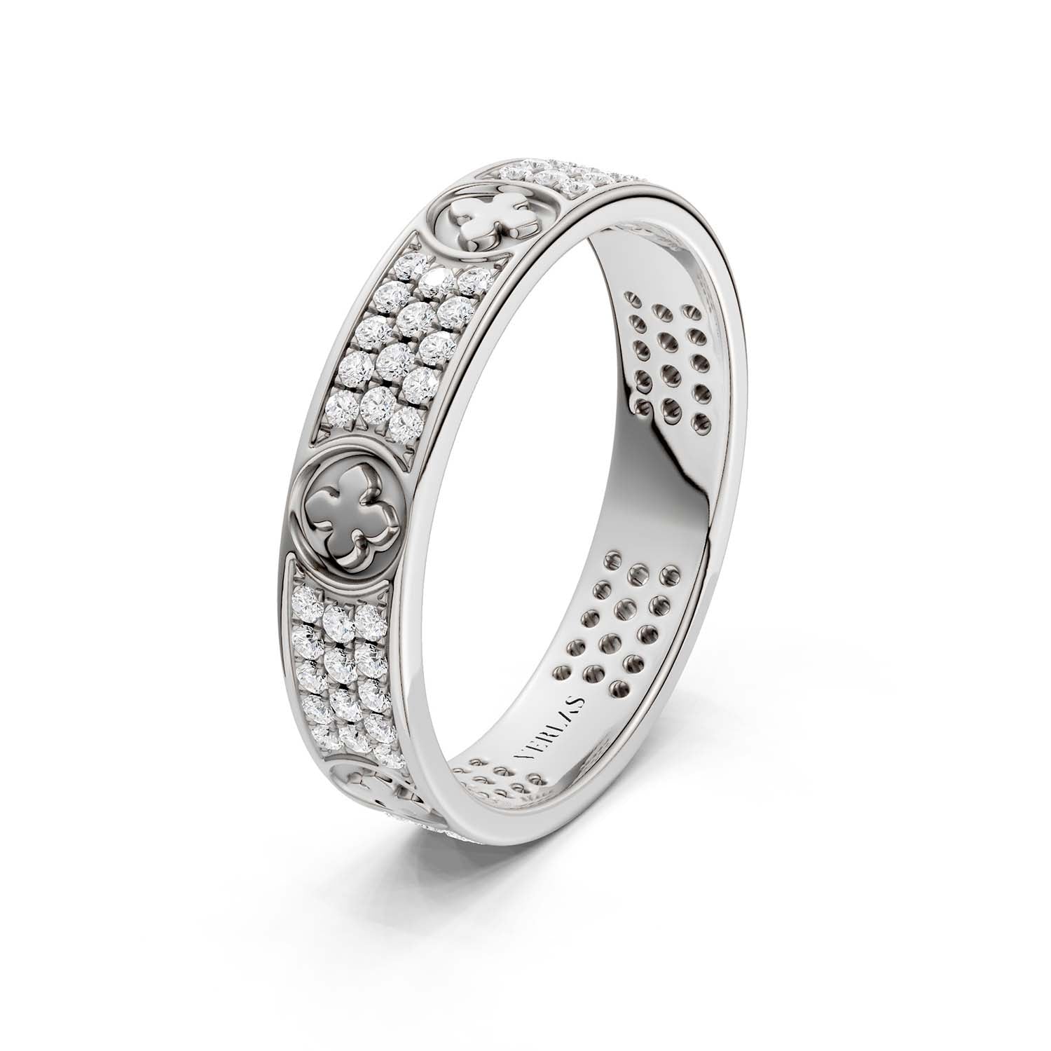 This La Fleur Round Band features four rows of dazzling diamonds, set in an alternating pattern to create a mesmerizing floral effect. This meticulous placement ensures that every angle of this band shines with an ethereal radiance. This captivating diamond wedding band is more than just a symbol of eternal love; it's a true work of art that will adorn your finger with unparalleled beauty.