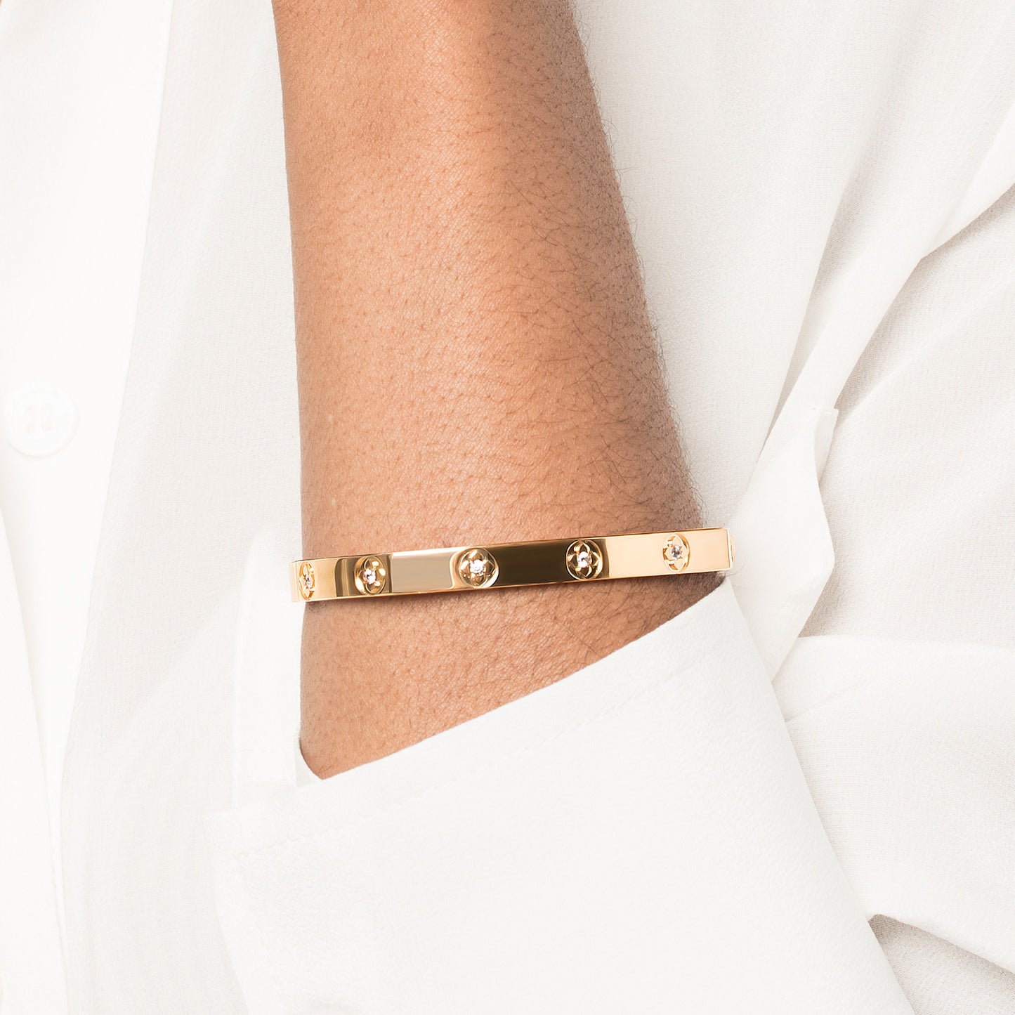 Show your love with this exquisite La Fleur 5mm 12-Diamonds Round Bangle. Made with solid gold and adorned with delicate diamonds, this bangle features a unique floral design that symbolizes eternal love. The perfect accessory for a modern look.