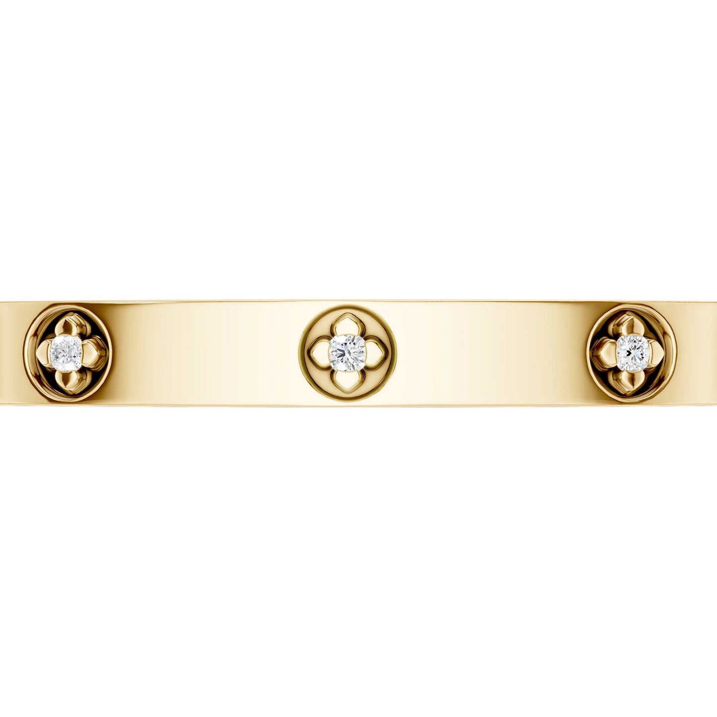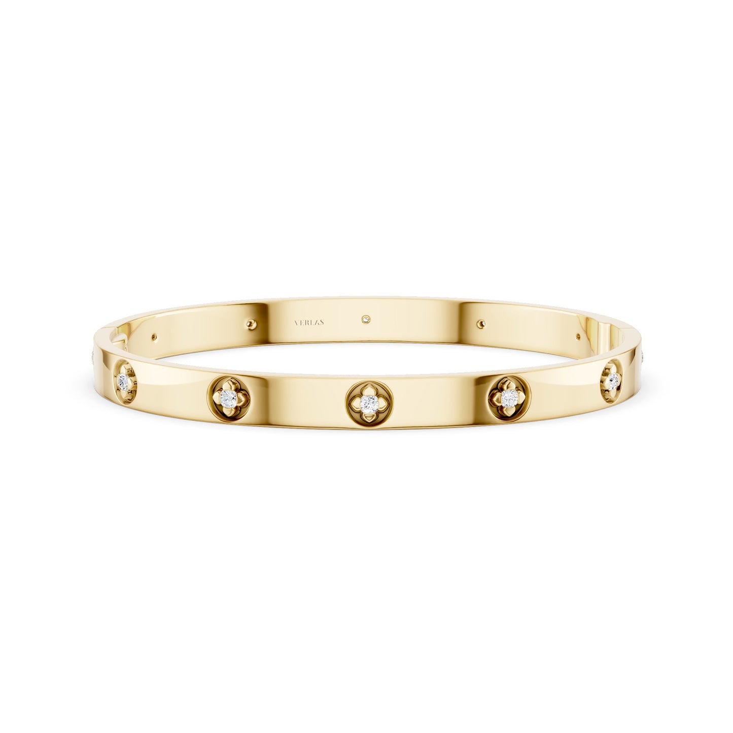 Show your love with this exquisite La Fleur 5mm 12-Diamonds Round Bangle. Made with solid gold and adorned with delicate diamonds, this bangle features a unique floral design that symbolizes eternal love. The perfect accessory for a modern look.