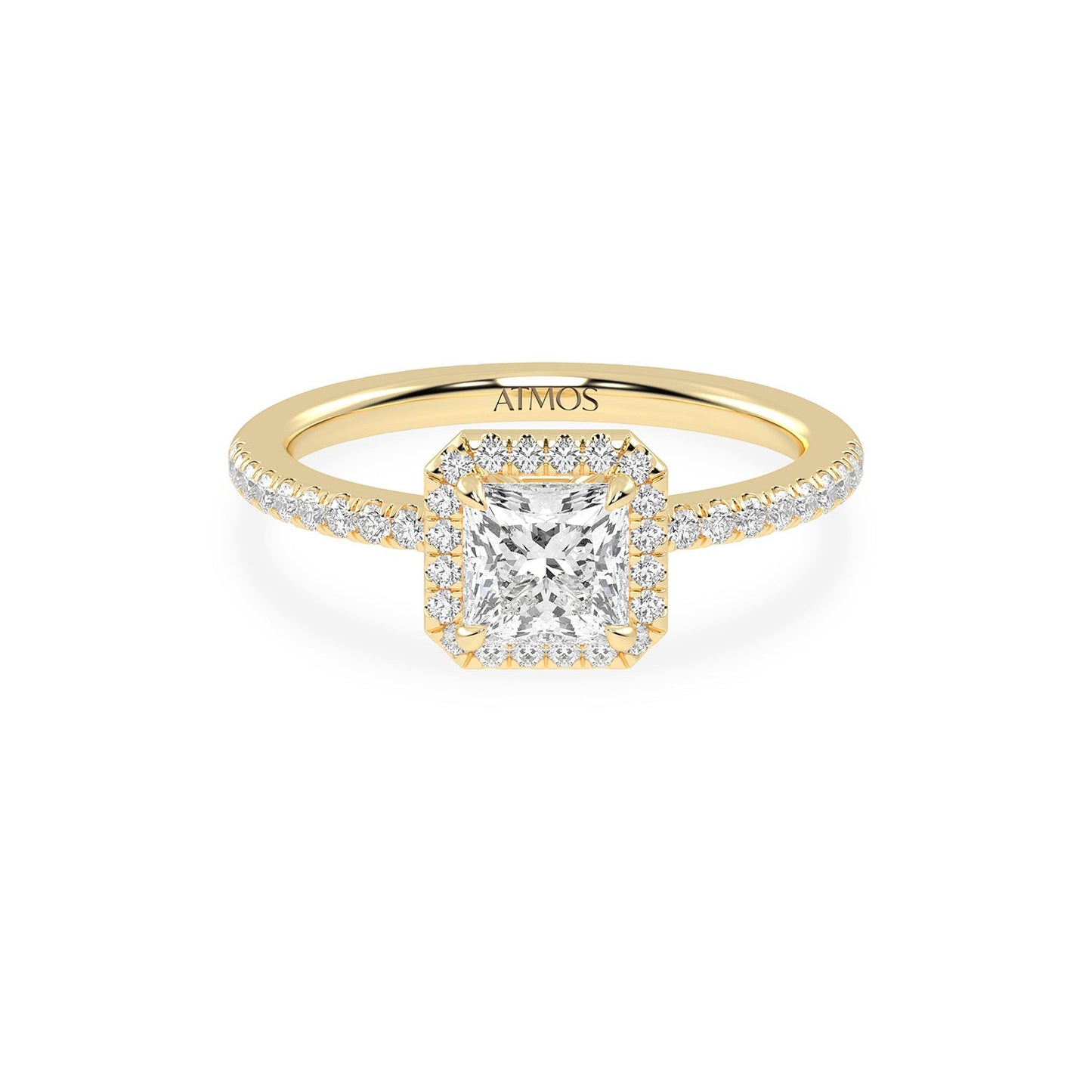 Elegant and classic, this lab-grown diamond engagement ring feature a bright, brilliant princess-shaped diamond at the center surrounded by a fiery halo of petite shimmering diamonds. This detailed halo ring is set in a lustrous solid gold band, perfect for a befitting look.
