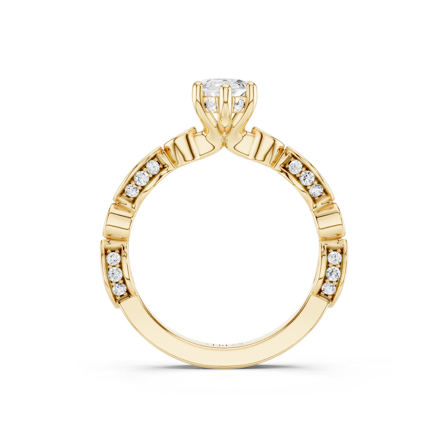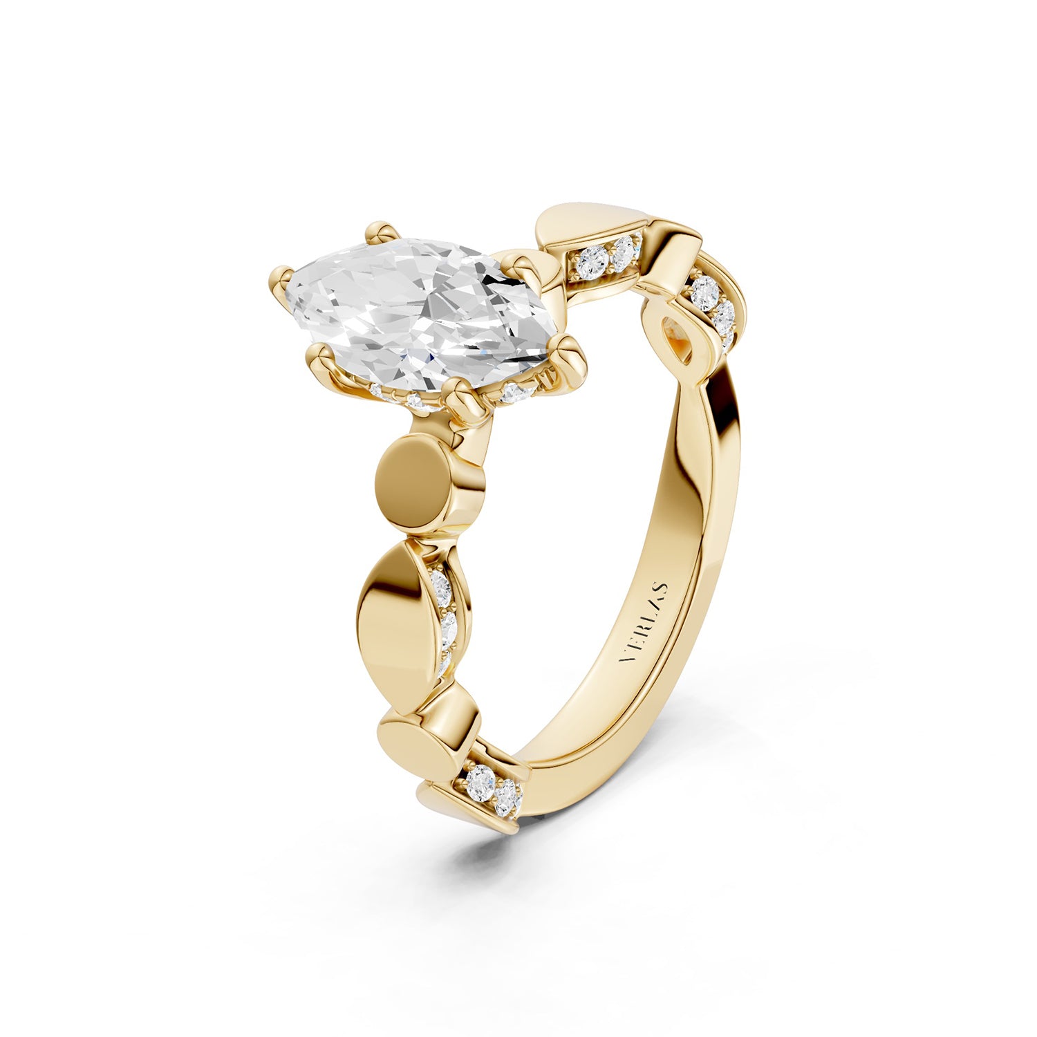 This marquise-cut lab-grown diamond ring features a hidden halo for extra radiance. The band is crafted with alternating marquise and round gold motifs, some polished and others diamond-set, creating a striking blend of texture and sparkle. Hidden diamond details beneath the prongs add a secret touch of brilliance from every angle.
